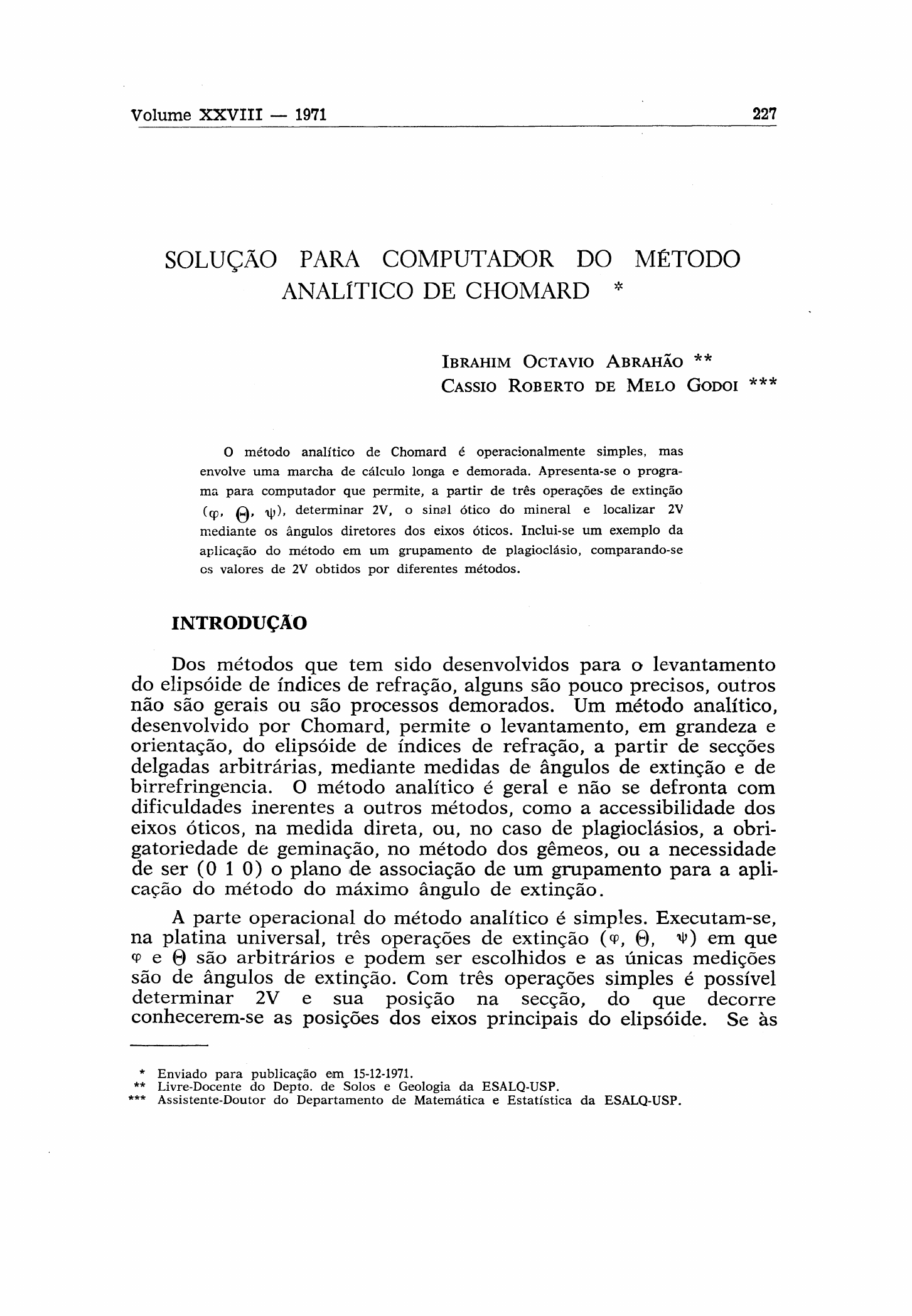 SOLUÇÃO PARA COMPUTADOR DO MÉTODO ANALÍTICO DE CHOMARD * Ibrahim Octavio Abrahão ** Cassio Roberto de Melo Godoi *** O método analítico de Chomard é operacionalmente simples, mas envolve uma marcha de cálculo longa e demorada. Apresenta-se o progra ma para computador que permite, a partir de três operações de extinção (φ, Θ, ψ), determinar 2V, o sinal ótico do mineral e localizar 2V mediante os ângulos diretores dos eixos óticos. Inclui-se um exemplo da aplicação do método em um grupamento de plagioclásio, comparando-se os valores de 2V obtidos por diferentes métodos. INTRODUÇÃO Dos métodos que tem sido desenvolvidos para o levantamento do elipsóide de índices de refração, alguns são pouco precisos, outros não são gerais ou são processos demorados. Um método analítico, desenvolvido por Chomard, permite o levantamento, em grandeza e orientação, do elipsóide de índices de refração, a partir de secções delgadas arbitrárias, mediante medidas de ângulos de extinção e de birrefringencia. O método analítico é geral e não se defronta com dificuldades inerentes a outros métodos, como a accessibilidade dos eixos óticos, na medida direta, ou, no caso de plagioclásios, a obri gatoriedade de geminação, no método dos gêmeos, ou a necessidade de ser (0 1 0) o plano de associação de um grupamento para a apli cação do método do máximo ângulo de extinção. A parte operacional do método analítico é simples. Executam-se, na platina universal, três operações de extinção (<P, 0, em que <p e 0 são arbitrários e podem ser escolhidos e as únicas medições são de ângulos de extinção. Com três operações simples é possível determinar 2V e sua posição na secção, do que decorre conhecerem-se as posições dos eixos principais do elipsóide. Se às * Enviado para publicação em 15-12-1971. ** Livre-Docente do Depto. de Solos e Geologia da ESALQ-USP. *** Assistente-Doutor do Departamento de Matemática e Estatística da ESALQ-USP. operações de extinção associam-se medidas de birrefringência, todo o elipsóide pode ser conhecido, em orientação e grandeza. Enfim, em uma secção arbitrária, três operações, ( < p , 0, ty, r ) , em que <p, 0 e ^ são rotações de Euler e r é a birrefringência, permitem o levantamento total do elipsóide. O método analítico, se por um lado implica em uma parte ope racional simples, por outro exige uma marcha de cálculo, estabelecida pela teoria do método, que é longa e demorada, mesmo com o auxílio de máquinas eletromecânicas. Essa dificuldade, que limitaria o em prego do método na prática, é resolvida por meio de um programa para computador eletrônico. O objetivo do presente trabalho é apresentar o programa que leva à determinação de 2V, dos ângulos diretores dos eixos óticos e de CO; cujo sinal, associado ao da birrefringência, determina o ca ráter ótico do mineral. Os dados de entrada são três operações de extinção ( < p , 0, i!>), em que <p e 0 são escolhidos e **P medido no mi croscópio polarizante. REVISÃO DA LITERATURA CHOMARD (1934) apresentou a teoria do método analítico, de- senvolvendo-a, primeiramente, para o caso mais geral, em que a lâmi na é tomada em posição arbitrária no microscópio, e em seguida, para a simplificação que resulta da escolha apropriada da posição inicial da lâmina. O autor estuda, de um ponto de vista teórico, o levanta mento do elipsóide, em orientação e grandeza, bem como os erros que podem ser cometidos na aplicação do método; aplicando-o, à guisa de exemplo, para ortoclase, quartzo, moscovita e gipsita. ABRAHÃO (1968) aplicou o método analítico a plagioclásios, de terminando a orientação do elipsóide e comparando os resultados obtidos para 2 V com os fornecidos pelos métodos da medida direta, dos gêmeos e do máximo ângulo de extinção na zona perpendicular a (0 1 0 ) . Através de programa para computador eletrônico, eliminou as dificuldades inerentes à marcha de cálculo do método. O trabalho experimental consistiu na execução de 768 operações de extinção (<P, ti, ^ ) , feitas com 27 indivíduos, pertencentes a 14 grupamentos, envol vendo cerca de 8.000 medições de ângulos de extinção. Apresentou 598 resultados de cálculos de 2 V e ângulos diretores dos eixos óticos, com diferentes operações de extinção. A análise dos resultados per mitiu concluir que, para esse grupe de minerais, operações envolvendo ângulos <P múltiplos de 90° devem ser evitadas e que resultados muito seguros são conseguidos quando se utilizam múltiplos de 45° para «P, especialmente para 0 = 30°. ABRAHÂO (1971) apresenta um estudo mais completo da aplica ção do método analítico a plagioclásios, com operações de extinção envolvendo múltiplos de 90° para <p Os resultados confirmam as con clusões anteriores de que essas operações de extinção devem ser evi tadas para esse grupo de minerais. Programa de Resolução em Computadores Eletrônicos; Diagrama de Blocos Os dados de entrada são três operações de extinção (<P, 0, ty): Todos os dados são em graus e décimos de graus. A raiz da fun ção do terceiro grau foi obtida pelo método iterativo de partição do intervalo pela troca de sinal da função (método de Bolzano). O diagrama de blocos apresentado resume os passos lógicos que qualquer computador deve seguir a fim de atingir o valor de 2 V : Bloco 1: constante de transformação de arcos em graus e déci mos de grau em radianos; Bloco 2 : entrada de dados; Bloco 3: formação da matriz de 3 x 4 ; Bloco 4 : resolução dos quatro determinantes de terceira ordem; Bloco 5 ao bloco 12: cálculo da raiz pelo método de Bolzano; Bloco 13 ao bloco 16: cálculo de 2 V ; Bloco 17 e bloco 18: impressão dos ângulos diretores e ângulo 2 V. Exemplo: Apresenta-se, a seguir, exemplo da aplicação do méto do analítico a um grupamento de plagioclásios (lei da* albita,