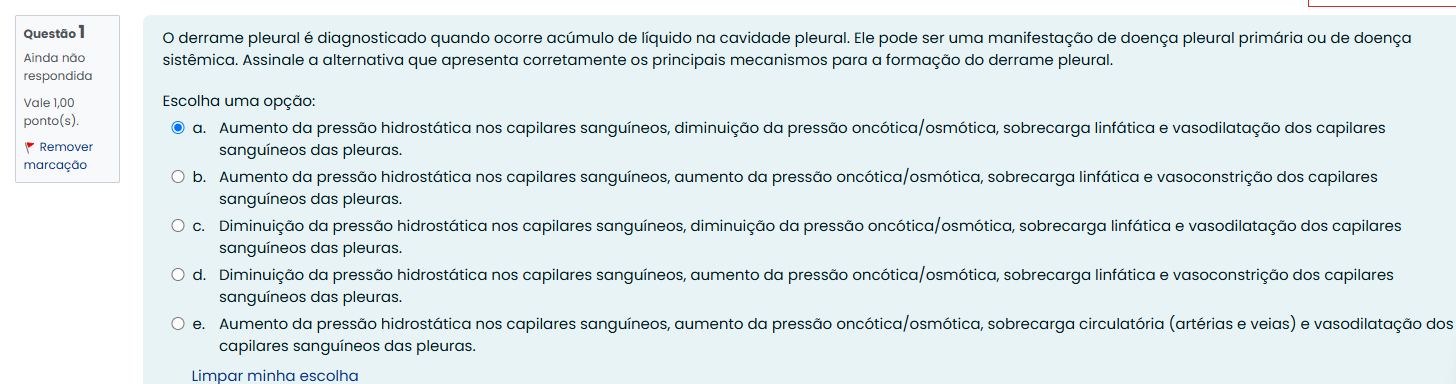 Questão 1 derrame pleural é diagnosticado quando ocorre acúmulo de líquido na cavidade pleural. Ele pode ser uma manifestação de doença pleural primária ou de doença Ainda não sistêmica. Assinale a alternativa que apresenta corretamente principais mecanismos para a formação do derrame pleural. respondida Vale 1,00 Escolha uma opção: ponto(s). a. Aumento da pressão hidrostática nos capilares sanguíneos, diminuição da pressão oncótica/osmótica, sobrecarga linfática e vasodilatação dos capilares Remover sanguíneos das pleuras. marcação b. Aumento da pressão hidrostática nos capilares sanguíneos, aumento da pressão oncótica/osmótica, sobrecarga linfática e vasoconstrição dos capilares sanguíneos das pleuras. C. Diminuição da pressão hidrostática nos capilares sanguíneos, diminuição da pressão oncótica/osmótica, sobrecarga linfática e vasodilatação dos capilares sanguíneos das pleuras. d. Diminuição da pressão hidrostática nos capilares sanguíneos, aumento da pressão oncótica/osmótica, sobrecarga linfática e vasoconstrição dos capilares sanguíneos das pleuras. e. Aumento da pressão hidrostática nos capilares sanguíneos, aumento da pressão oncótica/osmótica, sobrecarga circulatória (artérias e veias) e vasodilatação dos capilares sanguíneos das pleuras. Limpar minha escolha