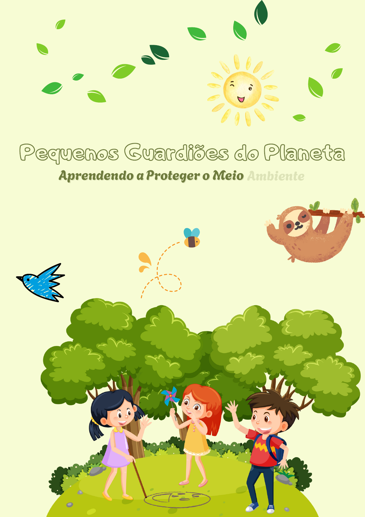 Pequenos Guardiões do PlanetaPequenos Guardiões do Planeta Aprendendo a Proteger o Meio AmbienteAprendendo a Proteger o Meio Ambiente Olá, jovens guardiões!Olá, jovens guardiões! Nesta cartilha, vamos aprender sobreNesta cartilha, vamos aprender sobre a importância de cuidar do nossoa importância de cuidar do nosso planeta.planeta. Você sabia que pequenas açõesVocê sabia que pequenas ações podem fazer uma grande diferença?podem fazer uma grande diferença? Vamos descobrir juntos comoVamos descobrir juntos como podemos ser amigos da natureza!podemos ser amigos da natureza! Você sabe o que é Sustentabilidade? Sustentabilidade é viver de forma queSustentabilidade é viver de forma que possamos cuidar do nosso planeta, garantindopossamos cuidar do nosso planeta, garantindo que as gerações futuras também tenham umque as gerações futuras também tenham um lugar saudável para viver. Isso envolve usar oslugar saudável para viver. Isso envolve usar os recursos naturais de maneira responsávelrecursos naturais de maneira responsável E o que fazer para praticar a Sustentabilidade? Use Sacolas Reutilizáveis Ao ir às compras com seus pais ou responsáveis, leve uma sacola de tecido ou bolsa reutilizável. Assim, você ajuda a reduzir o uso de sacolas plásticas! Desligue a Luz Sempre que sair de um cômodo, apague a luz. Isso ajuda a economizar energia e é uma forma simples de do planeta. Beba Água com Consciência Peça uma garrafa reutilizável para levar água na escola. Assim, você evita usar copos descartáveis e ainda se mantém hidratado! Plante uma Árvore Converse com seus pais sobre plantar uma árvore ou cuidar de uma plantinha em casa. As plantas purificam o ar e ajudam a natureza. Cuidado com os Animais Nunca jogue lixo nas ruas ou na natureza. Pense nos animais que podem engasgar ou ficar doentes por causa do lixo que deixamos por aí. Você sabe o que é educação ambiental? É uma forma especial de aprender a cuidar da natureza. Ela nos ensina que o nosso planeta é como uma grande casa cheia de plantas, animais e pessoas, e que precisamos cuidar dele para mantê-lo bonito e saudável. Ao aprender sobre educação ambiental, entendemos como tudo na natureza está conectado. As árvores, os rios, os animais e nós temos papéis importantes. Também aprendemos a usar os recursos da Terra de maneira responsável, como reciclar papel e plástico para reduzir o lixo. Além disso, a educação ambiental nos ajuda a cuidar dos seres vivos e a proteger as espécies que estão em perigo. Ao fazermos pequenas ações, como economizar água ao escovar os dentes, estamos ajudando o planeta. Assim, a educação ambiental é sobre aprender, agir e inspirar outras pessoas a fazerem o mesmo. Quando descobrimos coisas novas sobre a natureza ou praticamos ações que ajudam o meio ambiente, estamos colocando a educação ambiental em prática e protegendo nosso lindo planeta! O que é e por que é importante a conservação da vida silvestre? Conservar a vida silvestre significa proteger os animais e plantas que vivem na natureza. Eles são fundamentais para o equilíbrio do ecossistema e ajudam a manter o meio ambiente saudável. Você sabia que nosso planeta é cheio de criaturas incríveis, como tartarugas, pássaros coloridos, elefantes e muitas outras? Essas são as maravilhas da vida silvestre, e cuidar delas é muito importante! Cada animal e planta têm um papel especial na natureza. Por exemplo, as abelhas ajudam as flores a crescer, enquanto as árvores nos dão ar puro para respirar. Se não protegermos esses seres vivos, tudo na natureza pode ficar desequilibrado. Outra razão importante é que muitos remédios que usamos vêm de plantas e animais. Se perdermos essas espécies, podemos acabar perdendo também opções de cura para doenças. Então, cuidar da natureza é também cuidar da nossa saúde! Quando protegemos os animais e as plantas, estamos ajudando a deixar o mundo mais saudável para as futuras gerações. Todos nós podemos falar sobre a importância de cuidar da natureza, fazer passeios para observar os animais e participar de atividades que ajudem a proteger o meio ambiente. Então, lembre-se: cuidar da vida silvestre é cuidar do nosso planeta e de tudo que nele vive. Vamos juntos fazer da Terra um lugar melhor para nós e para as criaturas que compartilham este lar especial! Você sabia que o Brasil abriga mais de 700 espécies ameaçadas de extinção? Entre elas, estão o mico-leão-dourado e a arara-azul. Proteger esses animais é essencial para preservar a biodiversidade do nosso país! Alguns animais estão em risco de extinção porque seu lar, que é a natureza, está sendo destruído. Isso pode acontecer por causa do desmatamento, da poluição, da caça... Quando os habitats dos animais são danificados, eles têm dificuldade para encontrar comida e abrigo, e isso pode levar à extinção de algumas espécie. Lembre-se: o nosso planeta é um lugar incrível, cheio de vida e beleza. Vamos cuidar dele com carinho e proteger todos os seres que fazem parte da nossa casa. Juntos, podemos fazer a diferença e garantir que as próximas gerações também possam admirar e amar a natureza. Vamos em frente, guardiões da Terra!