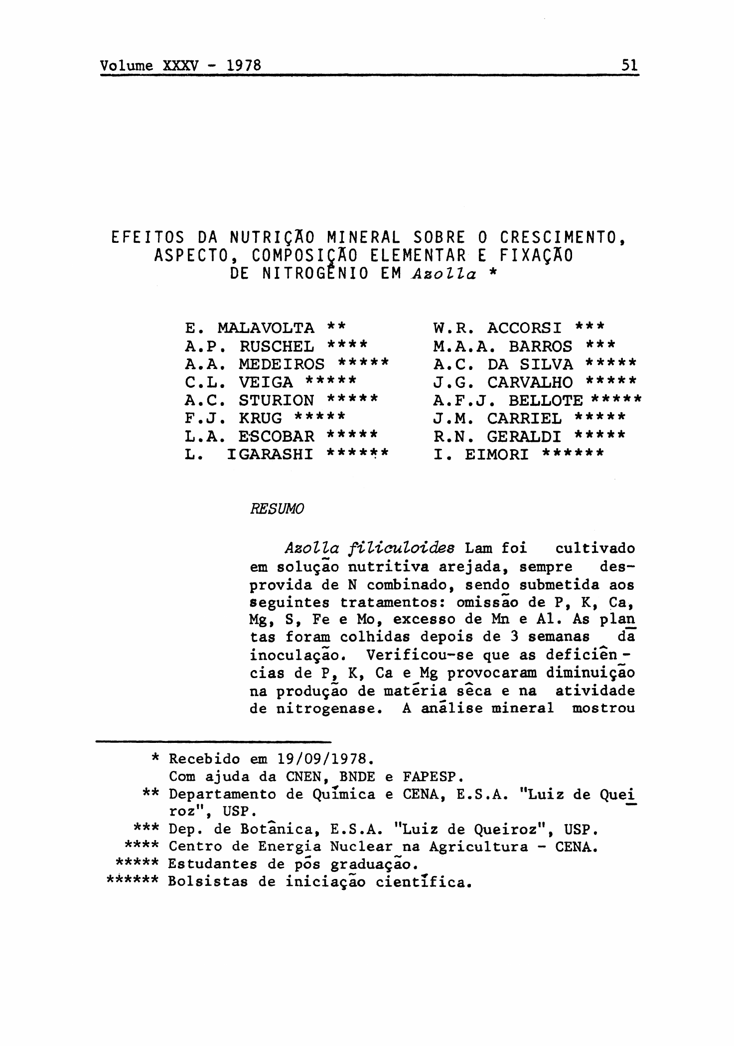 E F E I T O S D A N U T R I Ç Ã O M I N E R A L S O B R E O C R E S C I M E N T O , A S P E C T O , C O M P O S I Ç Ã O E L E M E N T A R Ε F I X A Ç Ã O D E N I T R O G Ê N I O E M Azolla * E. MALAVOLTA ** A.P. RUSCHEL **** A.A. MEDEIROS ***** C.L. VEIGA ***** A.C. STURION ***** F.J. KRUG ***** L.A. ESCOBAR ***** L. IGARASHI ****** W.R. ACCORSI *** M.A.A. BARROS *** A.C. DA SILVA ***** J.G. CARVALHO ***** A.F.J. BELLOTE ***** J.M. CARRIEL ***** R.N. GERALDI ***** I. EIMORI ****** RESUMO Azolla filiculoides Lam foi cultivado em solução nutritiva arejada, sempre des provida de Ν combinado, sendo submetida aos seguintes tratamentos: omissão de Ρ, K, Ca, Mg, S, Fe e Mo, excesso de Mn e Al. As plan¬ tas foram colhidas depois de 3 semanas da inoculação. Verificou-se que as deficiên cias de Ρ, K, Ca e Mg provocaram diminuição na produção de matéria seca e na atividade de nitrogenase. A análise mineral mostrou * Recebido em 19/09/1978. Com ajuda da CNEN, BNDE e FAPESP. ** Departamento de Química e CENA, E.S.A. "Luiz de Quei¬ roz", USP. *** Dep. de Botânica, E.S.A. "Luiz de Queiroz", USP. **** Centro de Energia Nuclear na Agricultura - CENA. ***** Estudantes de pós graduação. ****** Bolsistas de iniciação científica. que: a falta de um elemento provoca redução no seu teor; grande acumulo de Mo; diminui ção no teor de Al (do inóculo ou contamina¬ ção) no tratamento menos S que garantiu o maior crescimento; efeitos inibitórios ou si¬ nergísticos semelhantes aos descritos no ca so de plantas superiores. A toxidez de Al e Mn causou, principalmente a primeira, redu ção no crescimento e na atividade da nitroge¬ nase. Houve correlações positivas entre: Ν total e crescimento, atividade de nitrogena¬ se e Ν total. INTRODUÇÃO Azolla, sp. família Salviniaceae, é um feto- -aquãtico de distribuição mundial, porém ê mais a- bundante e espalhado nos trópicos. Cresce muito rapidamente na superfície de lagos e canais de ir rigação, produzindo uma fina massa de vegetação. Os indivíduos constam de rizomas que podem atingir ate 5 cm de comprimento; são cobertos por duas or dens de pequenas folhas densamente imbricadas e pa pilosas. Na face inferior, submersa, os rizomas produzem raizes adventicias não ramificadas de for ma cilíndrica. As folhinhas tem um lobo dorsal superior espes so, aéreo e verde; o ventral ê submerso e quase desprovido de coloração. No parênquima clorofilado do lobo dorsal há uma câmara em que vive Anabaena azollae, alga-azul verde família Nostocaceae, fixadora de Ν2· O uso dessa associação Az oil a-Anabaena azollae como melhorador da fertilidade do solo tem sido ci tado por vários autores (MOORE, 19 69; BECKING, 1976; IRRI, 1976; BOND, 1978). Plantações de arroz podem crescer sem nenhum nitrogênio além daquele fixado do ar pelas algas associadas. Os compostos nitrogenados formados pe Ias células das algas são liberadas no substrato ao redor ou apôs a morte e decomposição. Uma ca mada de Azo lia sp. em crescimento representa por tanto, um contínuo suprimento de nitrogênio do so lo (SHIELDS & DURREL, 196 4). Em condições de casa de vegetação, Azolla cultivado em solução nutriti va mostrou-se capaz de fixar o equivalente a 425 kg de N/ha por ano (E. MALAVOLTA, não publicado). Vários autores tem estudado o potencial de fi xação de nitrogênio dessa associação (PETERS, 1977; NUTMAN, 1971; VENKATARAMAN, 1961). 0 método ^mais utilizado para medir essa capacidade de fixação de nitrogênio baseia-se na propriedade dessas algas de reduzir acetileno a etileno que foi demonstrado primeiramente por STEWART et al. (196 7). Existem poucos estudos sobre a nutrição mine ral de Azolla. WATANABE et al. (1977) estudaram as necessidades minerais de Azolla em soluções de ficientes de fósforo, potássio, cálcio e magnêsio e uma solução com 40 ppm de Ν como nitrato de amô- nio. Todos os elementos deficientes afetaram a produção. No presente experimento se procurou:(1) verify car o efeito de deficiência e excessos minerais no crescimento e aspecto de Azolla filiouloides; (2) verificar o efeito das deficiências e excessos mi nerais na fixação do N 2 ; (3) verificar o efeito das deficiências e excessos minerais na composição qui mica de Azolla. MATERIAL Ε MÉTODOS O inóculo foi obtido originalmente na Faculda de de Ciências Agrárias e Veterinárias UNESP, Ja- boticabal, em um tanque de criação de peixes, por gentiliza do Eng9 Agr9 R. Pitelli. Para verificar o efeito de deficiências e ex cessos minerais no crescimento e aspecto de Azolla filiculoides Lam, foi feito o cultivo em solução nutritiva em bandejas de plástico translúcido (25 χ 30 χ 5 cm) constantemente arejada. Os tratamentos, citados na Tabela 1, foram fei tos em duas repetições. O cultivo foi feito transferindo-se um inõculo de cerca de 5 ml (material úmido) para as bandejas com solução nutritiva. Apôs 20 dias de cultivo foram feitas as seguin tes determinações: "* a. atividade da nitrogenase: determinada com quatro repetições pelo método de redução do aceti- leno e etileno e dosagem do último por cromatogra- fia de gas; b. matéria seca: determinada colhendo-se o ma terial desenvolvido na metade da ãrea da bandeja. c. descrição dos sintomas de deficiência e to- xidez; d. teores de Ν, P, Ca, Mg, S, Cu, Fe, Mn, Zn e Al: determinados no Departamento de Química Analí tica do CENA, ESALQ, USP. RESULTADOS Ε DISCUSSÃO - Sintomas de carência e de excesso - Tratamento completo A coloração predominante nas plantinhas é o verde-musgo. Contudo, nota-se, na mesma plantinha, variações na intensidade dessa coloração, segun do a posição que as folhinhas ocupam nos raminhos. Observa-se ainda, plantinhas, cujas folhas se mos travam retorcidas e pardacentas. Entretanto, nas plantinhas mais viçosas e mais verdes que as ou tras, as extremidades dos delicados rarainhos são esbranquiçadas e um tanto recur