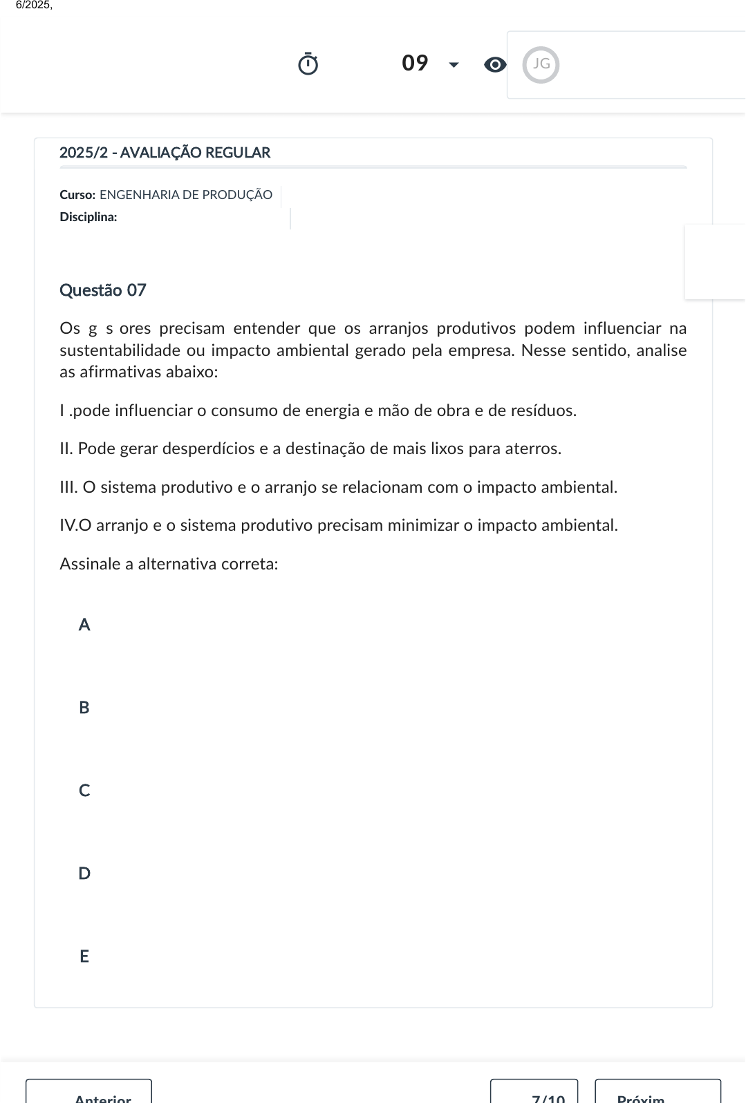 2025/2 - AVALIAÇÃO REGULAR Questão 07 Os gestores precisam entender que os arranjos produtivos podem influenciar na sustentabilidade ou impacto ambiental gerado pela empresa. Nesse sentido, analise as afirmativas abaixo: I .pode influenciar o consumo de energia e mão de obra e de resíduos. II. Pode gerar desperdícios e a destinação de mais lixos para aterros. III. O sistema produtivo e o arranjo se relacionam com o impacto ambiental. IV.O arranjo e o sistema produtivo precisam minimizar o impacto ambiental. Assinale a alternativa correta: A B C D E Curso: ENGENHARIA DE PRODUÇÃO Disciplina: INSTALAÇÕES INDUSTRIAIS Turma: EPROD5A2025 S5 M18 2025/2 Somente a afirmativa II está correta. Somente as afirmativas II e III estão corretas. Somente as afirmativas I, II e III estão corretas. Todas as afirmativas estão corretas. Somente as afirmativas I e II estão corretas. JEFERSON ALEXANDRE DA ... 85368-2000:40:09 JG Anterior 7/10 Próximo 27/06/2025, 20:20 AvaliA Online :: AvaliA Online https://uninga.grupoa.education/avalia-online/ 1/2 JEFERSON ALEXANDRE DA ... 85368-2000:40:09 JG Anterior 7/10 Próximo 27/06/2025, 20:20 AvaliA Online :: AvaliA Online https://uninga.grupoa.education/avalia-online/ 2/2