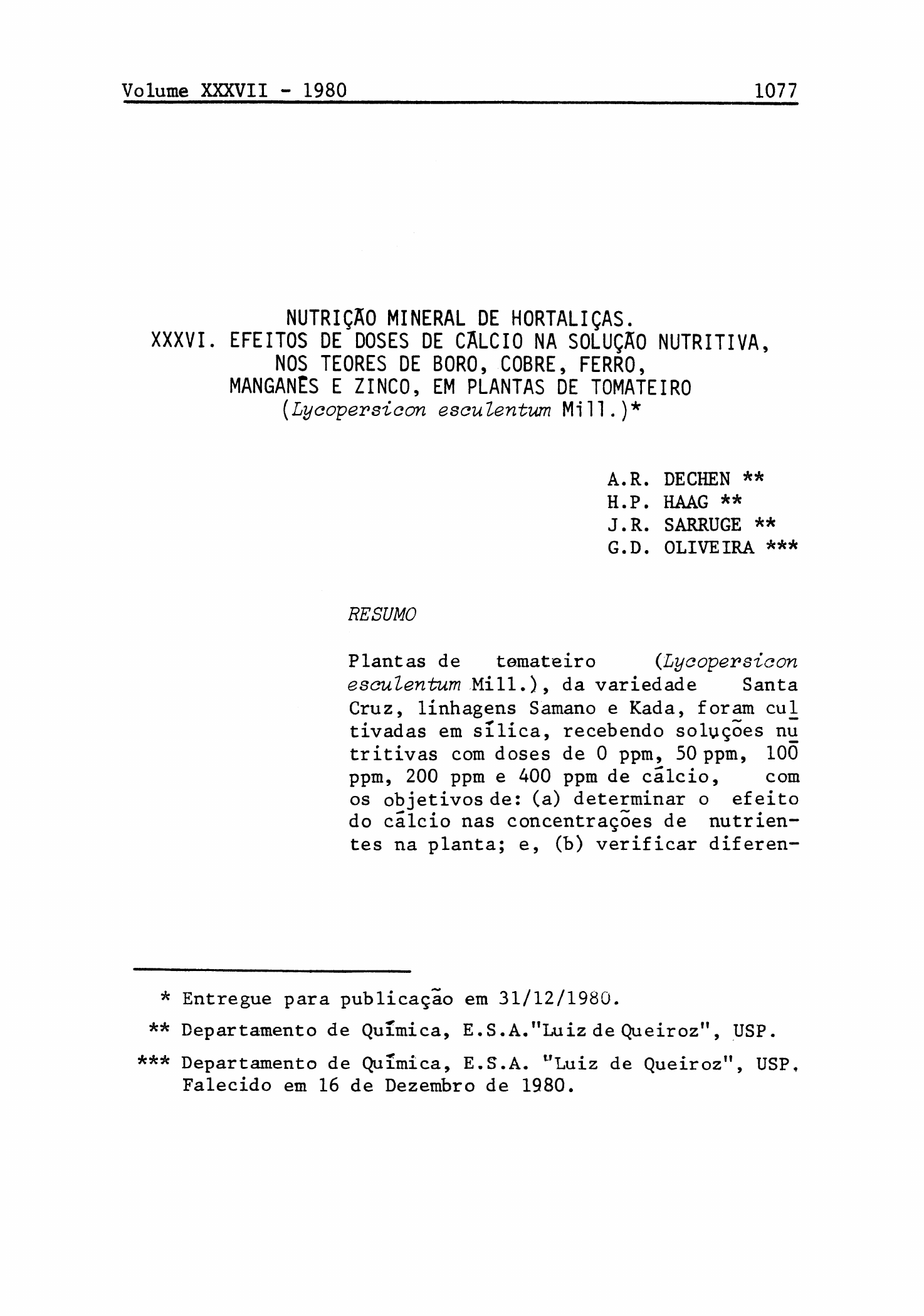 NUTRIÇÃO MINERAL DE HORTALIÇAS. XXXVI. EFEITOS DE DOSES DE CÁLCIO NA SOLUÇfiO NUTRITIVA, NOS TEORES DE BORO, COBRE, FERRO, MANGANÊS Ε ZINCO, EM PLANTAS DE TOMATEIRO (Lycopersicon esaulentum Mill.)* A.R. DECHEN ** Η.P. HAAG ** J.R. SARRUGE ** G.D. OLIVEIRA *** RESUMO Plantas de temateiro (Lycopersicon esculentum Mill.), da variedade Santa Cruz, linhagens Samano e Kada, foram cul tivadas em silica, recebendo soluções nu tritivas com doses de 0 ppm, 50 ppm, 100 ppm, 200 ppm e 400 ppm de cálcio, com os objetivos de: (a) determinar o efeito do cálcio nas concentrações de nutrien tes na planta; e, (b) verificar diferen- * Entregue para publicação em 31/12/1980. ** Departamento de Química, E.S.A,"Luiz de Queiroz", USP. *** Departamento de Química, E.S.A. "Luiz de Queiroz", USP, Falecido em 16 de Dezembro de 1980· ças no comportamento das linhagens Sa mano e Kada. Noventa dias apôs o transplante, as plan tas foram coletadas e separadas em: fo lhas inferiores, caules inferiores, fo lhas superiores, caules superiores e fru tos. No material coletado foram determi nados os teores de micronutrientes, com exceção do cloro e molibdenio. Curvas representativas das concentrações dos nutrientes nas partes das plantas, em função das doses de cálcio, foram obti das a partir dos dados calculados atra vés de equações de regressão. Os resultados mostraram que: - a adição de cálcio na solução nutriti va diminui os teores de zinco nos teci dos de ambas as linhagens, - as concentrações dos demais micronu trientes diferem nas linhagens e nas par tes analisadas. INTRODUÇÃO Dentre as plantas hortícolas de maior expressão econô mica no Estado de São Paulo, destaca-se o tomateiro (Lycoper sioon esoulentwn Mill.), cuja produção em 1978, segundo o Instituto de Economia Agrícola (SÃO PAULO, 1979) , foi cerca de 514.100 t, equivalente a 44% da produção nacional. Muitos são os problemas que afetam a cultura do toma teiro, tendo MINAMI & HAAG (1979) destacado como dos mais sérios e controvertidos, a podridão estilar, geralmente atri buida a deficiência de cálcio, enquanto GALLI et alii (1969) e CHAVES (1958) se referiram ã mesma como uma anomalia fi siológica que provoca perdas na colheita que chegam a atin gir de 30% a 50% da produção. No Brasil, poucos sao os trabalhos desenvolvidos no que se refere à deficiência de cálcio no tomateiro e ocorrência da podridão estilar, destacando-se entre eles, os de DECHEN et alii (1973), CASTRO (1976) e LIMA et alii (1976). HESTER (1938), nos Estados Unidos da America, estudan do a absorção de nutrientes por tomateiros em diferentes es tágios de crescimento, obteve para plantas aos tres meses de idade, teores de nutrientes na parte vegetativa e frutos, respectivamente de: 1,82% e 4,20% de N; 0,31% e 0,43% de P: 3,64% e 4,77% de K; 3,44% e 0,28% de Ca; 0,43% e 0,26% de Mg 1200 ppm e 800 ppm de Fe, e, 100 ppm e 410 ppm de Mn. LYON et alii (1943), nos Estados Unidos da America, es tudando a influencia da deficiência de micronutrientes no de senvolvimento e conteúdo de vitaminas no tomate, observaram teores de 39 ppm de Β em folhas de plantas aos 135 dias, e teores respectivamente, de 69, 7ppm, 398ppm e l,77ppm de Mn nas fo lhas superiores, folhas inferiores e frutos de plantas cul tivadas em solução nutritiva completa, e, 5,6 ppm, 5,4 ppm e 0,2 ppm de Mn para as mesmas partes de plantas cultivadas em solução nutritiva deficiente em manganês. Para o zinco, os teores nesses mesmos orgaos, em plantas cultivadas em solução nu tritiva completa, foram de 28,0 ρριη 29,8 ppm e 1,9 ppm, e, para as cultivadas em solução deficiente nesse elemento, 23,4 ppm, 16,5 ppm e 0,6 ppm, respectivamente. Quanto ao ferro, os teo res nas folhas superiores, folhas inferiores e frutos de plan tas cultivadas em solução nutritiva completa foram respecti vamente, de: 175 ppm, 229 ppm e 3,3 ppm, e, para aquelas cul tivadas em solução nutritiva deficiente em ferro: 74 ppm, 167 ppm e 1,4 ppm. BAYLEY & .McHARQUE (19431, estudando a deficiência de cobre em tomateiros cultivados em solução nutritiva, relata ram como concentração ótima de cobre na parte aérea, 0,05 ppm, e nos frutos, 0,01 ppm. CAROLUS (1949), nos Estados Unidos da America, estudan do a relação entre cálcio e potássio em tomate, encontrou, pa ra uma solução com 160 ppm de cálcio e 235 ppm de potássio, teores nas folhas terminais de: 6,50% de K; 2,50% de Ca;Q£5% de Mg; 140 ppm de Fe e uma relação K/Ca de 2,61. TAYLOR & SMITH (1957), nos Estados Unidos da America, através da analise de tomateiros para o estudo da podridão es tilar, verificaram que as plantas susceptíveis â podridão ti nham baixos teores de cálcio e altos teores de nitrogênio, co bre e ferro. Analises das folhas basais e terminais sugeri ram que as amostras das folhas terminais eram mais indicati vas do estado nutricional do tomateiro do que as das folhas basais ou frutos. Relataram teores de cálcio de 3,37% nas fo lhas basais, 1,33% nas folhas terminais e 0,22% nos frutos, para plantas cultivadas em solução nutritiva com 100 ppm de nitrogênio e 2 ppm de boro. TANAKA et alii (1970), no Brasil, testando o efeito da adubaçao no crescimento, nível de nutrientes analisados nas folhas e produção de plantas de tomate cultivadas num Latos solo Vermelho Amarelo, observaram o aparecimento de podridão estilar em tratamentos que nao receberam calcário, ou que re ceberam doses mais elevadas de nitrogênio e potássio. A pul verização com cloreto de cálcio 0,5% foi suficiente para cor rigir a deficiência. Nas folhas de plantas com 90 dias, en contraram teores de 4,65% de N, 0,30% de P, 5,76% de K,,0,87% de Ca, 0,33% de Mg, 75 ppm de Β e 35 ppm de Zn. FREEMAN et dlii (1975), na Australia, estudando o efei to do balanço de nutrientes e calagem na cultura de tomate, verificaram a ocorrência de podridão estilar em tratamentos que nao continham cálcio. SAXENA et alii (.1975), na Guia