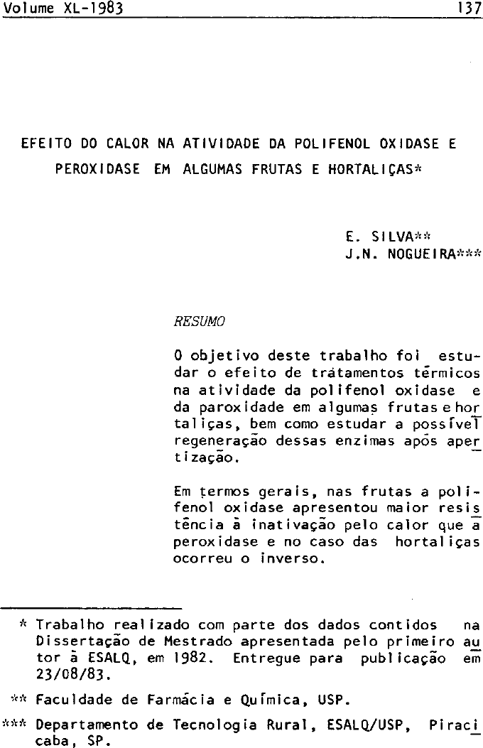 PEROXIDASE EM ALGUMAS FRUTAS E HORTALIÇAS*