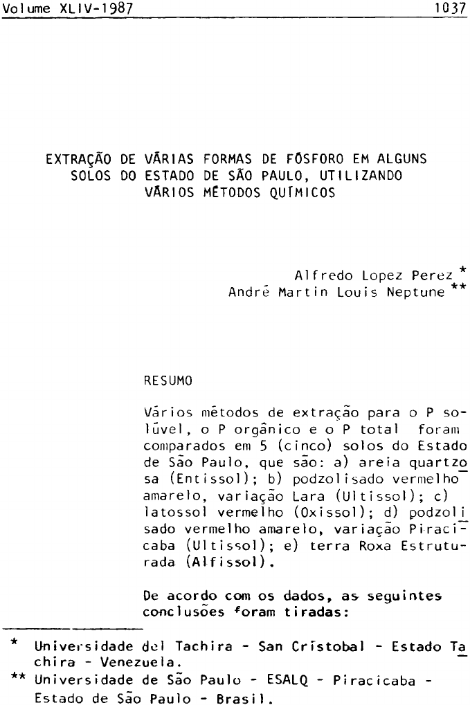 EXTRAÇÃO DE VÁRIAS FORMAS DE FÓSFORO EM ALGUNS SOLOS DO ESTADO DE SÃO PAULO, UTILIZANDO VÁRIOS MÉTODOS QUÍMICOS A l f r e d o Lopez P e r e z * André Mar t i n L o u i s Neptune** RESUMO V á r i o s métodos de e x t r a ç ã o para o P s o l ú v e l , o P o r g â n i c o e o P t o t a l foram comparados em 5 ( c i n c o ) s o l o s do E s t a d o de São P a u l o , que s ã o : a ) a r e i a q u a r t z o ¬ sa ( E n t i s s o l ) ; b) p o d z o l i s a d o vermelho amare lo , v a r i a ç ã o L a r a ( U l t i s s o l ) ; c ) l a t o s s o l vermelho ( O x i s s o l ) ; d) p o d z o l i ¬ sado vermelho a m a r e l o , v a r i a ç ã o P i r a c i caba ( U l t i s s o l ) ; e) t e r r a Roxa E s t r u t u rada ( A l f i s s o l ) . De a c o r d o com os d a d o s , a s s e g u i n t e s c o n c l u s õ e s foram t i r a d a s : * U n i v e r s i d a d e del T a c h i r a - San C r i s t o b a l - E s t a d o Ta¬ c h i r a - V e n e z u e l a . * * U n i v e r s i d a d e de São P a u l o - ESALQ - P i r a c i c a b a - Es tado de São P a u l o - B r a s i l . 1. Os me lhores e x t r a t o r e s para o P s o l ú v e l foram H2SO4 0 ,05 N (método - IAC) e H 2 SO 4 0 ,025 N + HC1 0 ,05 N (método M e h l i c h ) . 2 . Pa ra remover e medir o P o r g â n i c o , os e x t r a t o r e s foram e q u i v a l e n t e s . 3 . 0 método qu ím ico de Sommers e Ne lson e a q u e l e de J a c k s o n foram os melho r e s para o P t o t a l no s o l o . INTRODUÇÃO 0 â n i o n f o s f a t o l i g a - s e com f a c i l i d a d e a c a r g a s p o s i t i v a s l i v r e s , compostos ou p a r t í c u l a s c o l o i d a i s - formando os ma is d i v e r s o s s i s t e m a s , com d i f e r e n t e s g r a u s de s o l u b i 1 i d a d e , os q u a i s con t r i buem para manter o e q u i l í b r i o do f ó s f o r o na s o l u ç ã o do s o l o . 0 con teúdo de f ó s f o r o t oa i na m a i o r i a dos s o l o s m i n e r a i s v a r i a e n t r e 0 ,02 a 0,5¾ (JACKSON, 1 9 6 ^ ) . E s t e pode se s u b d i v i d i r em duas f r a ç õ e s p r i n c i p a i s : uma i n o r g â n i c a que i n c l u i p r i n c i p a l m e n t e f o s f a t o s complexos de A l , Fe e C a , a qua l por sua v e z se s u b d i v i d e em uma p a r te s o l ú v e l em e x t r a t o r e s q u í m i c o s e uma i n s o l ú v e l , e o u t r a f r a ç ã o o r g â n i c a . A a n á l i s e de f ó s f o r o s o l ú v e l por d o i s métodos po de a p r e s e n t a r c o r r e l a ç ã o e n t r e s i em um grupo de s o l o s e não em o u t r o . No e n t a n t o , a q u a n t i d a d e de t r a b a l h o s t é c n i c o s s o b r e comparação e n t r e e x t r a t o r e s q u í m i c o s , pa ra a d e t e r m i n a ç ã o de f ó s f o r o s o l ú v e l , e t e s t e s de ava l i a_ ção em c a s a de v e g e t a ç ã o ou campo, c r e s c e con t i nuamen te , s u g e r i n d o que , de forma g e r a l , a melhor t é c n i c a de* e x t r a ç ã o a i n d a não e x i s t e (CHANG, 1 9 6 5 ) . A função do f ó s f o r o o r g â n i c o no s o l o é g e r a l m e n te e s q u e c i d a , p rovave lmen te po rque , em s o l o s m i n e r a i s c u l t i v a d o s , a maior p a r t e do f ó s f o r o t o t a l e s t á sob f o r ma i n o r g â n i c a . A c r e d i t a - s e que a c o n t r i b u i ç ã o do f ó s f o r o o r g â n i c o no ap rove i t amen to da p l a n t a é pequeno nos s o l o s de r e g i õ e s temperadas ( R U S S E L L , 1 9 7 3 ) , embora e s t a possa ser s i g n i f i c a t i v a em s o l o s de r e g i õ e s t r o p i c a i s ( W IL LIAMS, I 9 6 7 ) . As p r i n c i p a i s formas de f ó s f o r o o r g â n i c o no s o l o , são a s s e g u i n t e s : Á c i d o s N u c l e i c o s , F o s f a t o de I n o s i t o l e F o s f o l i p í d e o s . No e n t a n t o , e x i s t e m f o s f o p r o t e í n a s e f o s f o a ç ú c a r e s , t a i s como G l u c o s e - l - F o s f a t o , a s q u a i s se apresentam em q u a n t i d a d e s menores a 1 % do f ó s f o r o o r g â n i c o (ANDERSON, 1 9 6 7 ) . A s s i m o p r e s e n t e t r a b a l h o teve como o b j e t i v o e x t r a i r v á r i a s formas de f ó s f o r o em a l g u n s s o l o s do E s t a do de Sao P a u l o , B r a s i l , por v á r i o s métodos q u í m i c o s . REVISÃO DE LITERATURA A maior p a r t e dos s o l o s das r e g i õ e s t r o p i c a i s e s u b t r o p i c a i s possuem um n í v e l mui to b a i x o em f ó s f o r o d i s p o n í v e l . Por i s s o os rend imentos das c u l t u r a s são g e r a l " mente mui to b a i x o s , a menos que se ap l i quem f e r t i l i z a n tes f o s f a t a d o s . De acordo com CATANI ( 1 9 ^ 7 ) , os s o l o s do E s t a d o de São P a u l o são rea lmente pobres em f ó s f o r o . V e r i f i c o u - se p e l o s seus e s t u d o s , que a T e r r a Roxo L e g i t i m a é a mais r i c a , v i n d o d e p o i s os s o l o s da formação C o r u m b a t a í . PASQUAL e NEPTUNE ( 1 9 7 1 ) , encon t ra ram teo r a t é de k% de f ó s f o r o t o t a l em uma T e r r a Roxa E s t r u t u r a d a do E s t a d o de São P a u l o . De f a t o os s o l o s T e r r a Roxa do B r a s i l a c u sam uma q u a n t i d a d e c o n s i d e r a v e l m e n t e ma is a l t a de f ó s f o ro t o t a l e i n o r g â n i c o , do que a q u e l e s s o l o s a l t amen te m e t e o r i z a d o s (NEPTUNE, 1 9 7 6 ) . Nem todo o f ó s f o r o do s o l o é d i s p o n í v e l para as p l a n t a s . A p roporção das d i v e r s a s formas de f ó s f o r o e o pH do s i s t e m a , vão i n f l u e n c i a r na a t i v i d a d e ou c o n c e n t r a ç ã o de í o n s f o s f a t o na s o l u ç ã o do s o l o e , p o r t a n t o , na d i s p o n i b i l i d a d e aos v e g e t a i s (CATANI e BATAGLIA, I 9 6 8 ) . D e d u z - s e en tão que o conhec imento das d i v e r s a s fo rmas de f ó s f 