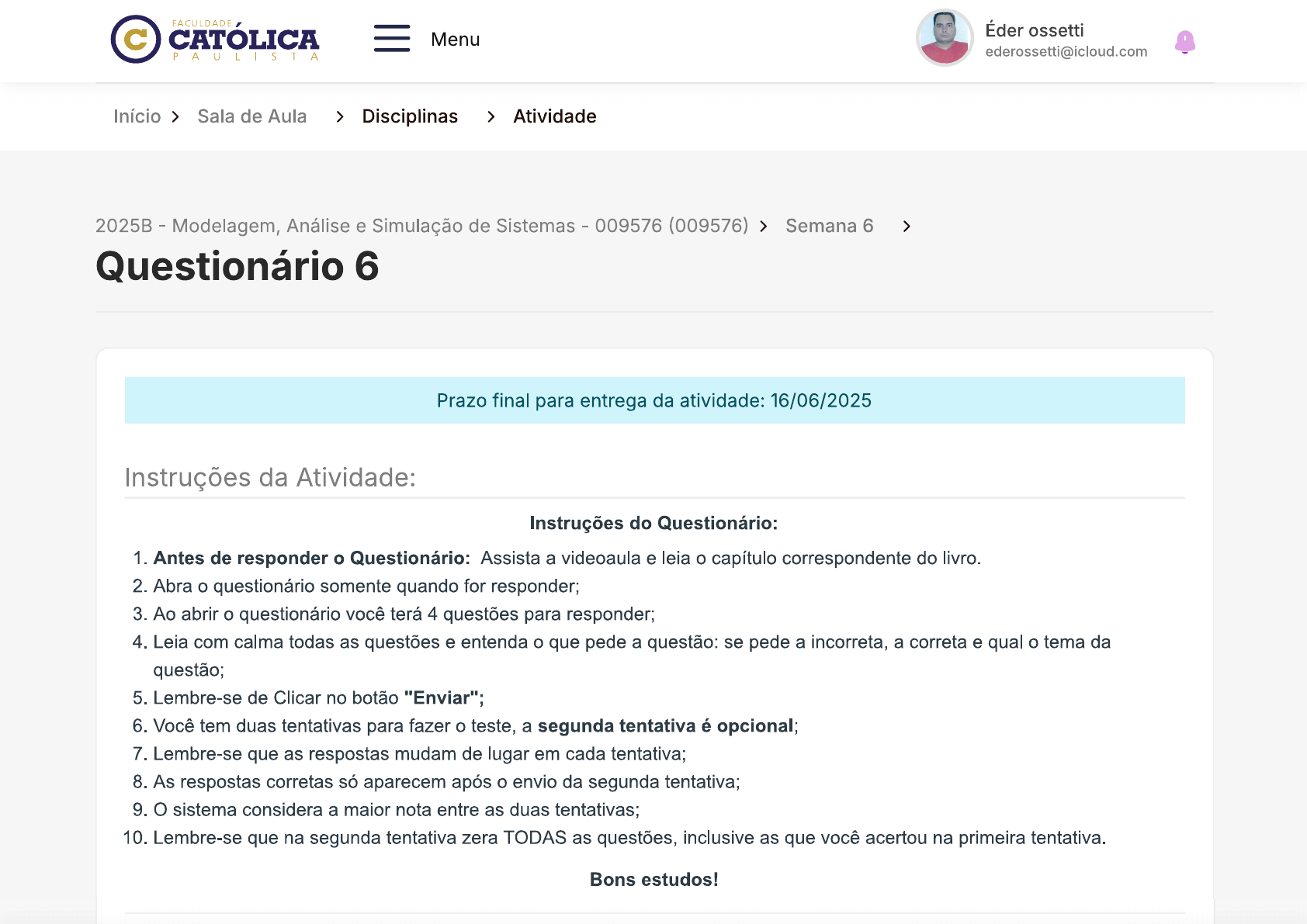 FACULDADE CATOLICA Éder ossetti Menu PAULISTA ederossetti@icloud.com Início > Sala de Aula > Disciplinas > Atividade 2025B Modelagem, Análise e Simulação de Sistemas 009576 (009576) > Semana 6 > Questionário 6 Prazo final para entrega da atividade: 16/06/2025 Instruções da Atividade: Instruções do Questionário: 1. Antes de responder Questionário: Assista a videoaula e leia capítulo correspondente do livro. 2. Abra questionário somente quando for responder; 3. Ao abrir questionário você terá 4 questões para responder; 4. Leia com calma todas as questões e entenda que pede a questão: se pede a incorreta, a correta e qual tema da questão; 5. Lembre-se de Clicar no botão "Enviar"; 6. Você tem duas tentativas para fazer teste, a segunda tentativa é opcional; 7. Lembre-se que as respostas mudam de lugar em cada tentativa; 8. As respostas corretas só aparecem após envio da segunda tentativa; 9. sistema considera a maior nota entre as duas tentativas; 10. Lembre-se que na segunda tentativa zera TODAS as questões, inclusive as que você acertou na primeira tentativa. Bons estudos!FACULDADE CATOLICA Éder ossetti Menu PAULISTA ederossetti@icloud.com Nota Automática Nota Final: 0,400 de 0,400 pontos ederossetti@icloud.com - 19/05/2025 22:55:39 Visualizar Entrega Perguntas Pergunta 1. Pergunta 2. Pergunta 3. Pergunta 4. Pergunta 1. pontos: 0,100 Avaliação Refere-se a uma série de operações que estão sendo executadas em materiais e peças. As Nota Avaliada: operações podem ser manuais, mecânicas ou químicas. Além disso, as Operações convertem 0,100 de 0,100 entradas em saídas.FACULDADE CATOLICA Éder ossetti Menu PAULISTA ederossetti@icloud.com A. Armazenamento Conversão C. Direção D. Saídas Informação Pergunta 2. pontos: 0,100 Avaliação O tipo mais básico de técnica de validação é uma divisão de treinamento e teste. objetivo Nota Avaliada: de uma técnica de validação é ver como seu modelo de aprendizado de máquina reage a 0,100 de 0,100 dados nunca vistos antes. De qual técnica estamos falando? Múltipla Escolha: A. Validação cruzada K-Fold ResubstituiçãoFACULDADE CATOLICA Éder ossetti Menu PAULISTA ederossetti@icloud.com D. Inicialização (Bootstrapping) E. Treinar e Testar Split ou Holdout Pergunta 3. pontos: 0,100 Avaliação um arranjo lógico de componentes projetados para atingir objetivos específicos de acordo Nota Avaliada: com um plano. Um sistema pode ter muitos componentes e a variação em um componente 0,100 de 0,100 provavelmente afetará os outros componentes do sistema, por exemplo." texto se refere a? Múltipla Escolha: A. Insumo Produção C. Indústria D. Sistema InformaçãoFACULDADE CATOLICA Éder ossetti Menu PAULISTA ederossetti@icloud.com Pergunta 4. pontos: 0,100 Avaliação "é uma forma de técnica de validação de modelo de aprendizado de máquina que usa Nota Avaliada: amostragem com substituição" 0,100 de 0,100 De qual técnica estamos falando? Múltipla Escolha: Resubstituição Validação cruzada K-Fold C. Inicialização (Bootstrapping) D. Subamostragem aleatória Treinar e Testar Split ou Holdout Fechar VisualizaçãoFACULDADE CATOLICA Éder ossetti Menu PAULISTA ederossetti@icloud.com FACULDADE Contato CATOLICA Endereço PAULISTA Faculdade Católica Paulista WhatsApp : (14) 9.8826-3000 Avenida Cristo Rei, 305 - Banzato Marília, Telefone Sede: (14) 3422-1815 São Paulo - CEP: 17515-200 f in Central de Atendimento: 0800 664 5583 Horário De Funcionamento E-mail : Segunda a quinta, das 8:00 às 20:00 horas As sextas, das 8:00 às 18:00 horas.