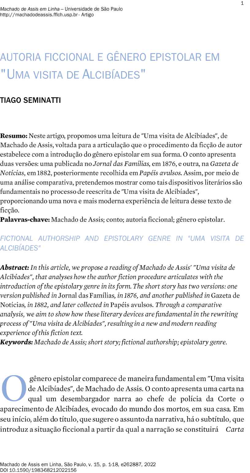 Universidade de São Paulo São Paulo, São Paulo, Brasil – … – – – … – ' ' – … 1 2 – – 3 – – – – – – – – 4 "Uma visita de Alcibíades" em duas versões: do oral para o escrito 5 – – – – – – – – 6 – – – – … – – – ' … – – – – – – O desembargador vai ao Cassino: escrita epistolar e mundo rotinizado 8 9 – – – … – … – … – – – – – – – – – – – – Referências TIAGO SEMINATTI é doutorando em Literatura Brasileira na Universidade de São Paulo com o projeto "O manuscrito e o impresso: diários, cartas e papéis velhos na ficção de Machado de Assis", financiado pelo CNPq (Processo: 140802/2020-7). Mestre em Literatura Brasileira pela FFLCH-USP; Bacharel e Licenciado em Letras (Português e Francês) pela FFLCH-USP. Orcid: http://orcid.org/0000-0001-6493-1419. E-mail: tiago.seminatti@usp.br. Recebido: 07.04.2022 Aprovado: 04.05.2022