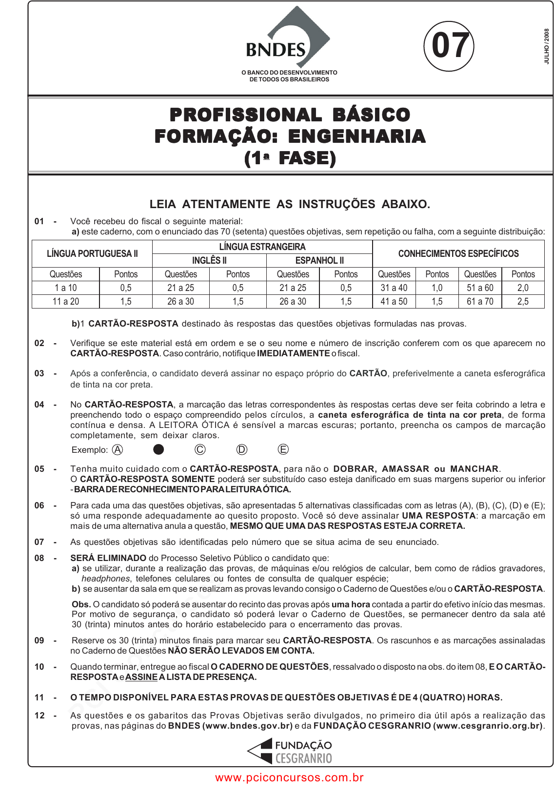 pcimarkpci MDAwMDowMDAwOjAwMDA6MDAwMDowMDAwOmZmZmY6MmQ4YzpjMGE1:U2F0LCAyOCBKdW4gMjAyNSAxMDoyMDowNCAtMDMwMA== www.pciconcursos.com.br LÍNGUA ESTRANGEIRA LÍNGUA PORTUGUESA II INGLÊS II ESPANHOL II CONHECIMENTOS ESPECÍFICOS Questões Pontos Questões Pontos Questões Pontos Questões Pontos Questões Pontos 1 a 10 0,5 21 a 25 0,5 21 a 25 0,5 31 a 40 1,0 51 a 60 2,0 11 a 20 1,5 26 a 30 1,5 26 a 30 1,5 41 a 50 1,5 61 a 70 2,5 PROFISSIONAL BÁSICOPROFISSIONAL BÁSICOPROFISSIONAL BÁSICOPROFISSIONAL BÁSICOPROFISSIONAL BÁSICO FORMAÇÃO: ENGENHARIAFORMAÇÃO: ENGENHARIAFORMAÇÃO: ENGENHARIAFORMAÇÃO: ENGENHARIAFORMAÇÃO: ENGENHARIA (1(1(1(1(1aaaaa F F F F FASE)ASE)ASE)ASE)ASE) JU LH O / 2 00 8 O BANCO DO DESENVOLVIMENTO DE TODOS OS BRASILEIROS A C D E LEIA ATENTAMENTE AS INSTRUÇÕES ABAIXO. 01 - Você recebeu do fiscal o seguinte material: a) este caderno, com o enunciado das 70 (setenta) questões objetivas, sem repetição ou falha, com a seguinte distribuição: b)1 CARTÃO-RESPOSTA destinado às respostas das questões objetivas formuladas nas provas. 02 - Verifique se este material está em ordem e se o seu nome e número de inscrição conferem com os que aparecem no CARTÃO-RESPOSTA. Caso contrário, notifique IMEDIATAMENTE o fiscal. 03 - Após a conferência, o candidato deverá assinar no espaço próprio do CARTÃO, preferivelmente a caneta esferográfica de tinta na cor preta. 04 - No CARTÃO-RESPOSTA, a marcação das letras correspondentes às respostas certas deve ser feita cobrindo a letra e preenchendo todo o espaço compreendido pelos círculos, a caneta esferográfica de tinta na cor preta, de forma contínua e densa. A LEITORA ÓTICA é sensível a marcas escuras; portanto, preencha os campos de marcação completamente, sem deixar claros. Exemplo: 05 - Tenha muito cuidado com o CARTÃO-RESPOSTA, para não o DOBRAR, AMASSAR ou MANCHAR. O CARTÃO-RESPOSTA SOMENTE poderá ser substituído caso esteja danificado em suas margens superior ou inferior - BARRA DE RECONHECIMENTO PARA LEITURA ÓTICA. 06 - Para cada uma das questões objetivas, são apresentadas 5 alternativas classificadas com as letras (A), (B), (C), (D) e (E); só uma responde adequadamente ao quesito proposto. Você só deve assinalar UMA RESPOSTA: a marcação em mais de uma alternativa anula a questão, MESMO QUE UMA DAS RESPOSTAS ESTEJA CORRETA. 07 - As questões objetivas são identificadas pelo número que se situa acima de seu enunciado. 08 - SERÁ ELIMINADO do Processo Seletivo Público o candidato que: a) se utilizar, durante a realização das provas, de máquinas e/ou relógios de calcular, bem como de rádios gravadores, headphones, telefones celulares ou fontes de consulta de qualquer espécie; b) se ausentar da sala em que se realizam as provas levando consigo o Caderno de Questões e/ou o CARTÃO-RESPOSTA. Obs. O candidato só poderá se ausentar do recinto das provas após uma hora contada a partir do efetivo início das mesmas. Por motivo de segurança, o candidato só poderá levar o Caderno de Questões, se permanecer dentro da sala até 30 (trinta) minutos antes do horário estabelecido para o encerramento das provas. 09 - Reserve os 30 (trinta) minutos finais para marcar seu CARTÃO-RESPOSTA. Os rascunhos e as marcações assinaladas no Caderno de Questões NÃO SERÃO LEVADOS EM CONTA. 10 - Quando terminar, entregue ao fiscal O CADERNO DE QUESTÕES, ressalvado o disposto na obs. do item 08, E O CARTÃO- RESPOSTA e ASSINE A LISTA DE PRESENÇA. 11 - O TEMPO DISPONÍVEL PARA ESTAS PROVAS DE QUESTÕES OBJETIVAS É DE 4 (QUATRO) HORAS. 12 - As questões e os gabaritos das Provas Objetivas serão divulgados, no primeiro dia útil após a realização das provas, nas páginas do BNDES (www.bndes.gov.br) e da FUNDAÇÃO CESGRANRIO (www.cesgranrio.org.br). 07 www.pciconcursos.com.br pcimarkpci MDAwMDowMDAwOjAwMDA6MDAwMDowMDAwOmZmZmY6MmQ4YzpjMGE1:U2F0LCAyOCBKdW4gMjAyNSAxMDoyMDowNCAtMDMwMA== www.pciconcursos.com.br 2 PROFISSIONAL BÁSICO FORMAÇÃO: ENGENHARIA (1a FASE) Cabe perguntar: o que seria da emoção se ela não provocasse um batimento acelerado do coração, uma pele ruborizada, uma dor de cabeça, uma respiração ofegante, um nó na garganta, uma agitação das mãos, uma paralisia das pernas? Desde o nascimento somos nutridos tanto de emoções como de leite. Não é exagero dizer que a falta de um ou de outro desses elementos pode conduzir o recém-nascido à morte. Não se vive sem afeto. Freud e depois os psicanalistas demonstraram como as primeiras emoções estruturam a personalidade. Na vida adulta evoluímos, apesar de emoções vividas na fase de crescimento. Uma das principais vantagens da maturidade e da experiência é saber identificar nossas emoções e, em alguns casos, até domesticá-las progres- sivamente. Pois, embora componente de nossa psique, que nos identifica e nos singulariza, a emoção parece ter uma certa independência em relação a nós mesmos. Gostaríamos, por exemplo, de não corar quando nos provocam ou nos constrangem, mas a emoção aflora sem que possamos controlá-la. É nisso que ela parece irracional. Por isso é comum dizer que “o coração tem razões que a própria razão desconhece”. Para muitos, o mundo perfeito não teria emoções, tudo seria racional, refletido, calculado. Mas que sentido teria a existência? O ser humano sem emoção seria uma máquina. As emoções são tão inerentes ao ser que, segundo alguns estudiosos, estão inscritas no nosso patrimônio genético. Segundo Darwin, existiriam seis emoções que são comuns a toda a humanidade, inde- pendente da cultura: alegria, tristeza, surpresa, medo, desgosto e raiva. Há quem associe essa visão das emoções à das cores. A variedade de matizes que enxergamos seria uma mistura entre as cores de base. No caso das emoções, as tonalidades seriam infinitas. As emoções regulam nossa percepção do meio e as relações com as pessoas. Em decorrência das emoções nos apr