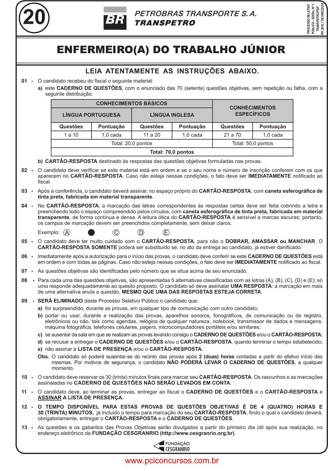 pcimarkpci MDAwMDowMDAwOjAwMDA6MDAwMDowMDAwOmZmZmY6MmQ4YzpjMGE1:U2F0LCAyOCBKdW4gMjAyNSAxMDoxNjowMiAtMDMwMA== www.pciconcursos.com.br LEIA ATENTAMENTE AS INSTRUÇÕES ABAIXO. 01 - O candidato recebeu do fiscal o seguinte material: a) este CADERNO DE QUESTÕES, com o enunciado das 70 (setenta) questões objetivas, sem repetição ou falha, com a seguinte distribuição: CONHECIMENTOS BÁSICOS CONHECIMENTOS ESPECÍFICOSLÍNGUA PORTUGUESA LÍNGUA INGLESA Questões Pontuação Questões Pontuação Questões Pontuação 1 a 10 1,0 cada 11 a 20 1,0 cada 21 a 70 1,0 cada Total: 20,0 pontos Total: 50,0 pontos Total: 70,0 pontos b) CARTÃO-RESPOSTA destinado às respostas das questões objetivas formuladas nas provas. 02 - O candidato deve verificar se este material está em ordem e se o seu nome e número de inscrição conferem com os que aparecem no CARTÃO-RESPOSTA. Caso não esteja nessas condições, o fato deve ser IMEDIATAMENTE notificado ao fiscal. 03 - Após a conferência, o candidato deverá assinar, no espaço próprio do CARTÃO-RESPOSTA, com caneta esferográfica de tinta preta, fabricada em material transparente. 04 - No CARTÃO-RESPOSTA, a marcação das letras correspondentes às respostas certas deve ser feita cobrindo a letra e preenchendo todo o espaço compreendido pelos círculos, com caneta esferográfica de tinta preta, fabricada em material transparente, de forma contínua e densa. A leitura ótica do CARTÃO-RESPOSTA é sensível a marcas escuras; portanto, os campos de marcação devem ser preenchidos completamente, sem deixar claros. Exemplo: 05 - O candidato deve ter muito cuidado com o CARTÃO-RESPOSTA, para não o DOBRAR, AMASSAR ou MANCHAR. O CARTÃO-RESPOSTA SOMENTE poderá ser substituído se, no ato da entrega ao candidato, já estiver danificado. 06 - Imediatamente após a autorização para o início das provas, o candidato deve conferir se este CADERNO DE QUESTÕES está em ordem e com todas as páginas. Caso não esteja nessas condições, o fato deve ser IMEDIATAMENTE notificado ao fiscal. 07 - As questões objetivas são identificadas pelo número que se situa acima de seu enunciado. 08 - Para cada uma das questões objetivas, são apresentadas 5 alternativas classificadas com as letras (A), (B), (C), (D) e (E); só uma responde adequadamente ao quesito proposto. O candidato só deve assinalar UMA RESPOSTA: a marcação em mais de uma alternativa anula a questão, MESMO QUE UMA DAS RESPOSTAS ESTEJA CORRETA. 09 - SERÁ ELIMINADO deste Processo Seletivo Público o candidato que: a) for surpreendido, durante as provas, em qualquer tipo de comunicação com outro candidato; b) portar ou usar, durante a realização das provas, aparelhos sonoros, fonográficos, de comunicação ou de registro, eletrônicos ou não, tais como agendas, relógios de qualquer natureza, notebook, transmissor de dados e mensagens, máquina fotográfica, telefones celulares, pagers, microcomputadores portáteis e/ou similares; c) se ausentar da sala em que se realizam as provas levando consigo o CADERNO DE QUESTÕES e/ou o CARTÃO-RESPOSTA; d) se recusar a entregar o CADERNO DE QUESTÕES e/ou o CARTÃO-RESPOSTA, quando terminar o tempo estabelecido; e) não assinar a LISTA DE PRESENÇA e/ou o CARTÃO-RESPOSTA. Obs. O candidato só poderá ausentar-se do recinto das provas após 2 (duas) horas contadas a partir do efetivo início das mesmas. Por motivos de segurança, o candidato NÃO PODERÁ LEVAR O CADERNO DE QUESTÕES, a qualquer momento. 10 - O candidato deve reservar os 30 (trinta) minutos finais para marcar seu CARTÃO-RESPOSTA. Os rascunhos e as marcações assinaladas no CADERNO DE QUESTÕES NÃO SERÃO LEVADOS EM CONTA. 11 - O candidato deve, ao terminar as provas, entregar ao fiscal o CADERNO DE QUESTÕES e o CARTÃO-RESPOSTA e ASSINAR A LISTA DE PRESENÇA. 12 - O TEMPO DISPONÍVEL PARA ESTAS PROVAS DE QUESTÕES OBJETIVAS É DE 4 (QUATRO) HORAS E 30 (TRINTA) MINUTOS, já incluído o tempo para marcação do seu CARTÃO-RESPOSTA, findo o qual o candidato deverá, obrigatoriamente, entregar o CARTÃO-RESPOSTA e o CADERNO DE QUESTÕES. 13 - As questões e os gabaritos das Provas Objetivas serão divulgados a partir do primeiro dia útil após sua realização, no endereço eletrônico da FUNDAÇÃO CESGRANRIO (http://www.cesgranrio.org.br). PR OC ES SO S EL ET IV O PÚ BL IC O - E DI TA L N o 1 TR AN SP ET RO /P SP RH 20 18 .1 DE 08 /02 /20 18 ENFERMEIRO(A) DO TRABALHO JÚNIOR 20 www.pciconcursos.com.br pcimarkpci MDAwMDowMDAwOjAwMDA6MDAwMDowMDAwOmZmZmY6MmQ4YzpjMGE1:U2F0LCAyOCBKdW4gMjAyNSAxMDoxNjowMiAtMDMwMA== www.pciconcursos.com.br 2 TRANSPETRO ENFERMEIRO(A) DO TRABALHO JÚNIOR PROVA 20 CONHECIMENTOS BÁSICOS LÍNGUA PORTUGUESA Memórias Póstumas de Brás Cubas Lobo Neves, a princípio, metia-me grandes sus- tos. Pura ilusão! Como adorasse a mulher, não se ve- xava de mo dizer muitas vezes; achava que Virgília era a perfeição mesma, um conjunto de qualidades sólidas e finas, amorável, elegante, austera, um mo- delo. E a confiança não parava aí. De fresta que era, chegou a porta escancarada. Um dia confessou-me que trazia uma triste carcoma na existência; faltava- -lhe a glória pública. Animei-o; disse-lhe muitas coi- sas bonitas, que ele ouviu com aquela unção religiosa de um desejo que não quer acabar de morrer; então compreendi que a ambição dele andava cansada de bater as asas, sem poder abrir o voo. Dias depois disse-me todos os seus tédios e desfalecimentos, as amarguras engolidas, as raivas sopitadas; contou-me que a vida política era um tecido de invejas, despei- tos, intrigas, perfídias, interesses, vaidades. Eviden- temente havia aí uma crise de melancolia; tratei de combatê-la. — Sei o que lhe digo, replicou-me com tristeza. Não pode imaginar o que tenho passado. Entrei na política por gosto, por família, por ambição, e um pou- co por vaidade. Já vê que reuni em mim só todos os motivos que levam o homem à vida pública; faltou-me 