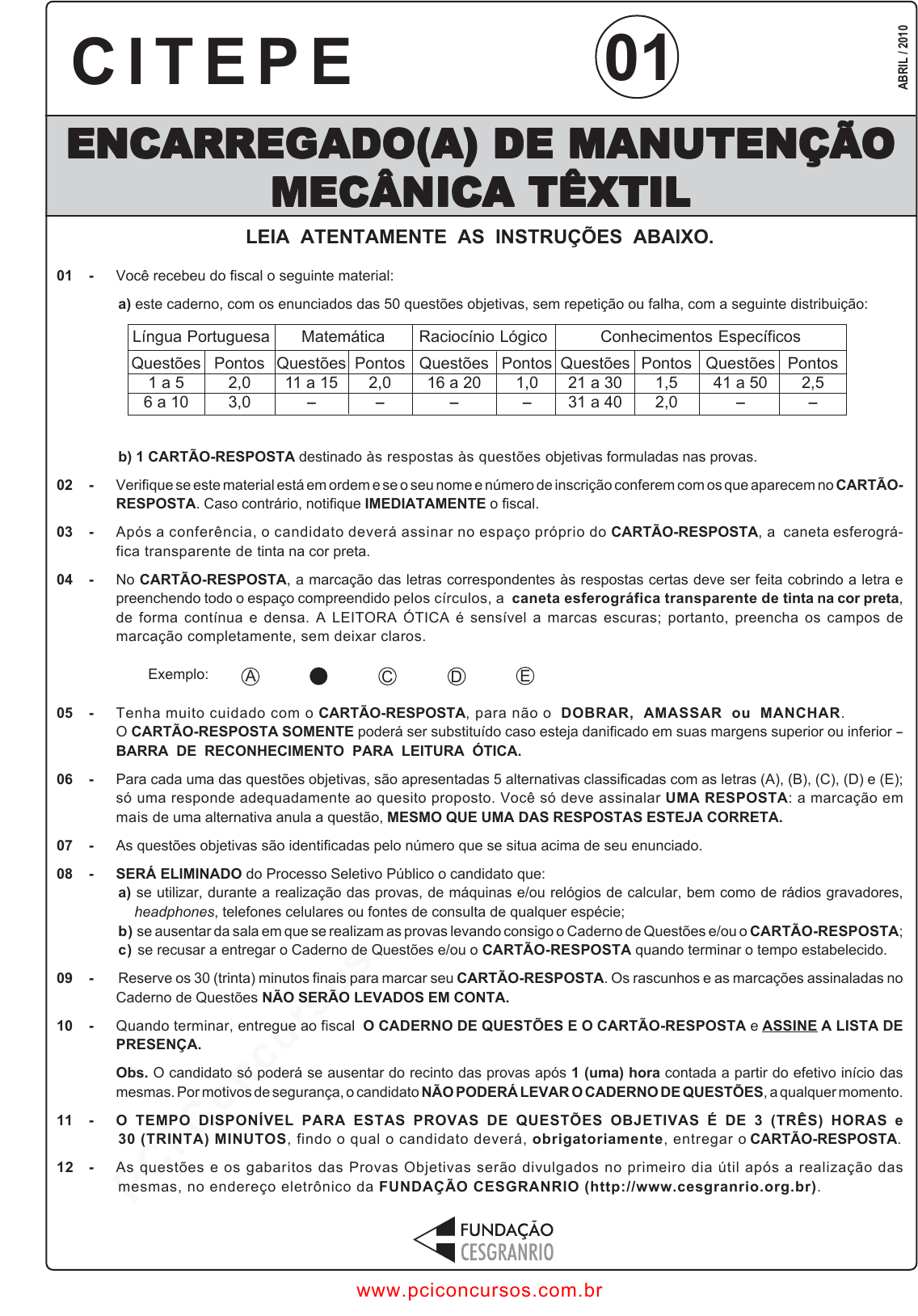 pcimarkpci MDAwMDowMDAwOjAwMDA6MDAwMDowMDAwOmZmZmY6MmQ4YzpjMGE1:U2F0LCAyOCBKdW4gMjAyNSAxMDoxNDozMiAtMDMwMA== www.pciconcursos.com.br ENCARREGADO(A) DE MANUTENÇÃOENCARREGADO(A) DE MANUTENÇÃOENCARREGADO(A) DE MANUTENÇÃOENCARREGADO(A) DE MANUTENÇÃOENCARREGADO(A) DE MANUTENÇÃO MECÂNICA TÊXTILMECÂNICA TÊXTILMECÂNICA TÊXTILMECÂNICA TÊXTILMECÂNICA TÊXTIL AB RI L / 2 01 0 LEIA ATENTAMENTE AS INSTRUÇÕES ABAIXO. 01 - Você recebeu do fiscal o seguinte material: a) este caderno, com os enunciados das 50 questões objetivas, sem repetição ou falha, com a seguinte distribuição: b) 1 CARTÃO-RESPOSTA destinado às respostas às questões objetivas formuladas nas provas. 02 - Verifique se este material está em ordem e se o seu nome e número de inscrição conferem com os que aparecem no CARTÃO- RESPOSTA. Caso contrário, notifique IMEDIATAMENTE o fiscal. 03 - Após a conferência, o candidato deverá assinar no espaço próprio do CARTÃO-RESPOSTA, a caneta esferográ- fica transparente de tinta na cor preta. 04 - No CARTÃO-RESPOSTA, a marcação das letras correspondentes às respostas certas deve ser feita cobrindo a letra e preenchendo todo o espaço compreendido pelos círculos, a caneta esferográfica transparente de tinta na cor preta, de forma contínua e densa. A LEITORA ÓTICA é sensível a marcas escuras; portanto, preencha os campos de marcação completamente, sem deixar claros. Exemplo: A C D E 05 - Tenha muito cuidado com o CARTÃO-RESPOSTA, para não o DOBRAR, AMASSAR ou MANCHAR. O CARTÃO-RESPOSTA SOMENTE poderá ser substituído caso esteja danificado em suas margens superior ou inferior - BARRA DE RECONHECIMENTO PARA LEITURA ÓTICA. 06 - Para cada uma das questões objetivas, são apresentadas 5 alternativas classificadas com as letras (A), (B), (C), (D) e (E); só uma responde adequadamente ao quesito proposto. Você só deve assinalar UMA RESPOSTA: a marcação em mais de uma alternativa anula a questão, MESMO QUE UMA DAS RESPOSTAS ESTEJA CORRETA. 07 - As questões objetivas são identificadas pelo número que se situa acima de seu enunciado. 08 - SERÁ ELIMINADO do Processo Seletivo Público o candidato que: a) se utilizar, durante a realização das provas, de máquinas e/ou relógios de calcular, bem como de rádios gravadores, headphones, telefones celulares ou fontes de consulta de qualquer espécie; b) se ausentar da sala em que se realizam as provas levando consigo o Caderno de Questões e/ou o CARTÃO-RESPOSTA; c) se recusar a entregar o Caderno de Questões e/ou o CARTÃO-RESPOSTA quando terminar o tempo estabelecido. 09 - Reserve os 30 (trinta) minutos finais para marcar seu CARTÃO-RESPOSTA. Os rascunhos e as marcações assinaladas no Caderno de Questões NÃO SERÃO LEVADOS EM CONTA. 10 - Quando terminar, entregue ao fiscal O CADERNO DE QUESTÕES E O CARTÃO-RESPOSTA e ASSINE A LISTA DE PRESENÇA. Obs. O candidato só poderá se ausentar do recinto das provas após 1 (uma) hora contada a partir do efetivo início das mesmas. Por motivos de segurança, o candidato NÃO PODERÁ LEVAR O CADERNO DE QUESTÕES, a qualquer momento. 11 - O TEMPO DISPONÍVEL PARA ESTAS PROVAS DE QUESTÕES OBJETIVAS É DE 3 (TRÊS) HORAS e 30 (TRINTA) MINUTOS, findo o qual o candidato deverá, obrigatoriamente, entregar o CARTÃO-RESPOSTA. 12 - As questões e os gabaritos das Provas Objetivas serão divulgados no primeiro dia útil após a realização das mesmas, no endereço eletrônico da FUNDAÇÃO CESGRANRIO (http://www.cesgranrio.org.br). C I T E P E 01 Questões 1 a 5 6 a 10 Pontos 2,0 3,0 Questões 11 a 15 - Pontos 2,0 - Questões 16 a 20 - Pontos 1,0 - Questões 21 a 30 31 a 40 Pontos 1,5 2,0 Língua Portuguesa Matemática Raciocínio Lógico Conhecimentos Específicos Questões 41 a 50 - Pontos 2,5 - www.pciconcursos.com.br pcimarkpci MDAwMDowMDAwOjAwMDA6MDAwMDowMDAwOmZmZmY6MmQ4YzpjMGE1:U2F0LCAyOCBKdW4gMjAyNSAxMDoxNDozMiAtMDMwMA== www.pciconcursos.com.br ENCARREGADO(A) DE MANUTENÇÃO MECÂNICA TÊXTIL 2 C I T E P E LÍNGUA PORTUGUESA O REPOUSO DAS COISAS Não gosto de escrever um texto e mandá-lo imediatamente para a redação do jornal. Escrevo com certa folga de tempo, para que eu possa deixar o texto dormir um sono reparador antes de jogá-lo às feras. Assim como as pessoas, certas coisas precisam descansar para recomporem-se. No caso do texto, é fundamental para mim esquecê-lo por um pequeno período. Quando volto a pôr os olhos nele, horas ou dias depois, consigo detectar melhor suas falhas, repe- tições ou parágrafos confusos: é a hora da faxina, de limpar o que está sobrando, e só então liberá-lo para seu destino. Lamento pelos vestibulandos que não podem apelar para esse recurso, escrevendo contra o relógio suas redações, sem chance de revisá-las com a cabeça fresca. O repouso das coisas é cada vez mais raro nesse mundo onde todos estão atrasados para alguma coisa. Diariamente, temos que decidir, optar e cumprir prazos para ontem, sem muita chance de deixar as resoluções tirarem uma soneca antes de serem efetivadas. Fica assim prejudicada a clareza necessária para detectar nossos erros e acertos. No calor de uma discussão, levamos a sério todas as bobagens que nos dizem, passando rapidamente para o contra-ataque e assim dinamitando a relação. Se pudéssemos levar nossa mágoa pra cama e com ela dormir, acordaríamos no outro dia enxergando-a sem maquiagem e no tamanho que ela realmente tem: miúda diante de coisas mais importantes do que as palavras rudes que, na noite anterior, escaparam sem querer. Um sim dito às pressas, um não que foi verbalizado por medo, um silêncio onde deveria haver um argumento: vacilos póstumos. Pudéssemos botar para dormir nossas dúvidas, acordaríamos mais sábios e menos impetuosos. Mesmo as paixões velozes merecem um certo resguardo, uma espiada mais distanciada, para ver onde estamos nos metendo. Cadê tempo, porém, para o afastamento necessário de nós mesmos, para melhor nos e