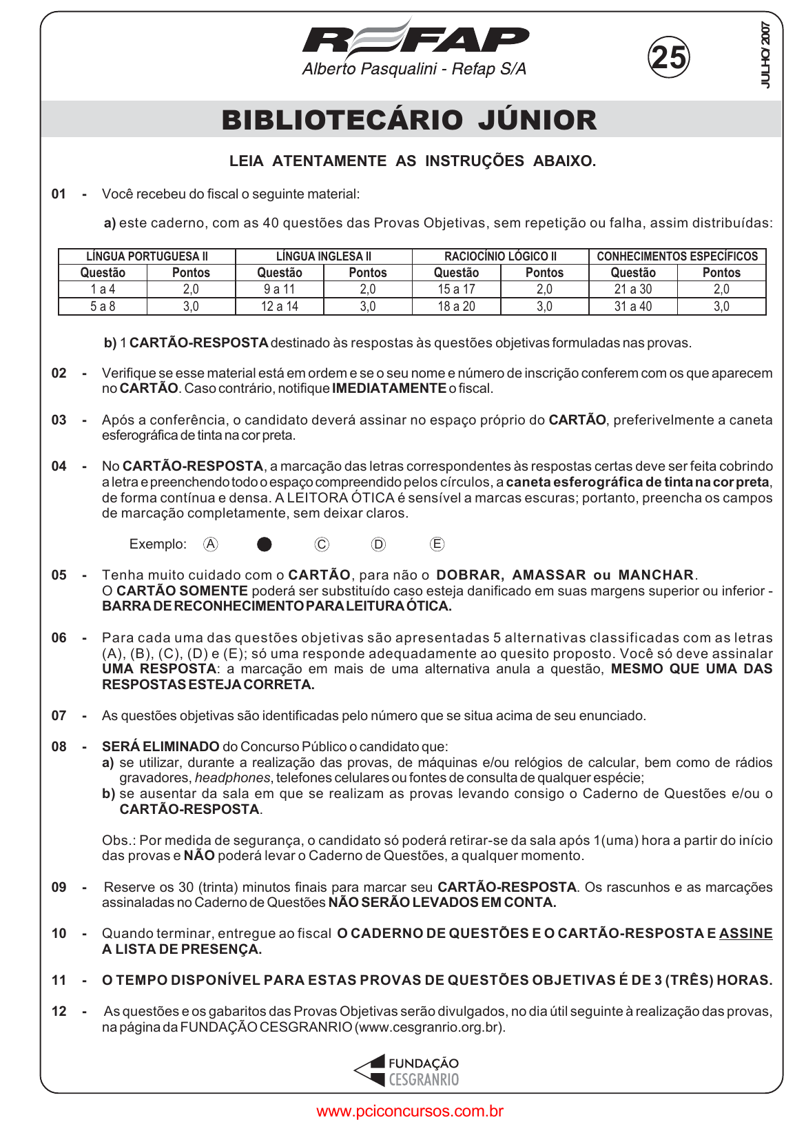 5 e 6. (B) A abordagem do assunto é delimitada no primeiro parágrafo, no qual o autor se posiciona de forma inflexível. (C) Os fatos analisados por Federico Lorca, nos parágrafos 11 a 14, corroboram o aspecto negativo da idéia central. (D) No parágrafo 8, o autor começa a estabelecer restrições ao posicionamento anterior sobre o assunto. (E) A partir do parágrafo 15, o autor reproduz, com isenção, as conclusões a que chegou o poeta espanhol. 10 5 15 20 25 30 35 40 45 50 55 60 65 70 www.pciconcursos.com.br pcimarkpci MDAwMDowMDAwOjAwMDA6MDAwMDowMDAwOmZmZmY6MmQ4YzpjMGE1:U2F0LCAyOCBKdW4gMjAyNSAwOTo1NTo1MyAtMDMwMA== www.pciconcursos.com.br 4 Bibliotecário Júnior 4 O significado da expressão “tratamento tópico” (l. 62) está, no texto, em oposição a: (A) aplicação de medidas superficiais. (B) uso de medicação externa. (C) execução de transformações radicais. (D) colocação em prática de medidas oportunistas. (E) emprego de normas circunstanciais. 5 A seqüência em que a letra x corresponde ao mesmo fonema em todas as palavras é: (A) exonerar – expelir – extinto. (B) sexo – afixar – inexeqüível. (C) exuberante – excitar – exótico. (D) máximo – sintaxe – tórax. (E) exuberante – exumar – exonerar. 6 Assinale a frase em que a parte destacada NÃO atende às regras da norma culta. (A) Todos apóiam a luta sem a qual não há justiça. (B) São válidos os motivos dos quais os ambientalistas se interessam. (C) Não é certo o sacrifício de quem já é discriminado socialmente. (D) Solidariedade é sentimento de que toda a humanidade precisa. (E) É justa a causa pela qual luta o poeta Federico Garcia Lorca. 7 Em “Afinal, Nova York também é lugar de cultura,” (l. 50-51), o termo destacado introduz um novo período, atribuindo a este, em relação ao anterior, a noção de: (A) explicação. (B) conclusão. (C) finalização. (D) oposição. (E) condição. 8 Assinale a opção em que o par de orações NÃO apresenta transformação da voz verbal. (A) “ ‘O que eu fiz, nenhum bicho jamais faria.’ ” (l. 14) / O que foi feito por mim não teria sido feito por nenhum bicho. (B) “O poeta espanhol Federico Garcia Lorca... ficou assus- tado com Nova York.” (l. 26-28) / O poeta espanhol Federico Garcia Lorca foi assustado por Nova York. (C) “Enquanto os turistas admiram a qualidade da comida nos magníficos restaurantes,” (l. 31-32) / Enquanto a qualidade da comida é admirada pelos turistas nos magníficos restaurantes. (D) “Lorca interpela os que se beneficiam com esse siste- ma,” (l. 39-40) / Os que se beneficiam com esse sistema são interpelados por Lorca. (E) (Lorca) “Acusa os detentores do poder e da riqueza de camuflarem a dura realidade social...” (l. 44-45) / Os detentores do poder e da riqueza são acusados por Lorca de camuflarem a realidade social. LÍNGUA INGLESA II REPORT: BIOFUELS POISED TO DISPLACE OIL Biofuels such as ethanol and biodiesel can significantly reduce global dependence on oil, according to a new report by the Worldwatch Institute. Last year, world biofuel production surpassed 670,000 barrels per day, the equivalent of about 1 percent of the global transport fuel market. Although oil still accounts for more than 96 percent of transport fuel use, biofuel production has doubled since 2001 and is poised for even stronger growth as the industry responds to higher fuel prices and supportive government policies. “Coordinated action to expand biofuel markets and advance new technologies could relieve pressure on oil prices while strengthening agricultural economies and reducing climate- altering emissions,” says Worldwatch Institute President Christopher Flavin. Brazil is the world’s biofuel leader, with half of its sugar cane crop providing more than 40 percent of its non- diesel transport fuel. In the United States, where 15 percent of the corn crop provides about 2 percent of the non-diesel transport fuel, ethanol production is growing even more rapidly. This surging growth may allow the U.S. to overtake Brazil as the world’s biofuel leader this year. Both countries are now estimated to be producing ethanol at less than the current cost of gasoline. Figures cited in the report reveal that biofuels could provide 37 percent of U.S. transport fuel within the next 25 years, and up to 75 percent if automobile fuel economy doubles. Biofuels could replace 20–30 percent of the oil used in European Union countries during the same time frame. As the first-ever global assessment of the potential social and environmental impacts of biofuels, Biofuels for Transportation warns that the large-scale use of biofuels carries significant agricultural and ecological risks. “It is essential that government incentives be used to minimize competition between food and fuel crops and to discourage expansion onto ecologically valuable lands,” says Worldwatch Biofuels Project Manager Suzanne Hunt. However, the report also finds that biofuels have the potential to increase energy security, create new economic opportunities in rural areas, and reduce local pollution and emissions of greenhouse gases. The long-term potential of biofuels is in the use of non-food feedstock that include agricultural, municipal, and forestry wastes as well as fast-growing, cellulose-rich energy crops such as switchgrass. It is expected that the combination of cellulosic biomass resources and “next- generation” biofuel conversion technologies will compete with conventional gasoline and diesel fuel without subsidies in the medium term. The report recommends policies to accelerate the development of biofuels, while maximizing the benefits and minimizing the risks. Recommendations include: strengthening the market (i.e. focusing on market development, infrastructure development, and the building of transportation fleets that are able to use the new fuels), speeding the transition to next-generation technologies allowing for dra