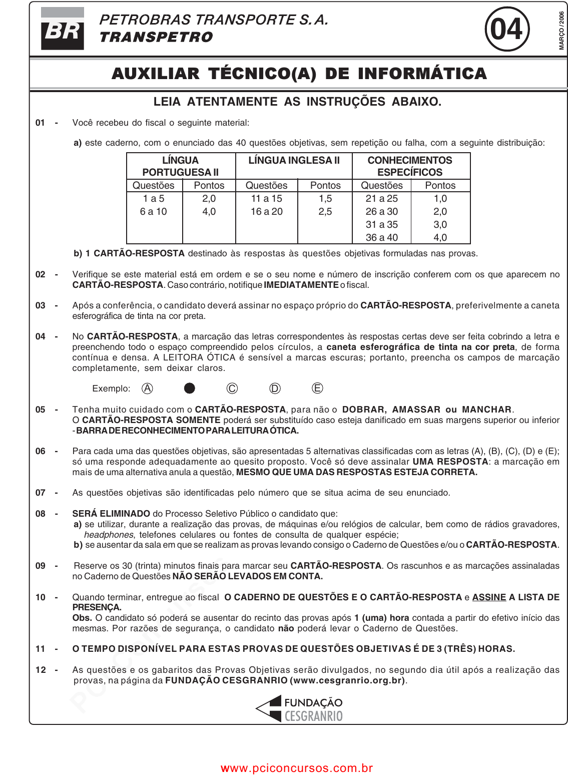 pcimarkpci MDAwMDowMDAwOjAwMDA6MDAwMDowMDAwOmZmZmY6MmQ4YzpjMGE1:U2F0LCAyOCBKdW4gMjAyNSAwOTo1NDoyOSAtMDMwMA== www.pciconcursos.com.br M A R Ç O / 20 06 LEIA ATENTAMENTE AS INSTRUÇÕES ABAIXO. 01 - Você recebeu do fiscal o seguinte material: a) este caderno, com o enunciado das 40 questões objetivas, sem repetição ou falha, com a seguinte distribuição: b) 1 CARTÃO-RESPOSTA destinado às respostas às questões objetivas formuladas nas provas. 02 - Verifique se este material está em ordem e se o seu nome e número de inscrição conferem com os que aparecem no CARTÃO-RESPOSTA. Caso contrário, notifique IMEDIATAMENTE o fiscal. 03 - Após a conferência, o candidato deverá assinar no espaço próprio do CARTÃO-RESPOSTA, preferivelmente a caneta esferográfica de tinta na cor preta. 04 - No CARTÃO-RESPOSTA, a marcação das letras correspondentes às respostas certas deve ser feita cobrindo a letra e preenchendo todo o espaço compreendido pelos círculos, a caneta esferográfica de tinta na cor preta, de forma contínua e densa. A LEITORA ÓTICA é sensível a marcas escuras; portanto, preencha os campos de marcação completamente, sem deixar claros. Exemplo: 05 - Tenha muito cuidado com o CARTÃO-RESPOSTA, para não o DOBRAR, AMASSAR ou MANCHAR. O CARTÃO-RESPOSTA SOMENTE poderá ser substituído caso esteja danificado em suas margens superior ou inferior -BARRA DE RECONHECIMENTO PARA LEITURA ÓTICA. 06 - Para cada uma das questões objetivas, são apresentadas 5 alternativas classificadas com as letras (A), (B), (C), (D) e (E); só uma responde adequadamente ao quesito proposto. Você só deve assinalar UMA RESPOSTA: a marcação em mais de uma alternativa anula a questão, MESMO QUE UMA DAS RESPOSTAS ESTEJA CORRETA. 07 - As questões objetivas são identificadas pelo número que se situa acima de seu enunciado. 08 - SERÁ ELIMINADO do Processo Seletivo Público o candidato que: a) se utilizar, durante a realização das provas, de máquinas e/ou relógios de calcular, bem como de rádios gravadores, headphones, telefones celulares ou fontes de consulta de qualquer espécie; b) se ausentar da sala em que se realizam as provas levando consigo o Caderno de Questões e/ou o CARTÃO-RESPOSTA. 09 - Reserve os 30 (trinta) minutos finais para marcar seu CARTÃO-RESPOSTA. Os rascunhos e as marcações assinaladas no Caderno de Questões NÃO SERÃO LEVADOS EM CONTA. 10 - Quando terminar, entregue ao fiscal O CADERNO DE QUESTÕES E O CARTÃO-RESPOSTA e ASSINE A LISTA DE PRESENÇA. Obs. O candidato só poderá se ausentar do recinto das provas após 1 (uma) hora contada a partir do efetivo início das mesmas. Por razões de segurança, o candidato não poderá levar o Caderno de Questões. 11 - O TEMPO DISPONÍVEL PARA ESTAS PROVAS DE QUESTÕES OBJETIVAS É DE 3 (TRÊS) HORAS. 12 - As questões e os gabaritos das Provas Objetivas serão divulgados, no segundo dia útil após a realização das provas, na página da FUNDAÇÃO CESGRANRIO (www.cesgranrio.org.br). A C D E AUXILIAR TÉCNICO(A) DE INFORMÁTICA 04 LÍNGUA PORTUGUESA II Questões 1 a 5 6 a 10 Pontos 2,0 4,0 LÍNGUA INGLESA II Questões 11 a 15 16 a 20 Pontos 1,5 2,5 CONHECIMENTOS ESPECÍFICOS Questões 21 a 25 26 a 30 31 a 35 36 a 40 Pontos 1,0 2,0 3,0 4,0 www.pciconcursos.com.br www.pciconcursos.com.br www.pciconcursos.com.br pcimarkpci MDAwMDowMDAwOjAwMDA6MDAwMDowMDAwOmZmZmY6MmQ4YzpjMGE1:U2F0LCAyOCBKdW4gMjAyNSAwOTo1NDoyOSAtMDMwMA== www.pciconcursos.com.br PROVA 04 - AUXILIAR TÉCNICO(A) DE INFORMÁTICA 2 www.pciconcursos.com.br www.pciconcursos.com.br www.pciconcursos.com.br pcimarkpci MDAwMDowMDAwOjAwMDA6MDAwMDowMDAwOmZmZmY6MmQ4YzpjMGE1:U2F0LCAyOCBKdW4gMjAyNSAwOTo1NDoyOSAtMDMwMA== www.pciconcursos.com.br PROVA 04 - AUXILIAR TÉCNICO(A) DE INFORMÁTICA 3 LÍNGUA PORTUGUESA II A INTERNET NÃO É RINGUE Você já discutiu relação por e-mail? Não discuta. O correio eletrônico é uma arma de destruição de massa (cerebral) em caso de conflito. Quer discutir? Quer quebrar o pau, dizer tudo o que sente, mandar ver, detonar a outra parte? Faça isso a sós, em ambiente fechado. [...] Brigar por e-mail é muito perigoso. Existe pelo menos um par de boas razões para isso. A primeira é que você não está na frente da pessoa. Ela não é “humana” a distância, ela é a soma de todos os defeitos. A segunda razão é que você mesmo também perde a dimensão de sua própria humanidade. Pelo e-mail as emoções ficam no freezer e a cabeça, no microondas. Ao vivo, um olhar ou um sorriso fazem toda a diferença. No e-mail todo mundo localiza “risos”, mas ninguém descreve “choro”. Eu sei disso, porque cometi esse erro. Várias vezes. Nunca mais cometerei, espero. [...] Um tiroteio de mensagens escritas tende à catástrofe. Quando você fala na cara, as palavras ficam no ar e na memória e uma hora acabam sumindo de ambos. “Eu não me lembro de ter dito isso” é um bom argumento para esfriar as tensões. Palavras escritas ficam. Podem ser relidas muitas vezes. Ao vivo, você agüenta berros [...]. Responde no mesmo tom rasteiro. E segue em frente. Por e-mail, cada frase ofensiva tende a ser encarada como um desafio para que a outra parte escolha a arma mais poderosa destinada ao ponto mais fraco do “adversário”. Essa resposta letal gera uma contra-resposta capaz de abalar os alicerces do edifício, o que exigirá uma contra-contra-resposta surpreendente e devastadora. Assim funciona o ser humano, seja com mensagens, seja com bombas nucleares. Ao vivo, um pode sentir a fraqueza do outro e even- tualmente ter o nobre gesto de poupar aquelas trilhas de sofrimento e rancor. Ao vivo, o coração comanda. Por e-mail é o cérebro que dá as cartas. [...] E tem o fator fermentação. Você recebe um e-mail hostil. Passa horas intermináveis imaginando qual será a terrível, destrutiva resposta que vai dar. Seu cérebro ferve com os verbos contundentes e adjetivos cruéis que serão usados no reply. Aí você escre