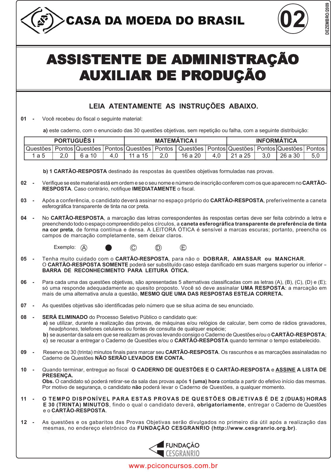 pcimarkpci MDAwMDowMDAwOjAwMDA6MDAwMDowMDAwOmZmZmY6MmQ4YzpjMGE1:U2F0LCAyOCBKdW4gMjAyNSAwOTo0ODowMCAtMDMwMA== www.pciconcursos.com.br LEIA ATENTAMENTE AS INSTRUÇÕES ABAIXO. 01 - Você recebeu do fiscal o seguinte material: a) este caderno, com o enunciado das 30 questões objetivas, sem repetição ou falha, com a seguinte distribuição: b) 1 CARTÃO-RESPOSTA destinado às respostas às questões objetivas formuladas nas provas. 02 - Verifique se este material está em ordem e se o seu nome e número de inscrição conferem com os que aparecem no CARTÃO- RESPOSTA. Caso contrário, notifique IMEDIATAMENTE o fiscal. 03 - Após a conferência, o candidato deverá assinar no espaço próprio do CARTÃO-RESPOSTA, preferivelmente a caneta esferográfica transparente de tinta na cor preta. 04 - No CARTÃO-RESPOSTA, a marcação das letras correspondentes às respostas certas deve ser feita cobrindo a letra e preenchendo todo o espaço compreendido pelos círculos, a caneta esferográfica transparente de preferência de tinta na cor preta, de forma contínua e densa. A LEITORA ÓTICA é sensível a marcas escuras; portanto, preencha os campos de marcação completamente, sem deixar claros. Exemplo: A C D E 05 - Tenha muito cuidado com o CARTÃO-RESPOSTA, para não o DOBRAR, AMASSAR ou MANCHAR. O CARTÃO-RESPOSTA SOMENTE poderá ser substituído caso esteja danificado em suas margens superior ou inferior - BARRA DE RECONHECIMENTO PARA LEITURA ÓTICA. 06 - Para cada uma das questões objetivas, são apresentadas 5 alternativas classificadas com as letras (A), (B), (C), (D) e (E); só uma responde adequadamente ao quesito proposto. Você só deve assinalar UMA RESPOSTA: a marcação em mais de uma alternativa anula a questão, MESMO QUE UMA DAS RESPOSTAS ESTEJA CORRETA. 07 - As questões objetivas são identificadas pelo número que se situa acima de seu enunciado. 08 - SERÁ ELIMINADO do Processo Seletivo Público o candidato que: a) se utilizar, durante a realização das provas, de máquinas e/ou relógios de calcular, bem como de rádios gravadores, headphones, telefones celulares ou fontes de consulta de qualquer espécie; b) se ausentar da sala em que se realizam as provas levando consigo o Caderno de Questões e/ou o CARTÃO-RESPOSTA; c) se recusar a entregar o Caderno de Questões e/ou o CARTÃO-RESPOSTA quando terminar o tempo estabelecido. 09 - Reserve os 30 (trinta) minutos finais para marcar seu CARTÃO-RESPOSTA. Os rascunhos e as marcações assinaladas no Caderno de Questões NÃO SERÃO LEVADOS EM CONTA. 10 - Quando terminar, entregue ao fiscal O CADERNO DE QUESTÕES E O CARTÃO-RESPOSTA e ASSINE A LISTA DE PRESENÇA. Obs. O candidato só poderá retirar-se da sala das provas após 1 (uma) hora contada a partir do efetivo início das mesmas. Por motivo de segurança, o candidato não poderá levar o Caderno de Questões, a qualquer momento. 11 - O TEMPO DISPONÍVEL PARA ESTAS PROVAS DE QUESTÕES OBJETIVAS É DE 2 (DUAS) HORAS E 30 (TRINTA) MINUTOS, findo o qual o candidato deverá, obrigatoriamente, entregar o Caderno de Questões e o CARTÃO-RESPOSTA. 12 - As questões e os gabaritos das Provas Objetivas serão divulgados no primeiro dia útil após a realização das mesmas, no endereço eletrônico da FUNDAÇÃO CESGRANRIO (http://www.cesgranrio.org.br). ASSISTENTE DE ADMINISTRAÇÃOASSISTENTE DE ADMINISTRAÇÃOASSISTENTE DE ADMINISTRAÇÃOASSISTENTE DE ADMINISTRAÇÃOASSISTENTE DE ADMINISTRAÇÃO AAAAAUXILIAR DE PRUXILIAR DE PRUXILIAR DE PRUXILIAR DE PRUXILIAR DE PRODUÇÃOODUÇÃOODUÇÃOODUÇÃOODUÇÃO DE ZE MB RO / 2 00 9 02 PORTUGUÊS I MATEMÁTICA I Questões 1 a 5 Pontos 2,0 Questões 6 a 10 Pontos 4,0 Questões 11 a 15 Pontos 2,0 Questões 16 a 20 Pontos 4,0 Questões 21 a 25 Pontos 3,0 Questões 26 a 30 Pontos 5,0 INFORMÁTICA www.pciconcursos.com.br pcimarkpci MDAwMDowMDAwOjAwMDA6MDAwMDowMDAwOmZmZmY6MmQ4YzpjMGE1:U2F0LCAyOCBKdW4gMjAyNSAwOTo0ODowMCAtMDMwMA== www.pciconcursos.com.br ASSISTENTE DE ADMINISTRAÇÃO AUXILIAR DE PRODUÇÃO 2 www.pciconcursos.com.br pcimarkpci MDAwMDowMDAwOjAwMDA6MDAwMDowMDAwOmZmZmY6MmQ4YzpjMGE1:U2F0LCAyOCBKdW4gMjAyNSAwOTo0ODowMCAtMDMwMA== www.pciconcursos.com.br 3 ASSISTENTE DE ADMINISTRAÇÃO AUXILIAR DE PRODUÇÃO PORTUGUÊS I 10 5 15 20 25 30 35 40 45 Às vezes me perguntam o porquê dessa nossa quase obsessiva preocupação com açudes: açude encheu, açude está seco, açude sangrou. Mas é isso mesmo: no Nordeste, o açude é o núcleo, o coração da fazenda. Fazenda sem açude é um casco morto, sem gado, sem moradores, sem plantio. O açude é o símbolo da riqueza do fazendeiro – ou da sua ruína. O velho açude do Junco, por exemplo. Mas antes devo dizer o que é – ou o que foi – o Junco. Neste mundo tão grande, nunca houve pedaço de terra que tenha sido mais preso ao meu coração do que aquele trecho bravio do município de Quixadá. E engraçado é que não nasci lá. Contudo, decerto andava por lá antes de nascer (já contei essas coisas de outras vezes, mas, afinal, só tenho uma história). O Junco é, ou foi, uma fazenda à velha moda do Nordeste (embora hoje já muito alterada e dividida), com matas de caatinga subindo e descendo por cabeços cobertos de pedregulho, vastos campestres de capim- panasco, coroas férteis de riacho, lagoas que secam no verão (tudo, aliás, ali, seca no verão). Tudo seca, menos o açude. À direita da casa-grande – a casa velha – se estende o prato de água que, dantes, era a única fonte de vida dos homens, dos bichos e das plantas. (Hoje lá existe também um açude novo, maior e talvez mais bonito do que o velho.) Mas aquele, o ‘meu açude’, foi feito por mão de escravos. Fez-se a parede devagarinho, em anos. Antes aquilo era uma lagoa, alimentada por sete riachos, que só correm no inverno. Assim, aos poucos, o dono foi levantando uma barragem, procurando armazenar mais água; construía sem projeto no papel, meio ao acaso, que o lugar nem era próprio para açude: uma 