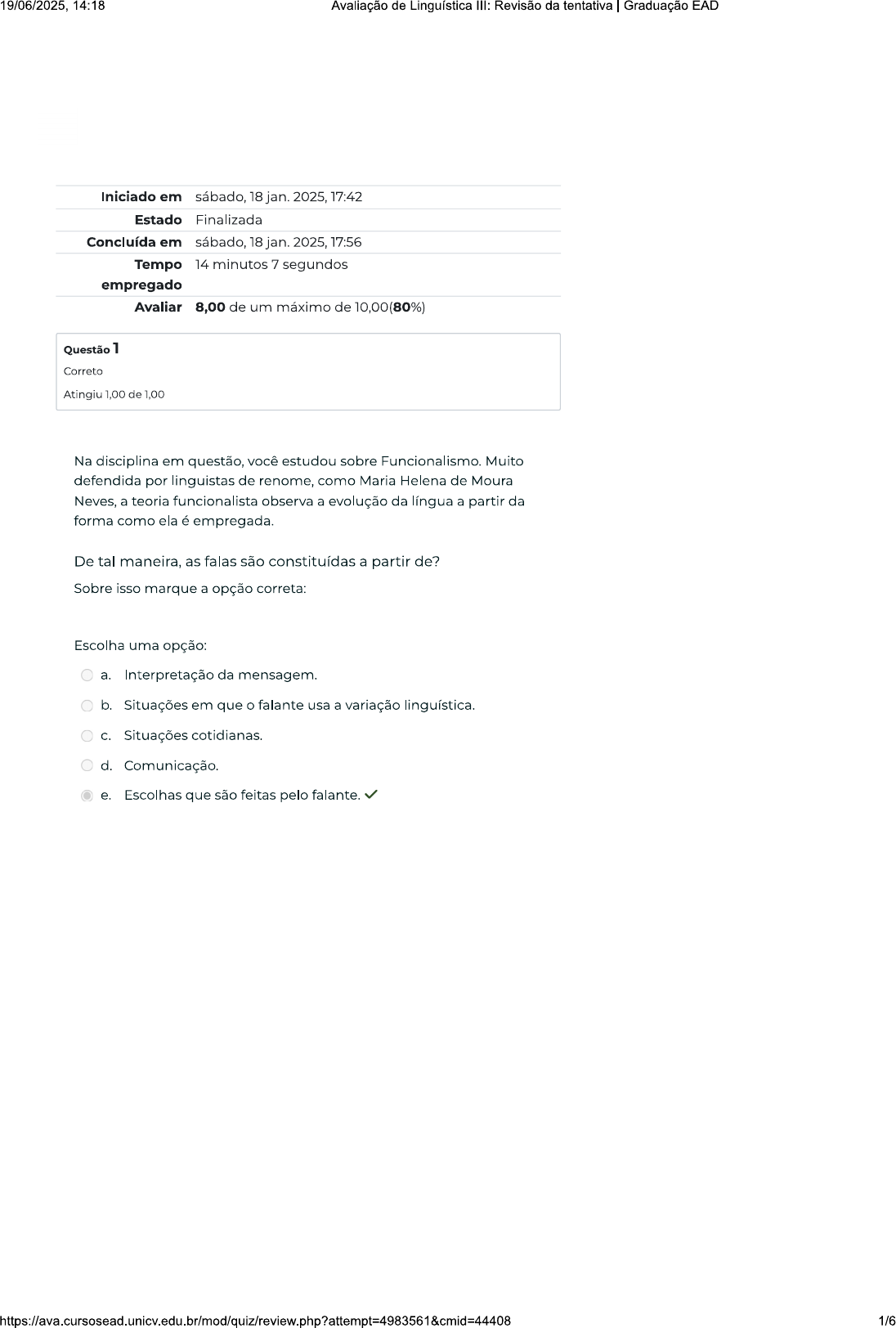 19/06/2025, 14:18 Avaliação de Linguística III: Revisão da tentativa Graduação EAD Iniciado em sábado, 18 jan. 2025, 17:42 Estado Finalizada Concluída em sábado, 18 jan. 2025, 17:56 Tempo 14 minutos 7 segundos empregado Avaliar 8,00 de um máximo de 10,00(80%) Questão 1 Correto Atingiu 1,00 de 1,00 Na disciplina em questão, você estudou sobre Funcionalismo. Muito defendida por linguistas de renome, como Maria Helena de Moura Neves, a teoria funcionalista observa a evolução da língua a partir da forma como ela é empregada. De tal maneira, as falas são constituídas a partir de? Sobre isso marque a opção correta: Escolha uma opção: a. Interpretação da mensagem. b. Situações em que falante usa a variação linguística. C. Situações cotidianas. d. Comunicação. e. Escolhas que são feitas pelo falante. https://ava.cursosead.unicv.edu.br/mod/quiz/review.php?attempt=4983561&cmid=44408 1/619/06/2025, 14:18 Avaliação de Linguística III: Revisão da tentativa Graduação EAD Questão 2 Correto Atingiu 1,00 de 1,00 As figuras de construção são definidas por Martino (2018, 278) como aquelas que "trabalham a construção da frase". São elas: o anacoluto, a anáfora, apóstrofo, assíndeto, a elipse, hipérbato, pleonasmo, polissíndeto, a silepse e a zeugma. anacoluto é? Diante do exposto, marque a opção correta: Escolha uma opção: a. A mudança repentina no significado da palavra. b. A mudança fonética das letras. C. A mudança no sentido do texto. d. A mudança repentina na estrutura da frase. e. A mudança na ordem da frase. Questão 3 Correto Atingiu 1,00 de 1,00 Segundo Marcuchi (2006, p.48) a hesitação é intrínseca à competência comunicativa em contextos interativos de natureza oral e não uma disfunção do falante. Diante desse conceito, podemos dizer que a hesitação indica que: Diante do exposto, marque a opção correta: Escolha uma opção: a. São pausas planejadas que falante introduz ao diálogo alegoricamente b. falante se perdeu em seu raciocínio C. falante entrou em contradição em sua fala d. Há falta de habilidade por parte do falante em se fazer entender e. falante está organizando seu texto ao mesmo tempo em que produz 2/619/06/2025, 14:18 Avaliação de Linguística III: Revisão da tentativa Graduação EAD Questão 4 Correto Atingiu 1,00 de 1,00 Na disciplina em questão, você estudou sobre Figuras de Construção ou de Sintaxe. pleonasmo é definido pela repetição de uma palavra ou ideia contida nela para que significado seja intensificado. Quais dos exemplos abaixo apresentam um pleonasmo? A esse respeito, marque a opção correta: Escolha uma opção: a. "O que berço dá só a cova tira (Machado de Assis)". b. "A vida é um grande jogo e destino, um parceiro temível (Érico Veríssimo). C. "O povo se uniu e gritavam alto na d. "As ondas vão e vêm, e vão e são como tempo (Lulu Santos)". e. "Chovia uma triste chuva de resignação (Manuel Bandeira)" Questão 5 Incorreto Atingiu 0,00 de 1,00 Conforme informações disponibilizadas no seu material de estudo, a Teoria da Argumentação na Língua TAL é uma teoria semântica de interpretação do sentido dos enunciados. Analise as seguintes afirmativas: Está estritamente ligada à intenção dos autores em elaborar uma teoria que fosse de encontro à teoria tradicional do sentido Para Ducrot uma teoria que afirma ter sentido do discurso tem três tipos de indicações: objetivo, subjetivo e intersubjetivo. sentido objetivo diz respeito à fala do mundo exterior com imparcialidade. sentido subjetivo é a posição que locutor assume diante daquilo que entende. sentido intersubjetivo é a relação mantida pelo locutor com a mensagem. A esse respeito, assinale a alternativa correta: Escolha uma opção: a. V-V-V-F-F b. V-V-V-V-V C. F-F-F-F-V d. F-V-F-F-F e. V-F-V-F-V 3/619/06/2025, 14:18 Avaliação de Linguística III: Revisão da tentativa Graduação EAD Questão 6 Correto Atingiu 1,00 de 1,00 Na análise do discurso de um texto, podem ser observadas as projeções das enunciações nos enunciados. Ao realizar esse trabalho, se observam ainda os recursos de persuasão que são utilizados para construir aquilo que se quer passar como verdade no conteúdo textual. Um exemplo de análise que pode ser realizada é uso das categorias de pessoa, tempo e espaço, que no discurso não são necessariamente as mesmas da enunciação. Com base nesta informação analise as asserções abaixo: I. A análise do discurso textual ganha relevância por explicar os sentidos dos textos e como eles se articulam na sociedade. PORQUE II. Ela serve para que leitor possa refletir e entender com mais clareza as mensagens que são passadas. A respeito dessas asserções, assinale a opção correta: Escolha uma opção: a. As asserções e II são proposições verdadeiras e a II é uma justificativa correta da I. b. A asserção é uma proposição verdadeira e a II é uma proposição falsa. C. A asserção é uma proposição falsa e a é uma proposição verdadeira. d. As asserções e são proposições verdadeiras, mas a II não é uma justificativa correta da I. e. As asserções I e II são proposições falsas. 4/619/06/2025, 14:18 Avaliação de Linguística III: Revisão da tentativa Graduação EAD Questão 7 Correto Atingiu 1,00 de 1,00 Conforme informações disponibilizadas no seu material de estudo, os marcadores conversacionais desempenham um papel análogo ao da pontuação e da organização dos parágrafos na escrita. É uma função de delimitação de fala nas unidades, ou seja, indica início da fala de alguém ou final. Os marcadores também ajudam a gerenciar a participação dos interlocutores. Sendo assim, é correto dizer que: A esse respeito, assinale a alternativa correta: Escolha uma opção: a. Os marcadores organizam diálogo e sinalizam a interação entre os interlocutores b. Os marcadores organizam diálogo, mas não colaboram para a interação dos int