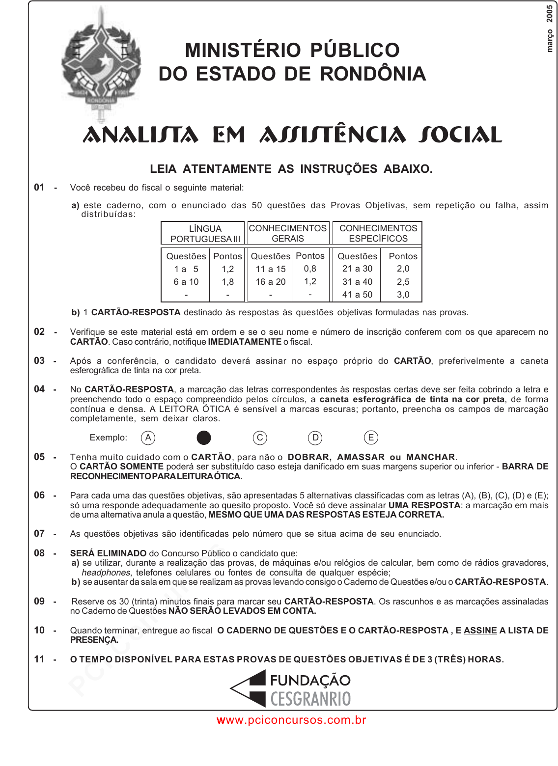 pcimarkpci MDAwMDowMDAwOjAwMDA6MDAwMDowMDAwOmZmZmY6MmQ4YzpjMGE1:U2F0LCAyOCBKdW4gMjAyNSAwOTo0MjoyMyAtMDMwMA== www.pciconcursos.com.br ��������� � � ������ ����� ������ m ar ço 20 05 LEIA ATENTAMENTE AS INSTRUÇÕES ABAIXO. 01 - Você recebeu do fiscal o seguinte material: a) este caderno, com o enunciado das 50 questões das Provas Objetivas, sem repetição ou falha, assim distribuídas: b) 1 CARTÃO-RESPOSTA destinado às respostas às questões objetivas formuladas nas provas. 02 - Verifique se este material está em ordem e se o seu nome e número de inscrição conferem com os que aparecem no CARTÃO. Caso contrário, notifique IMEDIATAMENTE o fiscal. 03 - Após a conferência, o candidato deverá assinar no espaço próprio do CARTÃO, preferivelmente a caneta esferográfica de tinta na cor preta. 04 - No CARTÃO-RESPOSTA, a marcação das letras correspondentes às respostas certas deve ser feita cobrindo a letra e preenchendo todo o espaço compreendido pelos círculos, a caneta esferográfica de tinta na cor preta, de forma contínua e densa. A LEITORA ÓTICA é sensível a marcas escuras; portanto, preencha os campos de marcação completamente, sem deixar claros. Exemplo: A B C D E 05 - Tenha muito cuidado com o CARTÃO, para não o DOBRAR, AMASSAR ou MANCHAR. O CARTÃO SOMENTE poderá ser substituído caso esteja danificado em suas margens superior ou inferior - BARRA DE RECONHECIMENTO PARA LEITURA ÓTICA. 06 - Para cada uma das questões objetivas, são apresentadas 5 alternativas classificadas com as letras (A), (B), (C), (D) e (E); só uma responde adequadamente ao quesito proposto. Você só deve assinalar UMA RESPOSTA: a marcação em mais de uma alternativa anula a questão, MESMO QUE UMA DAS RESPOSTAS ESTEJA CORRETA. 07 - As questões objetivas são identificadas pelo número que se situa acima de seu enunciado. 08 - SERÁ ELIMINADO do Concurso Público o candidato que: a) se utilizar, durante a realização das provas, de máquinas e/ou relógios de calcular, bem como de rádios gravadores, headphones, telefones celulares ou fontes de consulta de qualquer espécie; b) se ausentar da sala em que se realizam as provas levando consigo o Caderno de Questões e/ou o CARTÃO-RESPOSTA. 09 - Reserve os 30 (trinta) minutos finais para marcar seu CARTÃO-RESPOSTA. Os rascunhos e as marcações assinaladas no Caderno de Questões NÃO SERÃO LEVADOS EM CONTA. 10 - Quando terminar, entregue ao fiscal O CADERNO DE QUESTÕES E O CARTÃO-RESPOSTA , E ASSINE A LISTA DE PRESENÇA. 11 - O TEMPO DISPONÍVEL PARA ESTAS PROVAS DE QUESTÕES OBJETIVAS É DE 3 (TRÊS) HORAS. MINISTÉRIO PÚBLICO DO ESTADO DE RONDÔNIA CONHECIMENTOS GERAIS Questões 11 a 15 16 a 20 - Pontos 0,8 1,2 - CONHECIMENTOS ESPECÍFICOS Questões 21 a 30 31 a 40 41 a 50 Pontos 2,0 2,5 3,0 LÍNGUA PORTUGUESA III Questões 1 a 5 6 a 10 - Pontos 1,2 1,8 - wwwwwww.pciconcursos.com.br pcimarkpci MDAwMDowMDAwOjAwMDA6MDAwMDowMDAwOmZmZmY6MmQ4YzpjMGE1:U2F0LCAyOCBKdW4gMjAyNSAwOTo0MjoyMyAtMDMwMA== www.pciconcursos.com.br ANALISTA EM ASSISTÊNCIA SOCIAL 2 Levei minha moto para ser consertada em uma pequena oficina no centro de Genebra. O mecânico abriu uma agenda (como as de médico) e me instruiu para que em oito dias voltasse com a moto às 2h e que fos- se buscá-la às 3h15min. E assim foi. Ainda naquela re- gião, procurei um carpinteiro. Sem olhar a agenda, ele foi logo dizendo que estava ocupado pelos próximos três meses. Contudo, havia uma chance no fim de sema- na seguinte. Se chovesse, nada feito, não se abre telha- do com chuva. Se fizesse sol, ele ia escalar um pico próximo. Mas, se o tempo estivesse nublado, aí talvez fosse possível. As cartas estavam na mesa, com toda a sinceridade. Um professor chinês em Yale, segurando a xícara de café, ficava olhando o ponteiro de segundos do relógio da sala de aula. Quando marcava 8h em ponto, começava a aula.[...] Nos Estados Unidos, é prática corrente lojas e oficinas darem um prazo máximo para a entrega dos serviços. Em geral, terminam antes. Mas o cliente planeja sua vida para o prazo máximo. Aqui em Pindorama vivemos numa sociedade que mescla o melhor e o pior do respeito pelo tempo. Eu tinha um amigo radicado nos Estados Unidos. Na época em que morou no Rio, ele costumava marcar com seus colegas de tênis partidas para o dia seguinte. Não apareciam ou chegavam atrasados. Voltando a Washington, passou a marcar partidas com mais de três meses de antecedência. Na hora aprazada, estavam todos lá. Na Esplanada dos Ministérios, em Brasília, a conferência marcada para as 10h começará em horas di ferentes, dependendo do ministér io. No Itamaraty, começa na hora. Na área econômica, cabem alguns minutos de tolerância. Na área social, estão todos muito ocupados, e meia hora de atraso não é incomum. Curioso, os ministérios mais eficazes são aqueles em que as reuniões começam na hora. Quem marca com o consertador do computador, da televisão, da pia ou da máquina de lavar terá uma surpresa se a criatura vier – e mais ainda se chegar na hora marcada. Já nas empresas modernas, a chance de andar no horário é bem maior.[...] Tais exemplos dizem o que todos já sabem, pelo menos na teoria: tempo é dinheiro. A riqueza é resultante do trabalho. O trabalho é a aplicação do tempo em atividades produtivas. Quanto mais tempo se perde por desorganização ou esperando pelos outros, menos tempo se utiliza produzindo e menos riqueza é gerada. E isso sem ganhar em lazer.[...] LÍNGUA PORTUGUESA III O tempo do desenvolvimento O respeito pelo tempo dos outros aumenta a produtividade social, pois o tempo de todos não é desperdiçado pelas esperas. Aliás, fazer com antece- dência é mais rápido e mais barato. Planejamento é isso. O tempo do desenvolvimento é o aprendizado social de estruturar o tempo de cada um e cada um não atrapalhar o tempo dos outros. CASTRO, Claudio de Moura, Revista V