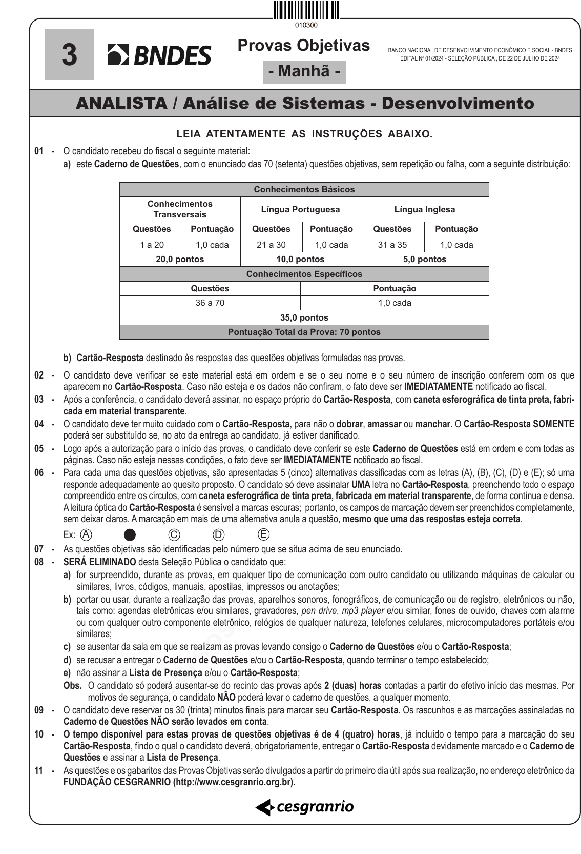 a) este Caderno de Questões, com o enunciado das 70 (setenta) questões objetivas, sem repetição ou falha, com a seguinte distribuição: