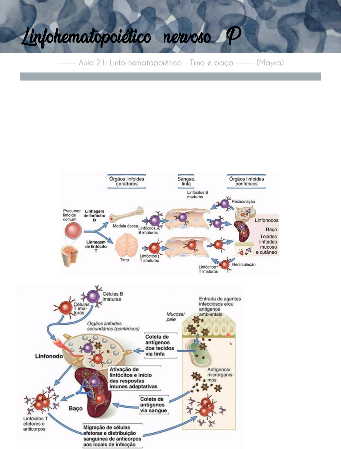 + – III ------ Aula 21: Linfo-hematopoiético - Timo e baço ------ (Mayra) Componentes e funções - Órgãos linfoides primários: o Medula óssea: produção de leucócitos, da linhagem vermelha e das células tronco o Timo o Bursa de Fabricius/bolsa cloacal (nos mamíferos, a maturação e diferenciação de linfócitos B é feita na medula óssea, enquanto nas aves é feita na Bursa de Fabricius) - Órgãos linfoides secundários o Baço (maior órgão linfoide do organismo) o Linfonodos o Tecidos linfoides em várias partes do organismo Quando bactérias, vírus e fungos atingem a corrente sanguínea, eles vão para o baço, onde serão depurados. O baço atua como um filtro do sangue, mas não capta os microrganismos diretamente dos vasos linfáticos, apesar de os vasos linfáticos acabarem desembocando nos vasos sanguíneos. Baço - Localizado do lado esquerdo nos animais e fixado pelo ligamento gastroesplênico - Recoberto pelo peritônio - Achatado e alongado Polpa vermelha (parte mais clara – seta amarela): macrófagos + vasos sanguíneos Polpa branca (parte mais escura – seta vermelha): linfócitos (núcleo se cora de roxo) Cápsula: seta azul Trabéculas: seta verde A arteríola central é envolvida pela bainha periarteriolar (anelzinho mais escuro rico, principalmente, em linfócitos T). Ao longo da bainha, temos a presença de nódulos esplênicos (semelhantes a nódulos linfáticos) que são ricos principalmente em linfócitos B. A cápsula é composta por tecido conjuntivo e células musculares lisas. A quantidade de musculatura lisa varia entre as espécies, de forma que as espécies que têm maior quantidade de musculatura lisa apresentam maior capacidade de contração do baço. O baço tem a função de armazenamento de células e faz a retirada dos microrganismos da corrente sanguínea, defendendo o organismo. CA: arteríola central envolta pela bainha periarteriolar GC: nódulo esplênico associado (parte mais clara = centro germinativo do nódulo esplênico, que fica evidente quando o nódulo está ativo, ou seja, realizando uma resposta contra um antígeno). MZ: zona marginal do nódulo que é rica em macrófagos. OBS: mas a maior parte dos macrófagos está na polpa vermelha - Funções: → Remoção: eritrócitos → velhos/parasitados (hemocaterese) → Funções imunológicas: ativação de macrófagos, fagocitose e processamento de antígeno; produção de anticorpos e linfocinas (citocinas secretadas por macrófagos) → Armazenamento: He, pequena quantidade de linfócitos e ferro (o baço não quer perder o ferro, pois ele precisará desse elemento para sintetizar as novas hemácias, assim uma quantidade pequena de ferro é comum ficar armazenada dentro dos macrófagos no baço, mas esses estoques ficam aumentados numa remoção massiva de hemácias, como em casos de parasitemia pela maior hemocaterese) → Produção: linfócitos e produção de células da linhagem hematopoiética, se houver necessidade - Resposta à agressão → Inflamação aguda: hiperemia e abscessos → Hiperplasia do SFM (aumento do número de macrófagos): parasitemia e doenças granulomatosas » Doenças hemolíticas → proliferação de macrófagos na polpa vermelha » Septicemias graves → n° de microrganismos > que a capacidade de eliminação → congestão e hiperemia na polpa vermelha e na polpa branca (anel concêntrico em torno do nódulo esplênico) → Hiperplasia linfoide: produção de plasmócitos e anticorpos; imunidade mediada por células → Atrofia de tecidos linfoides → Armazenamento/contração → Neoplasia o Diminuição de volume/hipoplasia/atrofia do baço » Congênita - Imunodeficiências: primária → linfócitos T e/ou B - Combinada grave (IDCG) → potros árabes, que ficam mais susceptíveis às doenças - Ausência de linfócitos B e T → hipoplasia de tecidos linfoides primários e secundários - O baço fica pequeno, firme e vermelho-pálido » Envelhecimento - A população de células B e T diminui com o passar dos anos → É NATURAL - Baço pequeno e com a cápsula enrugada - Redução na polpa branca, onde se concentra os linfócitos » Contração esplênica - Liberação de hemácias na corrente sanguínea para atender uma demanda específica - Induzida pelo SNA → catecolaminas → luta ou fuga - Insuficiência cardíaca e choques (cardiogênico, hipovolêmico e séptico) - Ruptura esplênica → hemorragia (quantidade de hemácias diminui e o baço libera seu reservatório de hemácias, sendo uma resposta automática a qualquer hemorragia, inclusive hemorragia esplênica) - O baço fica pequeno, enrugado e a superfície de corte fica seca o Aumento de volume/esplenomegalia - Difusa sangrenta: o baço maior do que o normal e na necrópsia vasa sangue ao corte → Congestão: vólvulo gástrico, vólvulo esplênico, pós uso de barbitúrico → Hiperemia aguda → Anemia hemolítica aguda - Difusa firme: aumento de massa propriamente dita devido ao aumento de células naquela região (macrófagos), acometendo o baço como um todo → Aumento da fagocitose pelos macrófagos do baço → Proliferação celular → Armazenamento de substâncias (menos frequente e pode ocorrer na amiloidose) - Nodular sangrenta: → Hematomas → Infartos agudos → Neoplasia vascular - Nodular firme: → Neoplasias → Hiperplasia nodular → Granulomas → Abscessos » Esplenomegalia difusa sangrenta por congestão - Ocorre me casos de: → Vólvulo esplênico: somente o baço vira devido a uma frouxidão do ligamento gastroesplênico → mais comum em cães e suínos → Vólvulo gástrico com aprisionamento esplênico → mais comum em cães - Ligação frouxa do ligamento gastroesplênico que permite que o baço rotacione - Torção provoca oclusão das veias (congestão) + oclusão da artéria (infarto) Difusa sangrenta Difusa firme OBS: a veia oclui mais fácil, pois sua parede é mais fina que da artéria e menos muscular. Assim, a forç