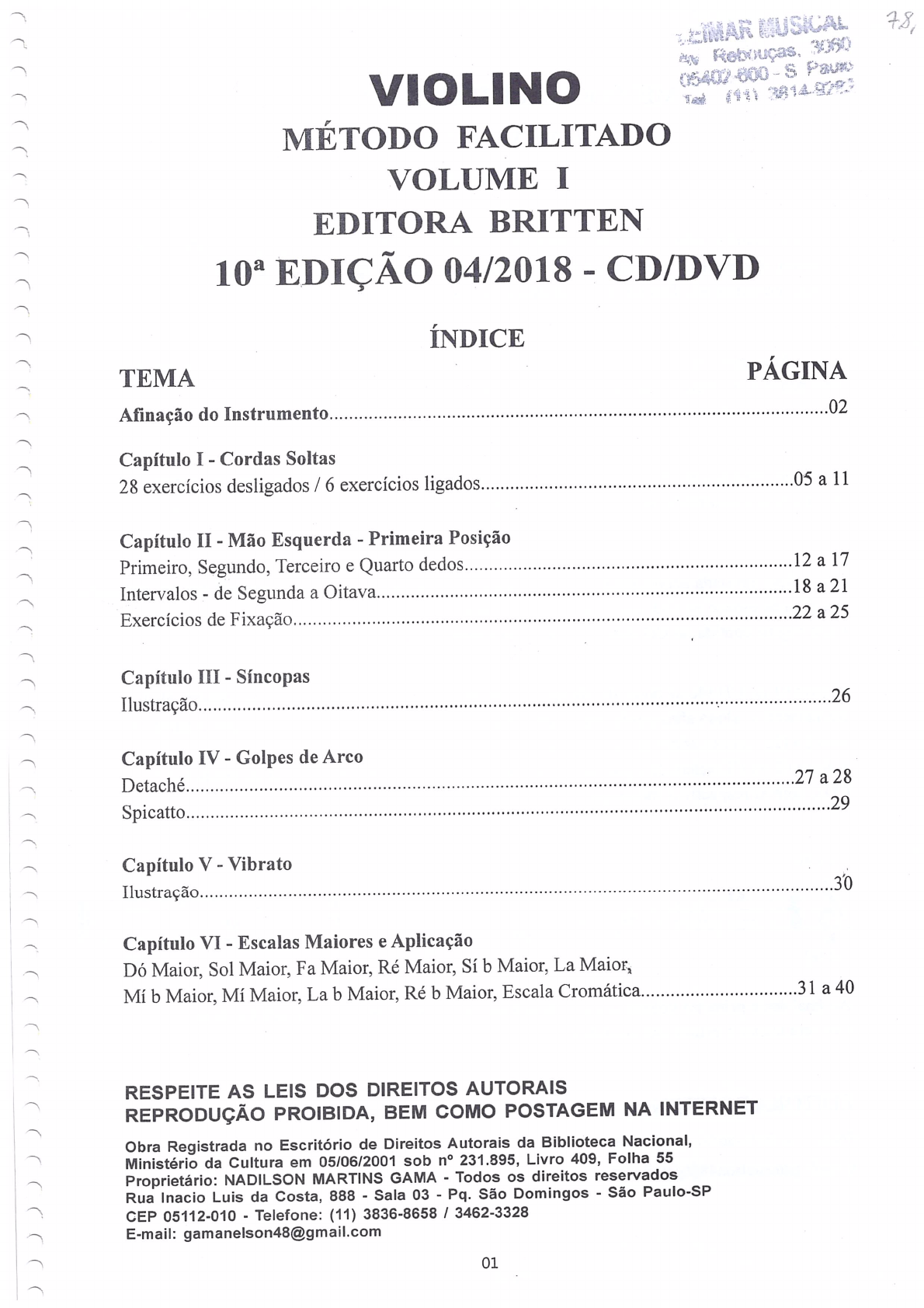 MUSICAL 78, 3060 VIOLINO S (11) MÉTODO FACILITADO VOLUME I EDITORA BRITTEN EDIÇÃO 04/2018 - CD/DVD ÍNDICE PÁGINA Afinação do Instrumento 02 Capítulo I Cordas Soltas 28 exercícios desligados / 6 exercícios ligados 05 a 11 Capítulo II - Mão Esquerda Primeira Posição Primeiro, Segundo, Terceiro e Quarto dedos 12 a 17 Intervalos de Segunda a Oitava 18 a 21 Exercícios de Fixação 22 a 25 Capítulo III Síncopas 26 Ilustração Capítulo IV - Golpes de Arco 27 a 28 Detaché 29 Spicatto Capítulo V Vibrato 30 Ilustração Capítulo VI Escalas Maiores e Aplicação Dó Maior, Sol Maior, Fa Maior, Ré Maior, Sí b Maior, La Maior, Mí b Maior, Mí Maior, La b Maior, Ré b Maior, Escala Cromática 31 a 40 RESPEITE AS LEIS DOS DIREITOS AUTORAIS REPRODUÇÃO PROIBIDA, BEM COMO POSTAGEM NA INTERNET Obra Registrada no Escritório de Direitos Autorais da Biblioteca Nacional, Ministério da Cultura em 05/06/2001 sob n° 231.895, Livro 409, Folha 55 Proprietário: NADILSON MARTINS GAMA Todos os direitos reservados Rua Inacio Luis da Costa, 888 Sala 03 Pq. São Domingos - São Paulo-SP CEP 05112-010 Telefone: (11) 3836-8658 / 3462-3328 E-mail: gamanelson48@gmail.com 01MÉTODO FACILITADO PARA VIOLINO EDIÇÃO COM CD/DVD VOLUME I Este primeiro volume trata da primeira posição e inicia aluno nas cordas soltas, abrangendo ritmos variados, desde semibreves até colcheias e notas ligadas e não ligadas. Ou seja, antes de iniciar o estudo da mão esquerda este fará um bom trabalho inicial de arco. O estudo da mão esquerda é progressivo; corda por corda, dedo por dedo e quando o aluno já adquiriu uma boa desenvoltura na digitação, ele passará a executar os intervalos de segunda até oitava seguido de exercícios variados em sincopas e golpes de arco em detaché e spicatto. O volume finaliza com as 10 principais escalas maiores, seguidas de aplicações melódicas para 2 violinos. Neste ponto o professor deverá tocar junto com o aluno, para acostumá-lo a tocar em conjunto. Esta edição revisada acompanha um CD com a maioria das lições. Algumas tiveram que ser eliminadas por falta de espaço no CD, porém sem comprometer resultado. Cada página contida no CD tem a indicação da respectiva faixa. A faixa 01 do CD são as notas da afinação do instrumento, conforme mostrado no sistema abaixo. Inicialmente o aluno afina corda por corda e depois o professor vai orientando-o para, a partir da nota La (2a. corda), afinar as demais, Mi, Ré e Sol, nesta ordem. A faixa 02 do CD refere-se a página 10 do Método. A página 79 contém todas as faixas dos 2 CD's, com as respectivas minutagens. 60 0:00 Ao final deste primeiro volume o aluno estará apto a executar melodias e quartetos fáceis, e deverá iniciar o estudo das posições. EDITORA BRITTEN Fones: (11) 3836-8658 3462-3328 E-mail: gamanelson48@gmail.com Pg 02 / CD faixa 01MÉTODO FACILITADO PARA VIOLINO APRESENTAÇÃO Foi com grande interesse que examinei os 2 volumes do "MÉTODO FACILITADO PARA VIOLINO", para principiantes, de autoria do professor Nadilson Gama. Seu conteúdo demonstra a seriedade com que foram feitos. No primeiro volume exercícios foram bem concatenados, desde as cordas soltas, avançando gradualmente com exercícios para os quatro dedos e finalizando com várias escalas com saudável objetivo de aprimorar a afinação do aluno. No segundo volume, os diferentes exercícios da até a 6" posições são excelentes. Desejo parabenizar Prof. Nadilson Gama por ter elaborado estes 2 volumes para alunos principiantes de Violino e tenho certeza que seus resultados serão altamente positivos. São Paulo, abril de 2004 NATAN SCHWARTZMAN Spalla da Orquestra Sinfônica da Julliard School of Music New York Bolsista do governo da Inglaterra, através do British Council Violinista contratado da BBC de Londres Spalla da Orquestra Estadual do Estado de São Paulo 1° lugar em vários concursos nacionais e internacionais de Violino Professor de Violino da Universidade Nacional de Brasília (UNB) Professor de Violino da Universidade Estadual de Campinas (UNICAMP) Professor de Violino da Universidade de São Paulo (USP) 03VIOLINO, ARCO E PARTES COMPONENTES 11 14 9 10 9 8 7 13 16 6 1 2.. 15 3 12 4 5 NOME DAS PARTES 1. Tampo e Fundo 9. Cravelhas 2. Filete 10. Orifício da Cravelha 3. F's 11. Voluta 4. Queixeira 12. Cavalete 5. Estandarte 13. Vareta 6. Espelho 14. Ponta 7. Braço 15. Talão 8. Pestana 16. Crina 04Capítulo I - Cordas Soltas Os exercícios abaixo, têm a finalidade de trabalhar cordas soltas. A semibreve, nesta fórmula de compasso, vale 4 tempos, mas o aluno pode e deve trabalhar o mais lentamente possível, puxando e empurrando arco, usando-o em toda a sua extensão, obtendo assim, melhor controle de arco. Controle de arco é imprescindível para que se alcance uma execução exemplar. = Arco para baixo V = Arco para cima II corda V simile = 60 0 4 01. I corda V simile 0 02. III corda V simile 0 03. IV corda V simile 0 04. Nos próximos exercícios, o aluno deve trabalhar as mudanças de cordas, usando puro movimento de cotovelo e sem levantar o arco da corda. Sempre lentamente. V simile 05. 06. 0590 .0 + .0 + .0 .0 .0 .0 n n '60 n n n n + n + , n + '80 .0 n + n n n + n n , 7 simile ^ 09 pOs exercícios 10 e 11 devem ser executados ainda lentamente e usando arco em toda a sua extensão, porém com pulsação definida e regular do início ao fim. Para obter pulsação regular, recomendamos uso do metrônomo em 60 60 10. 11. Os exercícios que se seguem, devem ser executados com o trecho intermediário do arco. Para demarcar o trecho intermediário do arco, divide-se o mesmo, imaginariamente, em 4 partes iguais. As partes 2 e 3 delimitam o trecho intermediário do arco, e é com esse trecho de arco que devem ser trabalhados os próximos exercícios. As partes 1 e 4 delimitam os extremos, talão e ponta. que nesses exercícios devem ser desprezados. 12. 13. 14. 15. 07Nos exercícios 16 ao 23 foram introduzidas colcheias. Es