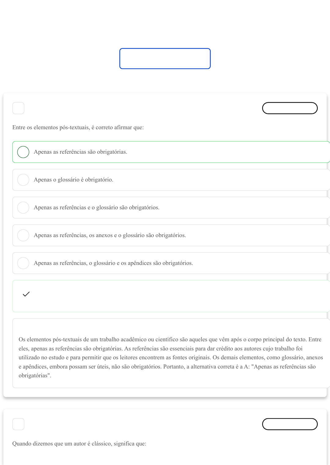 Você acertou 9 de 10 questões Verifique o seu desempenho e continue treinando! Você pode refazer o exercício quantas vezes quiser. Verificar Desempenho A B C D E 1 Marcar para revisão Entre os elementos pós-textuais, é correto afirmar que: Apenas as referências são obrigatórias. Apenas o glossário é obrigatório. Apenas as referências e o glossário são obrigatórios. Apenas as referências, os anexos e o glossário são obrigatórios. Apenas as referências, o glossário e os apêndices são obrigatórios. Resposta correta Parabéns, você selecionou a alternativa correta. Confira o gabarito comentado! Gabarito Comentado Os elementos pós-textuais de um trabalho acadêmico ou científico são aqueles que vêm após o corpo principal do texto. Entre eles, apenas as referências são obrigatórias. As referências são essenciais para dar crédito aos autores cujo trabalho foi utilizado no estudo e para permitir que os leitores encontrem as fontes originais. Os demais elementos, como glossário, anexos e apêndices, embora possam ser úteis, não são obrigatórios. Portanto, a alternativa correta é a A: "Apenas as referências são obrigatórias". 2 Marcar para revisão Quando dizemos que um autor é clássico, significa que: 26/06/2025, 21:49 estacio.saladeavaliacoes.com.br/exercicio/685de6778e7f06f7b7892ac7/gabarito/ https://estacio.saladeavaliacoes.com.br/exercicio/685de6778e7f06f7b7892ac7/gabarito/ 1/8 A B C D E A B C D E Ele é o autor que publicou o primeiro trabalho na área. Ele é o autor que publicou os trabalhos mais recentes. Ele é o autor mais velho entre os atuais. Ele é o que fundou as bases do conhecimento na área. Ele é o que define os caminhos da pesquisa na área. Resposta correta Parabéns, você selecionou a alternativa correta. Confira o gabarito comentado! Gabarito Comentado Um autor é considerado clássico quando suas obras e ideias estabelecem as bases fundamentais do conhecimento em uma determinada área. Essas bases são referências importantes para estudos e pesquisas posteriores. Portanto, a alternativa correta é a D: "Ele é o que fundou as bases do conhecimento na área". 3 Marcar para revisão O uso do apud na referência da citação é feito quando: Transcrevemos um trecho de um autor consultado, para indicar que não é plágio. Escrevemos com nossas palavras um trecho do autor consultado. Fazemos uma citação direta, para indicar que não é plágio. Fazemos uma citação indireta do autor consultado. Utilizamos a ideia referenciada numa obra, sem ter consultado o original. Resposta incorreta Opa! A alternativa correta é a letra E. Confira o gabarito comentado! 26/06/2025, 21:49 estacio.saladeavaliacoes.com.br/exercicio/685de6778e7f06f7b7892ac7/gabarito/ https://estacio.saladeavaliacoes.com.br/exercicio/685de6778e7f06f7b7892ac7/gabarito/ 2/8 A B C D E Gabarito Comentado O uso do termo "apud" em uma referência de citação é feito quando se utiliza a ideia de uma obra que foi referenciada em outra fonte, mas sem ter consultado a obra original. Isso significa que a informação foi obtida indiretamente, através de uma segunda fonte que citou a primeira. Portanto, a alternativa correta é a E: "Quando utilizamos a ideia referenciada numa obra, sem ter consultado o original". 4 Marcar para revisão Sobre a produção científica no Brasil, são feitas as afirmativas a seguir. I. A iniciativa privada, em todos os setores produtivos, tem investido de forma pesada na produção e desenvolvimento de pesquisas científicas no Brasil. II. Apenas a indústria cosmética faz investimentos pesados em pesquisa e desenvolvimento no Brasil III. O Brasil tem órgãos públicos federais e estaduais que têm promovido a pesquisa e desenvolvimento, especialmente em universidades públicas. Apenas I está correta. Apenas II está correta. Apenas III está correta. Apenas I e II estão corretas. Apenas II e III estão corretas. Resposta correta Parabéns, você selecionou a alternativa correta. Confira o gabarito comentado! Gabarito Comentado A alternativa correta é a III, que afirma que o Brasil possui órgãos públicos federais e estaduais que promovem a pesquisa e desenvolvimento, especialmente em universidades públicas. Isso é verdadeiro, pois o Brasil conta com diversas instituições, como o CNPq e a CAPES, que fomentam a pesquisa científica no país. As afirmativas I e II não estão corretas. A iniciativa privada não investe de forma pesada em todos os setores produtivos e não é apenas a indústria cosmética que faz investimentos significativos em pesquisa e desenvolvimento no Brasil. 5 Marcar para revisão 26/06/2025, 21:49 estacio.saladeavaliacoes.com.br/exercicio/685de6778e7f06f7b7892ac7/gabarito/ https://estacio.saladeavaliacoes.com.br/exercicio/685de6778e7f06f7b7892ac7/gabarito/ 3/8 A B C D E A B C D E O que são palavras-chave? São as palavras que mais aparecem nos textos científicos. São palavras usadas para localizar os estudos em buscas bibliográficas. São palavras que só aparecem uma vez nas produções científicas. São palavras que identificam os autores da produção científica. São palavras que indicam o local onde o trabalho foi produzido. Resposta correta Parabéns, você selecionou a alternativa correta. Confira o gabarito comentado! Gabarito Comentado As palavras-chave são termos ou frases que resumem o tópico principal de um texto, artigo, pesquisa, entre outros. Elas são usadas para localizar os estudos em buscas bibliográficas, pois facilitam a identificação do conteúdo principal do material. Portanto, a alternativa correta é a B: "São palavras usadas para localizar os estudos em buscas bibliográficas". 6 Marcar para revisão Que características devem ser priorizadas nas produções científicas que usamos em nossas pesquisas, que trarão credibilidade para ela e para nós como pesquisadores? A quantidade de produções estrangeiras que usamos. A quantidade de produções nacionais que usam