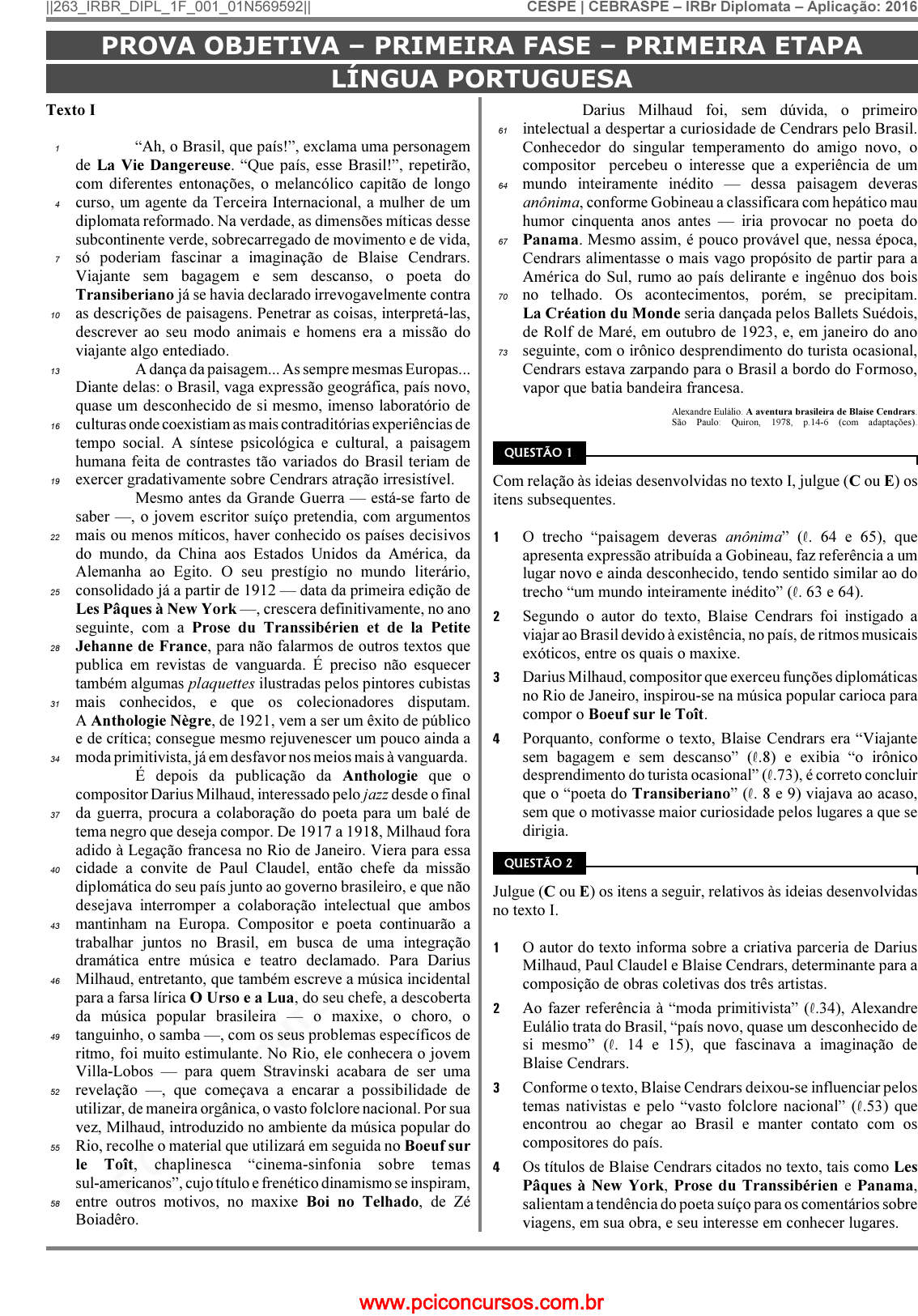 pcimarkpci MDAwMDowMDAwOjAwMDA6MDAwMDowMDAwOmZmZmY6YzkxODowM2Vl:VHVlLCAxNiBKdWwgMjAyNCAxNjoxMDowNCAtMDMwMA== www.pciconcursos.com.br ||263_IRBR_DIPL_1F_001_01N569592|| CESPE | CEBRASPE – IRBr Diplomata – Aplicação: 2016 PROVA OBJETIVA – PRIMEIRA FASE – PRIMEIRA ETAPA LÍNGUA PORTUGUESA Texto I “Ah, o Brasil, que país!”, exclama uma personagem1 de La Vie Dangereuse. “Que país, esse Brasil!”, repetirão, com diferentes entonações, o melancólico capitão de longo curso, um agente da Terceira Internacional, a mulher de um4 diplomata reformado. Na verdade, as dimensões míticas desse subcontinente verde, sobrecarregado de movimento e de vida, só poderiam fascinar a imaginação de Blaise Cendrars.7 Viajante sem bagagem e sem descanso, o poeta do Transiberiano já se havia declarado irrevogavelmente contra as descrições de paisagens. Penetrar as coisas, interpretá-las,10 descrever ao seu modo animais e homens era a missão do viajante algo entediado. A dança da paisagem... As sempre mesmas Europas...13 Diante delas: o Brasil, vaga expressão geográfica, país novo, quase um desconhecido de si mesmo, imenso laboratório de culturas onde coexistiam as mais contraditórias experiências de16 tempo social. A síntese psicológica e cultural, a paisagem humana feita de contrastes tão variados do Brasil teriam de exercer gradativamente sobre Cendrars atração irresistível. 19 Mesmo antes da Grande Guerra — está-se farto de saber —, o jovem escritor suíço pretendia, com argumentos mais ou menos míticos, haver conhecido os países decisivos22 do mundo, da China aos Estados Unidos da América, da Alemanha ao Egito. O seu prestígio no mundo literário, consolidado já a partir de 1912 — data da primeira edição de25 Les Pâques à New York —, crescera definitivamente, no ano seguinte, com a Prose du Transsibérien et de la Petite Jehanne de France, para não falarmos de outros textos que28 publica em revistas de vanguarda. É preciso não esquecer também algumas plaquettes ilustradas pelos pintores cubistas mais conhecidos, e que os colecionadores disputam.31 A Anthologie Nègre, de 1921, vem a ser um êxito de público e de crítica; consegue mesmo rejuvenescer um pouco ainda a moda primitivista, já em desfavor nos meios mais à vanguarda. 34 É depois da publicação da Anthologie que o compositor Darius Milhaud, interessado pelo jazz desde o final da guerra, procura a colaboração do poeta para um balé de37 tema negro que deseja compor. De 1917 a 1918, Milhaud fora adido à Legação francesa no Rio de Janeiro. Viera para essa cidade a convite de Paul Claudel, então chefe da missão40 diplomática do seu país junto ao governo brasileiro, e que não desejava interromper a colaboração intelectual que ambos mantinham na Europa. Compositor e poeta continuarão a43 trabalhar juntos no Brasil, em busca de uma integração dramática entre música e teatro declamado. Para Darius Milhaud, entretanto, que também escreve a música incidental46 para a farsa lírica O Urso e a Lua, do seu chefe, a descoberta da música popular brasileira — o maxixe, o choro, o tanguinho, o samba —, com os seus problemas específicos de49 ritmo, foi muito estimulante. No Rio, ele conhecera o jovem Villa-Lobos — para quem Stravinski acabara de ser uma revelação —, que começava a encarar a possibilidade de52 utilizar, de maneira orgânica, o vasto folclore nacional. Por sua vez, Milhaud, introduzido no ambiente da música popular do Rio, recolhe o material que utilizará em seguida no Boeuf sur55 le Toît, chaplinesca “cinema-sinfonia sobre temas sul-americanos”, cujo título e frenético dinamismo se inspiram, entre outros motivos, no maxixe Boi no Telhado, de Zé58 Boiadêro. Darius Milhaud foi, sem dúvida, o primeiro intelectual a despertar a curiosidade de Cendrars pelo Brasil.61 Conhecedor do singular temperamento do amigo novo, o compositor percebeu o interesse que a experiência de um mundo inteiramente inédito — dessa paisagem deveras64 anônima, conforme Gobineau a classificara com hepático mau humor cinquenta anos antes — iria provocar no poeta do Panama. Mesmo assim, é pouco provável que, nessa época,67 Cendrars alimentasse o mais vago propósito de partir para a América do Sul, rumo ao país delirante e ingênuo dos bois no telhado. Os acontecimentos, porém, se precipitam.70 La Création du Monde seria dançada pelos Ballets Suédois, de Rolf de Maré, em outubro de 1923, e, em janeiro do ano seguinte, com o irônico desprendimento do turista ocasional,73 Cendrars estava zarpando para o Brasil a bordo do Formoso, vapor que batia bandeira francesa. Alexandre Eulálio. A aventura brasileira de Blaise Cendrars. São Paulo: Quíron, 1978, p.14-6 (com adaptações). QUESTÃO 1 Com relação às ideias desenvolvidas no texto I, julgue (C ou E) os itens subsequentes. 1 O trecho “paisagem deveras anônima” (R. 64 e 65), que apresenta expressão atribuída a Gobineau, faz referência a um lugar novo e ainda desconhecido, tendo sentido similar ao do trecho “um mundo inteiramente inédito” (R. 63 e 64). 2 Segundo o autor do texto, Blaise Cendrars foi instigado a viajar ao Brasil devido à existência, no país, de ritmos musicais exóticos, entre os quais o maxixe. 3 Darius Milhaud, compositor que exerceu funções diplomáticas no Rio de Janeiro, inspirou-se na música popular carioca para compor o Boeuf sur le Toît. 4 Porquanto, conforme o texto, Blaise Cendrars era “Viajante sem bagagem e sem descanso” (R.8) e exibia “o irônico desprendimento do turista ocasional” (R.73), é correto concluir que o “poeta do Transiberiano” (R. 8 e 9) viajava ao acaso, sem que o motivasse maior curiosidade pelos lugares a que se dirigia. QUESTÃO 2 Julgue (C ou E) os itens a seguir, relativos às ideias desenvolvidas no texto I. 1 O autor do texto informa sobre a criativa parceria de Darius Milhaud, Paul Claudel e Blaise Cendrars, determinante