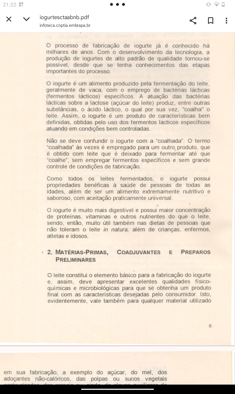 21:22 + iogurtesctaabnb.pdf infoteca.cnptia.embrapa.br processo de fabricação de iogurte já é conhecido há milhares de anos. Com O desenvolvimento da tecnologia, a produção de iogurtes de alto padrão de qualidade tornou-se possível, desde que se tenha conhecimentos das etapas importantes do processo. O iogurte é um alimento produzido pela fermentação do leite, geralmente de vaca, com emprego de bactérias lácticas (fermentos lácticos) específicos. A atuação das bactérias lácticas sobre a lactose (açúcar do leite) produz, entre outras substâncias, ácido láctico, qual por sua vez, "coalha" leite. Assim, iogurte é um produto de características bem definidas, obtidas pelo uso dos fermentos lácticos específicos atuando em condições bem controladas. Não se deve confundir iogurte com a "coalhada". O termo "coalhada" às vezes é empregado para um outro produto, que é obtido com leite que é deixado para fermentar até que "coalhe", sem empregar fermentos específicos sem grande controle de condições de fabricação. Como todos leites fermentados, iogurte possui propriedades benéficas à saúde de pessoas de todas as idades, além de ser um alimento extremamente nutritivo e saboroso, com aceitação praticamente universal. O iogurte é muito mais digestível e possui maior concentração de proteínas, vitaminas e outros nutrientes do que O leite, sendo, então, muito também nas dietas de pessoas que não toleram leite in natura, além de crianças, enfermos, atletas e idosos. 2. MATÉRIAS-PRIMAS, COADJUVANTES E PREPAROS PRELIMINARES leite constitui elemento básico para a fabricação do iogurte e, assim, deve apresentar excelentes qualidades físico- e microbiológicas para que se obtenha um produto final com as características desejadas pelo consumidor. Isto, evidentemente, vale também para qualquer material utilizado 6 em sua fabricação, a exemplo do açúcar, do mel, dos adoçantes não-calóricos, das polpas ou sucos vegetais