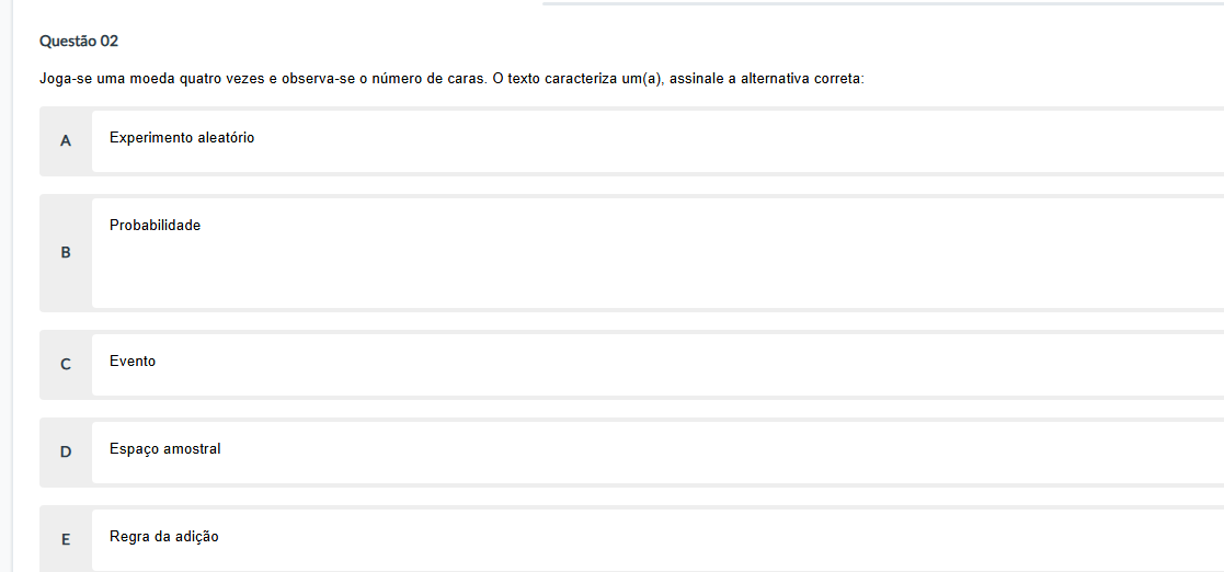 Questão 02 Joga-se uma moeda quatro vezes e observa-se 0 de caras. texto caracteriza um(a), assinale a alternativa correta: A Experimento aleatório Probabilidade B C Evento D Espaço amostral E Regra da adição