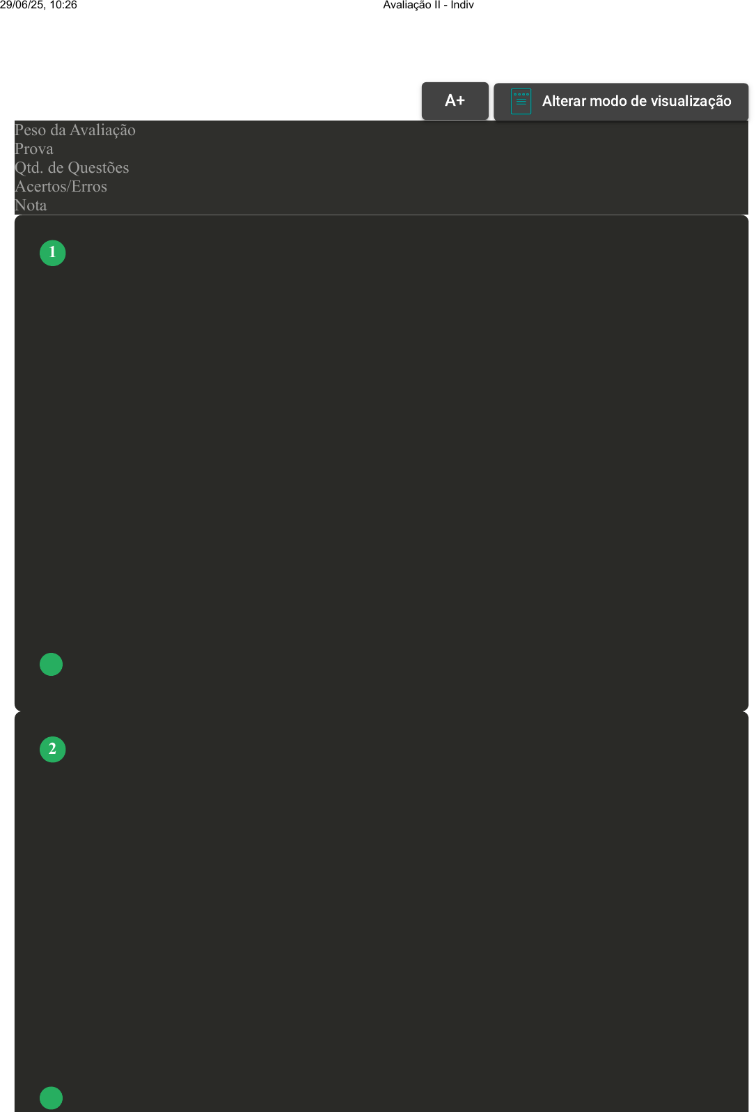 Prova Impressa GABARITO | Avaliação II - Individual (Cod.:1024358) Peso da Avaliação 2,00 Prova 101749150 Qtd. de Questões 10 Acertos/Erros 10/0 Nota 10,00 Os medicamentos opioides são medicamentos prescritos para o tratamento e alívio da dor, por essa razão são chamados de analgésicos (OGA; CAMARGO; BATISTUZZO, 2014). Sendo assim, associe os itens, utilizando o código a seguir: I- Tolerância. II- Dependência. III- Síndrome de abstinência. ( ) Tem como sintomas principais: lacrimejamento, rinorreia, bocejos excessivos e transpiração intensa. ( ) Doses cada vez maiores são necessárias para conseguir euforia e bem-estar. ( ) Tem como principal característica a síndrome de abstinência. Assinale a alternativa que apresenta a sequência CORRETA: FONTE: OGA, S.; CAMARGO, M. M. A.; BATISTUZZO, J. A. O. Fundamentos de toxicologia. 4. ed. São Paulo: Editora Atheneu, 2014. A III - II - I. B I - III - II. C I - II - III. D III - I - II. As drogas depressoras diminuem a atividade do nosso cérebro, ou seja, deprimem seu funcionamento, o que significa que as pessoas que fazem uso desse tipo de droga ficam “desligadas”, “devagar”, desinteressadas das coisas. Sobre o exposto, avalie as asserções a seguir e a relação proposta entre elas: I- As drogas depressoras do SNC atuam no receptor GABAérgico que é responsável por mediar os efeitos do GABA, o principal neurotransmissor inibidor do cérebro. PORQUE II- A ativação desse receptor promove a abertura dos poros, permitindo a entrada de íons cloreto no interior da célula, os quais promovem a hiperpolarização da membrana, inibindo a excitação celular. Assinale a alternativa CORRETA: FONTE: https://bvsms.saude.gov.br/bvs/publicacoes/alcool_outras_drogas.pdf. Acesso em: 1º jul. 2022. A As asserções I e II são proposições falsas. B As asserções I e II são proposições verdadeiras, mas a II não é uma justificativa da I. C As asserções I e II são proposições verdadeiras, e a II é uma justificativa da I. VOLTAR A+ Alterar modo de visualização 1 2 29/06/25, 10:26 Avaliação II - Individual about:blank 1/5 D A asserção I é uma proposição falsa, e a II é uma proposição verdadeira. A cocaína (COC) já foi comercializada livremente pelo laboratório Bayer, no passado, e enaltecida por suas qualidades medicinais. A folha de coca tem sido usada milenarmente pelos povos andinos para reduzir a fadiga e o cansaço das longas jornadas de trabalho. Em nossa cultura, algumas pessoas fazem uso de COC para se manterem acordadas e atentas por mais tempo que o habitualmente suportável. Sobre a COC, analise as sentenças a seguir: I- Após a utilização da COC em doses recreacionais, há elevação temporária das concentrações de norepinefrina (NE) e dopamina (DA). II- O provável mecanismo de ação da COC no SNC é o bloqueio da recaptação da DA nas fendas sinápticas. III- A diminuição de dopamina, nos receptores pós-sinápticos D1 e D2, parece ser o mecanismo fisiopatológico pelo qual ocorre a euforia. Assinale a alternativa CORRETA: FONTE: https://altamontanha.com/coca-a-folha-sagrada-dos-incas/. Acesso em: 22 jun. 2022. A Somente a sentença I está correta. B As sentenças II e III estão corretas. C As sentenças I e III estão corretas. D As sentenças I e II estão corretas. As drogas depressoras do SNC são aquelas que diminuem a atividade do cérebro, deixando o organismo mais lento. Seus efeitos imediatos são a redução da tensão emocional, da atenção, da concentração, da memória e da capacidade intelectual. Sobre as drogas consideradas depressoras do SNC, assinale a alternativa CORRETA: FONTE: https://www12.senado.leg.br/noticias/especiais/especial-cidadania/drogas/efeitos-das- substancias-no-sistema-nervoso. Acesso em: 27 jul. 2022. A Cocaína, barbitúricos e opioides. B Barbitúricos, benzodiazepínicos e cocaína. C Barbitúricos, benzodiazepínicos e opioides. D Anfetaminas, benzodiazepínicos e álcool. O uso de drogas é um fenômeno bastante antigo na história e constitui um grave problema de saúde pública, com sérias consequências pessoas e sociais no futuro dos jovens e de toda sociedade (MARQUES; CRUZ, 2000). Sobre o exposto, avalie as asserções a seguir e a relação proposta entre elas: 3 4 5 29/06/25, 10:26 Avaliação II - Individual about:blank 2/5 I- A toxicologia social abrange fármacos e drogas cujos efeitos são variáveis, desde problemas de saúde ao usuário e até mesmo um alto custo para sociedade. PORQUE II- O uso de drogas está relacionado com infecção por HIV, câncer e problemas cardiovasculares. Além de aumento da criminalidade, violência e marginalidade. Assinale a alternativa CORRETA: FONTE: MARQUES, A. C. P. R.; CRUZ, M. S. O adolescente e o uso de drogas. Brazilian Journal of Psychiatry, v. 22, n. 2, p. 32-36, 2000. A A asserção I é uma proposição falsa, e a II é uma proposição verdadeira. B As asserções I e II são proposições falsas. C As asserções I e II são proposições verdadeiras, e a II é uma justificativa da I. D As asserções I e II são proposições verdadeiras, mas a II não é uma justificativa da I. A cocaína (COC) é uma substância psicoativa com ação estimulante no SNC. Ela pode ser consumida na forma de pó, de maneira injetável ou oral. Quanto mais rápido o início dos efeitos e mais forte a intensidade, maior a probabilidade de dependência (OGA; CAMARGO; BATISTUZZO, 2014). Sobre os padrões de uso da COC, associe os itens, utilizando o código a seguir: I- Crack. II- Merla. III- Cloridrato de cocaína. ( ) Pó fino e branco; pode ser utilizado via venosa ou aspirado (via nasal). ( ) Forma de pedra, volatiza quando aquecida; fumada em cachimbos rudimentares contendo de 100 a 150 mg de droga. ( ) Subproduto de consistência pastosa, obtida através do tratamento de folhas de coca. Assinale a alternativa que apresenta a sequência CORRETA: FONTE: OGA, S.; CAMARGO, M. M. A.; BATISTUZZO, 
