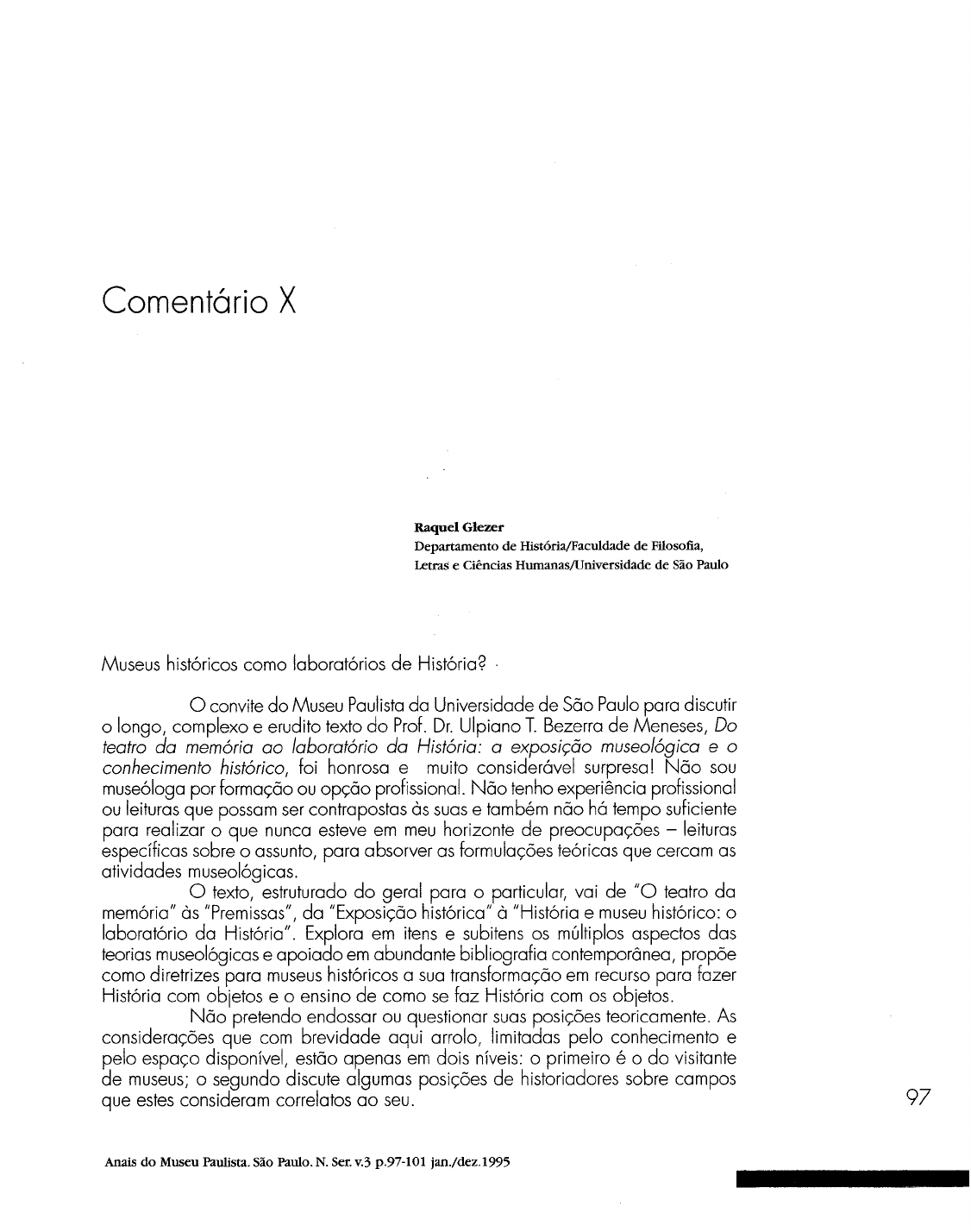 Comentário X Raquel Glezer Departamento de História/Faculdade de Filosofia, Letras e Ciências Humanas/Universidade de São Paulo Museus históricos como laboratórios de História? o convitedo Museu Paulistada Universidade de São Paulopara discutir o longo, complexo e erudito texto do Prof.Dr.Ulpiano T. Bezerra de Meneses, Do teatro da memória ao laboratório da História: a exposição museológica e o conhecimento histórico, foi honrosa e muito considerável surpresa! Não sou museóloga por formação ou opção profissional.Não tenho experiência profissional ou leiturasque possam ser contrapostas às suas e também não há tempo suficiente para realizar o que nunca esteve em meu horizonte de preocupações - leituras específicas sobre o assunto, para absorver as formulações teóricas que cercam as atividades museológicas. O texto, estruturado do geral para o particular, vai de "O teatro da memória" às "Premissas",da "Exposição histórica"à "Históriae museu histórico: o laboratório da História". Explora em itens e subitens os múltiplos aspectos das teorias museológicas e apoiado em abundante bibliografia contemporânea, propõe como diretrizes para museus históricosa sua transformação em recurso para fazer História com objetos e o ensino de como se faz História com os objetos. Não pretendo endossar ou questionar suas posições teoricamente. As considerações que com brevidade aqui arrolo, limitadas pelo conhecimento e pelo espaço disponível, estão apenas em dois níveis: o primeiro é o do visitante de museus; o segundo discute algumas posições de historiadores sobre campos que estes consideram correlatos ao seu. 97 Anais do Museu Paulista. São Paulo. N. Ser. v.3 p.97-101 jan./dez.1995 98 Intelectualmente, museus são, a meu ver, espaços privilegiados de trabalho multidisciplinar, complexos e especializados, que exigem para a sua direção, formação erudita na respectiva área de especialidade. Importa tanto o conhecimento do conteúdo dos acervos, dos objetos e seu valor relativo, das formas deaquisição, da inserção social que permitiu sua produção e conforme o caso, também o seu uso, quanto os critérios sub/.acentes à sua seleção como objeto museológico. Além, é claro, do valor sacia do ambiente do museue do que ele nos diz a respeito da sociedade que o criou e mantém. Um museu,qualquer que seja seuconteúdo e sua organização espacial, em estruturação simples ou complexa, temático ou específico, dotado de equipamento sofisticado de comunicação com o público ou não, é um espaço único de memória e de conhecimento. Desde os mais simples e despojados museusque existem no país, com acervos formados aleatoriamente- sobreviventesde injunçõespolíticase abstinência jurídica que permitem a algumas pessoasconsiderarem privados os bens públicos - abandonados à própria sorte, sem verbas e sem quadros profissionais especializados, contando apenas com a colaboração e boa vontade dos que neles trabalham, até os mais complexos e sofisticados museusque existem em alguns países, a sensação que me domina ao entrar em um deles é sempre a de que ali, naquele espaço institucionalizado, surgirão sensações emocionantes, prazerosas - uma experiência nova de conhecimento, insubstituível. As pessoas vão aos museus para entreter-se culturalmente e para apreender e compreender. Eventualmente,algo desconhecido passa a fazer parte do seu conhecimento; objetos diversos dos do cotidiano, ou mesmo objetos do cotidiano, são vistos e apreciados de forma diferente porque estão em outra disposição, outro contexto, outra configuração. Sistemático ou não, há algum esforço de leitura, de aprendizagem, de identificação, de reconhecimento da imensa capacidade de produção de que seres humanos são dotados. O museué uma pausa para a recuperação necessária da diversidade e inter-relaçõesde materiais e circunstâncias, espaços e tempos. O próprio retorno é nova experiência. Há encontros e reencontros, choques e "viagens". Nada do que é humano me é estranho e tudo pode ser apreendido e apreciado (uma pequena variação do clássico provérbio latino). Museus são espaços singulares de conhecimento, emoções e prazer, e gostaria que assim continuassem a ser porque existem para os usuários comuns, "normais". E claro que devem também ser atraentes, bem organizados internamente, bem sinalizados, dotados de adequado material informativo, com todos os atributos de museus bem administrados, conservados e socialmente inseridos. Acima de tudo, porém, devem ser experiências emocionantes de conhecimento, não apenas para os especialistas que organizam a estruturação física e espacial, a conservação, a preservação do acervo como um todo e da parcela exposta, mas especialmente para os visitantes, que mesmosem dispor da erudição e das especializações ali concentradas, são ou deveriam ser o alvo principal dos trabalhos. O segundo aspecto sobre o qual teço algumas considerações tem a ver com a minha preocupação com questões epistemológicas, teóricas e metodológicas e experiência de historiadora, de professora de história, de formadora de historiadores, o que suponho venho sendo nos últimos anos. Não conheço todos os tipos de museusnem as suas possibilidades de estruturação, mas acredito que em todos há o espaço necessário para um especialista entre tantos outros - o historiador - plenamente capacitado a inserir os objetos, quaisquer que sejam, em seu contexto social de produção e significação. Historiadores devem estar em todos os museuse não apenas nos históricos, pois todos, no fundo, são construções histórico-sócio-culturais,datadas e limitadas. A complementaridade, a possibilidade de circulação e de colaboração de historiadores com essas instituiçõesnão deve ultrapassar certos limites, os quais não têm sido claramente colocados. Há uma certa tradição ocidental de en