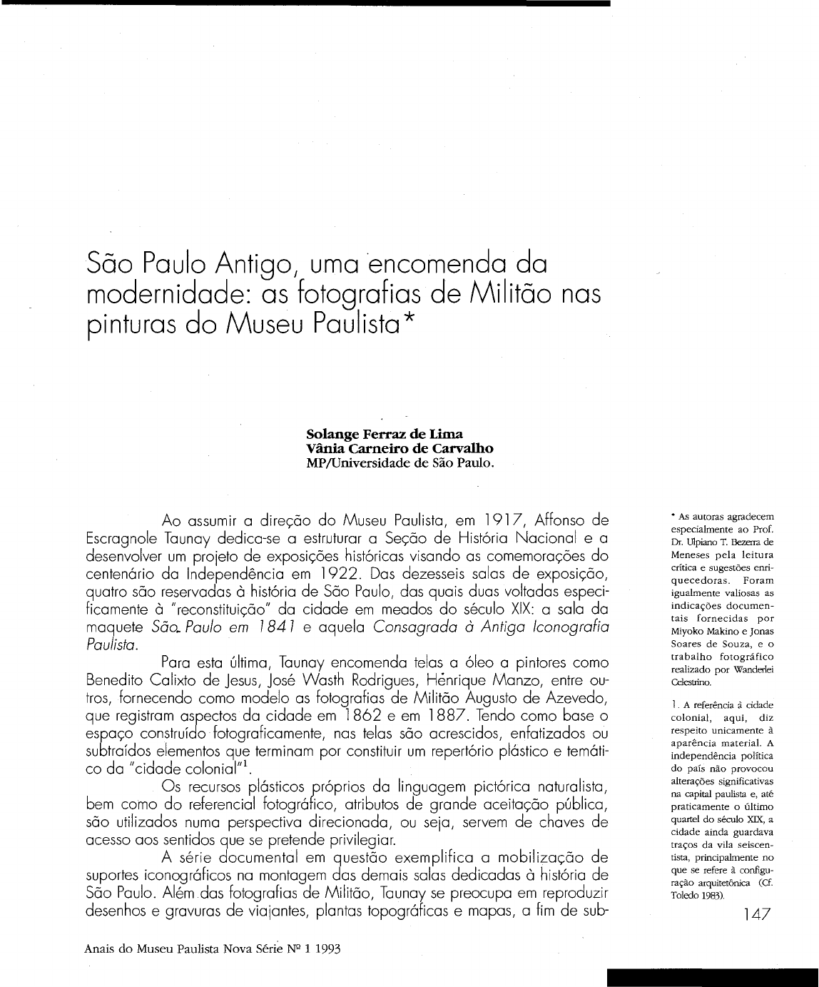 São PauloAntigo, uma'encomendada modernidade: as fotografiasde Militão nas pinturasdo Museu Paulista* Solange Ferraz de Lima Vânia Carneiro de Carvalho MPlUniversidadede São Paulo. Ao assumir a direção do Museu Paulista, em 1917, Affonso de Escragnole Taunay dedica-se a estruturar a Seção de História Nacional e a desenvolver um projeto de exposições históricas visando as comemorações do centenário da Independência em 1922. Das dezesseis salas de exposição, quatro são reservadas à história de São Paulo, das quais duas voltadas especi- ficamente à "reconstituição" da cidade em meados do século XIX:a sala da maquete São~Paulo em 1841 e aquela Consagrada à Antiga Iconografia Paulista. Para esta última, Taunay encomenda telas a óleo a pintores como Benedito Calixto de Jesus,José Wasth Rodrigues, Hénrique Manzo, entre ou- tros, fornecendo como modelo as fotografias de Militão Augusto de Azevedo, que registram aspectos da cidade em 1862 e em 1887. Tendo como base o espaço construído fotograficamente, nas telas são acrescidos, enfatizados ou subtraídos elementos que terminam por constituir um repertório plástico e temáti- co da "cidade colonial"l. Os recursos plásticos próprios da linguagem pictórica naturalista, bem como do referencial fotográfico, atributos de grande aceitação pública, são utilizados numa perspectiva direcionada, ou seio, servem de chaves de acesso aos sentidos que se pretende privilegiar. A série documental em questão exemplifica a mobilização de suportes iconográficos na montagem das demais salas dedicados à história de São Paulo. Além das fotografias de Militão, Taunay se preocupa em reproduzir desenhos e gravuras de viajantes, plantas topográficas e mapas, a fim de sub- Anais do Museu Paulista Nova Série NQ 1 1993 * As autoras agradecem especialmente ao prof. Dr. Ulpiano T. BezeITade Meneses pela leitura crítica e sugestões enri- quecedoras. Foram igualmente valiosas as indicações documen- tais fornecidas por Miyoko Makino e Jonas Soares de Souza, e o trabalho fotográfico realizado por Wanderlei Celestrino. 1. A referência ã cidade colonial, aqui, diz respeito unicamente à aparência material. A independência política do país não provocou alterações significativas na capital paulista e, até praticamente o último quartel do século XIX, a cidade ainda guardava traços da vila seiscen- tista, principalmente no que se refere ã configu- ração arquitetõnica (Cr. Toledo 1983). 147 sidiar a produção de telas, bem como a confecção da grande maquete em gesso da cidade. A análise do material iconográfico - entendido por Taunay como vetor de uma função pedagógica que orienta a montagem de representações de cidade articuladasà problemáticado nacionalismo- permite redimensionar o papel do intelectual em um museu dedicado a "preservar" a memória pátria e, mais especificamente, a memória de São Paulo. Este artigo pretende demarcar as noções de iconografia implícitas na atividade de Taunay; analisar o repertório colonial a partir de seus atributos plásticos, bem como de suas matrizes textuais e iconográticas; e, por fim, discu- tir a articulação dessas imagens ao conjunto de representações da mo- dernidade e de identidade nacional emergentes nas primeiras décadas deste século. Taunay e as FontesIconográficas 148 A série documental em análise pode ser vista como uma amostra das funções atribuídas à iconografia no projeto de exposições do Museu Paulista. Para demarcá-Ias seria útil identificar as noções de documento em geral e de documento iconográfico presentes na prática historiográfica de Taunay. São certas posturas teórico-metodológicas em relação à iconografia que permitem ao historiador incluir as recriações da cidade na categoria de objetos documentais. Sua historiografia, eminentemente descritiva, visa reconsti- tuições de quadros passados da vida social aptos a serem compreendidos num encadeamento histórico linear e evolutivo. Essa perspectiva, que mostra claramente a filiação ao pensamento positivista que orientou, em parte, as ciências humanas a partir do final do sécu- lo passado, trata o documento como portador da própria história, esta como valor imanente do objeto, que necessitaria apenas ser "revelado" pelo historia- dor. A historicidade do documento fica reduzida, na visão de Taunay, aos critérios de autenticidade e de verossimilhança, ou seja, à sua contemporanei- dade com o fato ou quadro histórico vivenciado e à sua plausibilidade. Nesta concepção, as principais tarefas do historiador referem-se à busca de fontes inéditas e à seleção daquelas que respeitam os critérios acima apontados. Estes procedimentos seriam, a princípio, aplicáveis tanto às fontes textuais como às iconográficas. No entanto, nos trabalhos em que Taunay faz menção à natureza de suas fontes, fica enunciado um tratamento específico das fontes iconográficas, que sugere, ainda que de forma pouco explícita, uma subordinação da icono- grafia ao texto. No caso das fontes textuais, procede-se ao confronto interno entre os diversos documentos, visando surpreender eventuais contradições ou inverossimi- lhanças. Quando isso não é possível - o que parece ser freqüente num quadro histórico de escassa documentação como é o caso do período colonial brasileiro-, a autenticidade apoio-se na "probidade e inteligência"do emissor da fonte. Essa confiabilidade no emissor fica evidente nas afirmações de Taunal em relação a naturalistas, viajantes e artistas como Saint Hilaire, Kidder, Debret, Koster,etc. Já no caso das fontes iconográficas, o reconhecimento da autentici- dade advém da confirmação de documentos textuais abalizados (inventários, crônicas e relatos). Outro critério pode ainda servir de controle caso o documen- to iconográfico seja de época mas não passível de ser confrontado, o que o torna singularmente importante: