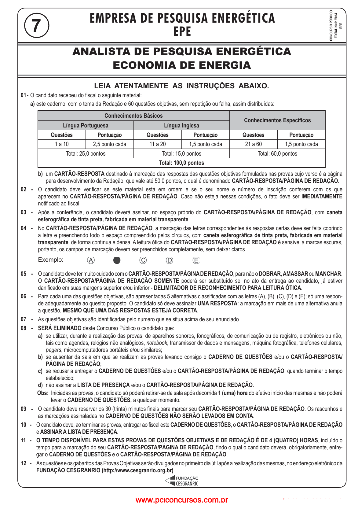pcimarkpci MDAwMDowMDAwOjAwMDA6MDAwMDowMDAwOmZmZmY6MmQ4YzpjMGE1:U2F0LCAyOCBKdW4gMjAyNSAwOToyMzo0NCAtMDMwMA== www.pciconcursos.com.brwww.pciconcursos.com.br 1 ANALISTA DE PESQUISA ENERGÉTICA ECONOMIA DE ENERGIA EPEEMPRESA DE PESQUISA ENERGÉTICA EPE CO NC UR SO P ÚB LIC O ED ITA L N o 01 /20 14 EP E LEIA ATENTAMENTE AS INSTRUÇÕES ABAIXO. 01 - O candidato recebeu do fiscal o seguinte material: a) este caderno, com o tema da Redação e 60 questões objetivas, sem repetição ou falha, assim distribuídas: Conhecimentos Básicos Conhecimentos Específicos Língua Portuguesa Língua Inglesa Questões Pontuação Questões Pontuação Questões Pontuação 1 a 10 2,5 ponto cada 11 a 20 1,5 ponto cada 21 a 60 1,5 ponto cada Total: 25,0 pontos Total: 15,0 pontos Total: 60,0 pontos Total: 100,0 pontos b) um CARTÃO-RESPOSTA destinado à marcação das respostas das questões objetivas formuladas nas provas cujo verso é a página para desenvolvimento da Redação, que vale até 50,0 pontos, o qual é denominado CARTÃO-RESPOSTA/PÁGINA DE REDAÇÃO. 02 - O candidato deve verificar se este material está em ordem e se o seu nome e número de inscrição conferem com os que aparecem no CARTÃO-RESPOSTA/PÁGINA DE REDAÇÃO. Caso não esteja nessas condições, o fato deve ser IMEDIATAMENTE notificado ao fiscal. 03 - Após a conferência, o candidato deverá assinar, no espaço próprio do CARTÃO-RESPOSTA/PÁGINA DE REDAÇÃO, com caneta esferográfica de tinta preta, fabricada em material transparente. 04 - No CARTÃO-RESPOSTA/PÁGINA DE REDAÇÃO, a marcação das letras correspondentes às respostas certas deve ser feita cobrindo a letra e preenchendo todo o espaço compreendido pelos círculos, com caneta esferográfica de tinta preta, fabricada em material transparente, de forma contínua e densa. A leitura ótica do CARTÃO-RESPOSTA/PÁGINA DE REDAÇÃO é sensível a marcas escuras, portanto, os campos de marcação devem ser preenchidos completamente, sem deixar claros. Exemplo: 05 - O candidato deve ter muito cuidado com o CARTÃO-RESPOSTA/PÁGINA DE REDAÇÃO, para não o DOBRAR, AMASSAR ou MANCHAR. O CARTÃO-RESPOSTA/PÁGINA DE REDAÇÃO SOMENTE poderá ser substituído se, no ato da entrega ao candidato, já estiver danificado em suas margens superior e/ou inferior - DELIMITADOR DE RECONHECIMENTO PARA LEITURA ÓTICA. 06 - Para cada uma das questões objetivas, são apresentadas 5 alternativas classificadas com as letras (A), (B), (C), (D) e (E); só uma respon- de adequadamente ao quesito proposto. O candidato só deve assinalar UMA RESPOSTA: a marcação em mais de uma alternativa anula a questão, MESMO QUE UMA DAS RESPOSTAS ESTEJA CORRETA. 07 - As questões objetivas são identificadas pelo número que se situa acima de seu enunciado. 08 - SERÁ ELIMINADO deste Concurso Público o candidato que: a) se utilizar, durante a realização das provas, de aparelhos sonoros, fonográficos, de comunicação ou de registro, eletrônicos ou não, tais como agendas, relógios não analógicos, notebook, transmissor de dados e mensagens, máquina fotográfica, telefones celulares, pagers, microcomputadores portáteis e/ou similares; b) se ausentar da sala em que se realizam as provas levando consigo o CADERNO DE QUESTÕES e/ou o CARTÃO-RESPOSTA/ PÁGINA DE REDAÇÃO; c) se recusar a entregar o CADERNO DE QUESTÕES e/ou o CARTÃO-RESPOSTA/PÁGINA DE REDAÇÃO, quando terminar o tempo estabelecido; d) não assinar a LISTA DE PRESENÇA e/ou o CARTÃO-RESPOSTA/PÁGINA DE REDAÇÃO. Obs: Iniciadas as provas, o candidato só poderá retirar-se da sala após decorrida 1 (uma) hora do efetivo início das mesmas e não poderá levar o CADERNO DE QUESTÕES, a qualquer momento. 09 - O candidato deve reservar os 30 (trinta) minutos finais para marcar seu CARTÃO-RESPOSTA/PÁGINA DE REDAÇÃO. Os rascunhos e as marcações assinaladas no CADERNO DE QUESTÕES NÃO SERÃO LEVADOS EM CONTA. 10 - O candidato deve, ao terminar as provas, entregar ao fiscal este CADERNO DE QUESTÕES, o CARTÃO-RESPOSTA/PÁGINA DE REDAÇÃO e ASSINAR A LISTA DE PRESENÇA. 11 - O TEMPO DISPONÍVEL PARA ESTAS PROVAS DE QUESTÕES OBJETIVAS E DE REDAÇÃO É DE 4 (QUATRO) HORAS, incluído o tempo para a marcação do seu CARTÃO-RESPOSTA/PÁGINA DE REDAÇÃO, findo o qual o candidato deverá, obrigatoriamente, entre- gar o CADERNO DE QUESTÕES e o CARTÃO-RESPOSTA/PÁGINA DE REDAÇÃO. 12 - As questões e os gabaritos das Provas Objetivas serão divulgados no primeiro dia útil após a realização das mesmas, no endereço eletrônico da FUNDAÇÃO CESGRANRIO (http://www.cesgranrio.org.br). ANALISTA DE PESQUISA ENERGÉTICA ECONOMIA DE ENERGIA 7 pcimarkpci MDAwMDowMDAwOjAwMDA6MDAwMDowMDAwOmZmZmY6MmQ4YzpjMGE1:U2F0LCAyOCBKdW4gMjAyNSAwOToyMzo0NCAtMDMwMA== www.pciconcursos.com.brwww.pciconcursos.com.br ANALISTA DE PESQUISA ENERGÉTICA ECONOMIA DE ENERGIA 2 EPE R E D A Ç Ã O A vida em comunidades, grandes ou pequenas, requer equilíbrio entre os direitos individuais e as regras de boa convivência, tanto no espaço privado quanto no espaço público. Na legislação atual, existem leis que, em função de suas finalidades, estabelecem restrições objetivas para a geração de ruídos durante dia e noite. Se por um lado sabe-se que estudos médicos consideram que o volume elevado pode causar danos à saúde humana e dos animais, por outro lado, som alto pode vir associado à alegria, como ocorre em bailes de carnaval e em festas públicas. Pesquisa feita sobre o assunto no Google traz matérias que ilustram as duas posições. O incômodo produzido pelo som está presente em títulos como “Moradores reclamam do som alto no Pacaembu”, “Quando é possível reclamar do vizinho barulhento” e “Som alto prejudica a saúde”. Por outro lado, há um site no Facebook intitulado “Loucos por som Alto” e uma postagem no Instagram que afirma “É assim que começa a segundona!!! Som alto e alegria pra trabalhar e treinar!!”. Com 