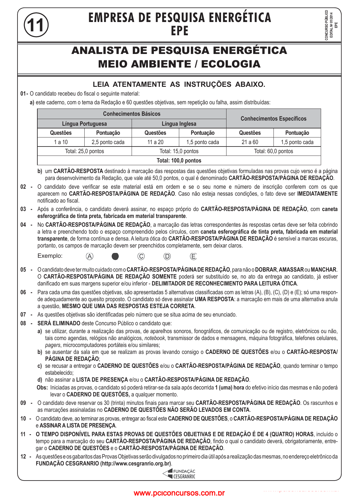 pcimarkpci MDAwMDowMDAwOjAwMDA6MDAwMDowMDAwOmZmZmY6MmQ4YzpjMGE1:U2F0LCAyOCBKdW4gMjAyNSAwOToyNDozNyAtMDMwMA== www.pciconcursos.com.brwww.pciconcursos.com.br 1 ANALISTA DE PESQUISA ENERGÉTICA MEIO AMBIENTE / ECOLOGIA EPEEMPRESA DE PESQUISA ENERGÉTICA EPE CO NC UR SO P ÚB LIC O ED ITA L N o 01 /20 14 EP E LEIA ATENTAMENTE AS INSTRUÇÕES ABAIXO. 01 - O candidato recebeu do fiscal o seguinte material: a) este caderno, com o tema da Redação e 60 questões objetivas, sem repetição ou falha, assim distribuídas: Conhecimentos Básicos Conhecimentos Específicos Língua Portuguesa Língua Inglesa Questões Pontuação Questões Pontuação Questões Pontuação 1 a 10 2,5 ponto cada 11 a 20 1,5 ponto cada 21 a 60 1,5 ponto cada Total: 25,0 pontos Total: 15,0 pontos Total: 60,0 pontos Total: 100,0 pontos b) um CARTÃO-RESPOSTA destinado à marcação das respostas das questões objetivas formuladas nas provas cujo verso é a página para desenvolvimento da Redação, que vale até 50,0 pontos, o qual é denominado CARTÃO-RESPOSTA/PÁGINA DE REDAÇÃO. 02 - O candidato deve verificar se este material está em ordem e se o seu nome e número de inscrição conferem com os que aparecem no CARTÃO-RESPOSTA/PÁGINA DE REDAÇÃO. Caso não esteja nessas condições, o fato deve ser IMEDIATAMENTE notificado ao fiscal. 03 - Após a conferência, o candidato deverá assinar, no espaço próprio do CARTÃO-RESPOSTA/PÁGINA DE REDAÇÃO, com caneta esferográfica de tinta preta, fabricada em material transparente. 04 - No CARTÃO-RESPOSTA/PÁGINA DE REDAÇÃO, a marcação das letras correspondentes às respostas certas deve ser feita cobrindo a letra e preenchendo todo o espaço compreendido pelos círculos, com caneta esferográfica de tinta preta, fabricada em material transparente, de forma contínua e densa. A leitura ótica do CARTÃO-RESPOSTA/PÁGINA DE REDAÇÃO é sensível a marcas escuras, portanto, os campos de marcação devem ser preenchidos completamente, sem deixar claros. Exemplo: 05 - O candidato deve ter muito cuidado com o CARTÃO-RESPOSTA/PÁGINA DE REDAÇÃO, para não o DOBRAR, AMASSAR ou MANCHAR. O CARTÃO-RESPOSTA/PÁGINA DE REDAÇÃO SOMENTE poderá ser substituído se, no ato da entrega ao candidato, já estiver danificado em suas margens superior e/ou inferior - DELIMITADOR DE RECONHECIMENTO PARA LEITURA ÓTICA. 06 - Para cada uma das questões objetivas, são apresentadas 5 alternativas classificadas com as letras (A), (B), (C), (D) e (E); só uma respon- de adequadamente ao quesito proposto. O candidato só deve assinalar UMA RESPOSTA: a marcação em mais de uma alternativa anula a questão, MESMO QUE UMA DAS RESPOSTAS ESTEJA CORRETA. 07 - As questões objetivas são identificadas pelo número que se situa acima de seu enunciado. 08 - SERÁ ELIMINADO deste Concurso Público o candidato que: a) se utilizar, durante a realização das provas, de aparelhos sonoros, fonográficos, de comunicação ou de registro, eletrônicos ou não, tais como agendas, relógios não analógicos, notebook, transmissor de dados e mensagens, máquina fotográfica, telefones celulares, pagers, microcomputadores portáteis e/ou similares; b) se ausentar da sala em que se realizam as provas levando consigo o CADERNO DE QUESTÕES e/ou o CARTÃO-RESPOSTA/ PÁGINA DE REDAÇÃO; c) se recusar a entregar o CADERNO DE QUESTÕES e/ou o CARTÃO-RESPOSTA/PÁGINA DE REDAÇÃO, quando terminar o tempo estabelecido; d) não assinar a LISTA DE PRESENÇA e/ou o CARTÃO-RESPOSTA/PÁGINA DE REDAÇÃO. Obs: Iniciadas as provas, o candidato só poderá retirar-se da sala após decorrida 1 (uma) hora do efetivo início das mesmas e não poderá levar o CADERNO DE QUESTÕES, a qualquer momento. 09 - O candidato deve reservar os 30 (trinta) minutos finais para marcar seu CARTÃO-RESPOSTA/PÁGINA DE REDAÇÃO. Os rascunhos e as marcações assinaladas no CADERNO DE QUESTÕES NÃO SERÃO LEVADOS EM CONTA. 10 - O candidato deve, ao terminar as provas, entregar ao fiscal este CADERNO DE QUESTÕES, o CARTÃO-RESPOSTA/PÁGINA DE REDAÇÃO e ASSINAR A LISTA DE PRESENÇA. 11 - O TEMPO DISPONÍVEL PARA ESTAS PROVAS DE QUESTÕES OBJETIVAS E DE REDAÇÃO É DE 4 (QUATRO) HORAS, incluído o tempo para a marcação do seu CARTÃO-RESPOSTA/PÁGINA DE REDAÇÃO, findo o qual o candidato deverá, obrigatoriamente, entre- gar o CADERNO DE QUESTÕES e o CARTÃO-RESPOSTA/PÁGINA DE REDAÇÃO. 12 - As questões e os gabaritos das Provas Objetivas serão divulgados no primeiro dia útil após a realização das mesmas, no endereço eletrônico da FUNDAÇÃO CESGRANRIO (http://www.cesgranrio.org.br). ANALISTA DE PESQUISA ENERGÉTICA 11 MEIO AMBIENTE / ECOLOGIA pcimarkpci MDAwMDowMDAwOjAwMDA6MDAwMDowMDAwOmZmZmY6MmQ4YzpjMGE1:U2F0LCAyOCBKdW4gMjAyNSAwOToyNDozNyAtMDMwMA== www.pciconcursos.com.brwww.pciconcursos.com.br ANALISTA DE PESQUISA ENERGÉTICA MEIO AMBIENTE / ECOLOGIA 2 EPE R E D A Ç Ã O A vida em comunidades, grandes ou pequenas, requer equilíbrio entre os direitos individuais e as regras de boa convivência, tanto no espaço privado quanto no espaço público. Na legislação atual, existem leis que, em função de suas finalidades, estabelecem restrições objetivas para a geração de ruídos durante dia e noite. Se por um lado sabe-se que estudos médicos consideram que o volume elevado pode causar danos à saúde humana e dos animais, por outro lado, som alto pode vir associado à alegria, como ocorre em bailes de carnaval e em festas públicas. Pesquisa feita sobre o assunto no Google traz matérias que ilustram as duas posições. O incômodo produzido pelo som está presente em títulos como “Moradores reclamam do som alto no Pacaembu”, “Quando é possível reclamar do vizinho barulhento” e “Som alto prejudica a saúde”. Por outro lado, há um site no Facebook intitulado “Loucos por som Alto” e uma postagem no Instagram que afirma “É assim que começa a segundona!!! Som alto e alegria pra trabalhar e tr