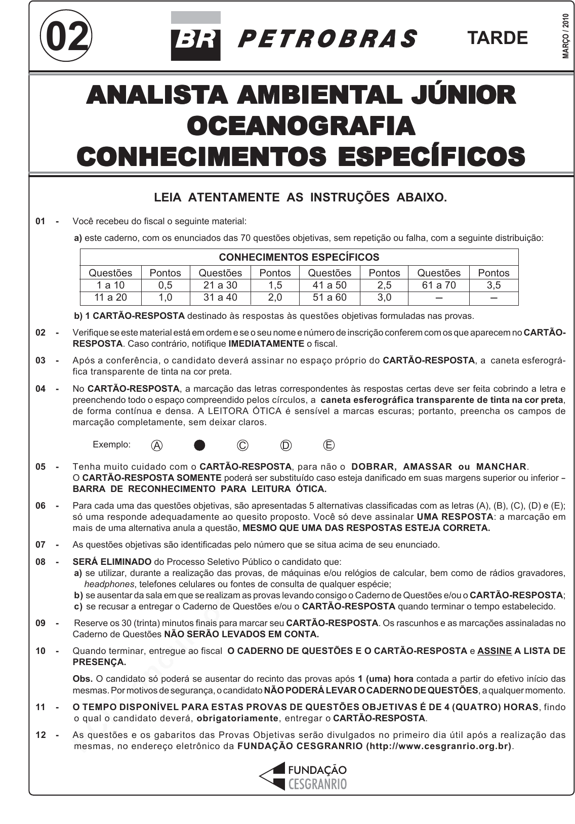 pcimarkpci MDAwMDowMDAwOjAwMDA6MDAwMDowMDAwOmZmZmY6MmQ4YzpjMGM1:RnJpLCAyNyBKdW4gMjAyNSAxMzoxMjo0OCAtMDMwMA== www.pciconcursos.com.br ANANANANANALISTALISTALISTALISTALISTA A A A A AMBIENTAMBIENTAMBIENTAMBIENTAMBIENTALALALALAL JÚNIOR JÚNIOR JÚNIOR JÚNIOR JÚNIOR OCEANOGRAFIAOCEANOGRAFIAOCEANOGRAFIAOCEANOGRAFIAOCEANOGRAFIA CONHECIMENTCONHECIMENTCONHECIMENTCONHECIMENTCONHECIMENTOS ESPECÍFICOSOS ESPECÍFICOSOS ESPECÍFICOSOS ESPECÍFICOSOS ESPECÍFICOS MA RÇ O / 2 01 0 TARDE02 LEIA ATENTAMENTE AS INSTRUÇÕES ABAIXO. 01 - Você recebeu do fiscal o seguinte material: a) este caderno, com os enunciados das 70 questões objetivas, sem repetição ou falha, com a seguinte distribuição: b) 1 CARTÃO-RESPOSTA destinado às respostas às questões objetivas formuladas nas provas. 02 - Verifique se este material está em ordem e se o seu nome e número de inscrição conferem com os que aparecem no CARTÃO- RESPOSTA. Caso contrário, notifique IMEDIATAMENTE o fiscal. 03 - Após a conferência, o candidato deverá assinar no espaço próprio do CARTÃO-RESPOSTA, a caneta esferográ- fica transparente de tinta na cor preta. 04 - No CARTÃO-RESPOSTA, a marcação das letras correspondentes às respostas certas deve ser feita cobrindo a letra e preenchendo todo o espaço compreendido pelos círculos, a caneta esferográfica transparente de tinta na cor preta, de forma contínua e densa. A LEITORA ÓTICA é sensível a marcas escuras; portanto, preencha os campos de marcação completamente, sem deixar claros. Exemplo: A C D E 05 - Tenha muito cuidado com o CARTÃO-RESPOSTA, para não o DOBRAR, AMASSAR ou MANCHAR. O CARTÃO-RESPOSTA SOMENTE poderá ser substituído caso esteja danificado em suas margens superior ou inferior - BARRA DE RECONHECIMENTO PARA LEITURA ÓTICA. 06 - Para cada uma das questões objetivas, são apresentadas 5 alternativas classificadas com as letras (A), (B), (C), (D) e (E); só uma responde adequadamente ao quesito proposto. Você só deve assinalar UMA RESPOSTA: a marcação em mais de uma alternativa anula a questão, MESMO QUE UMA DAS RESPOSTAS ESTEJA CORRETA. 07 - As questões objetivas são identificadas pelo número que se situa acima de seu enunciado. 08 - SERÁ ELIMINADO do Processo Seletivo Público o candidato que: a) se utilizar, durante a realização das provas, de máquinas e/ou relógios de calcular, bem como de rádios gravadores, headphones, telefones celulares ou fontes de consulta de qualquer espécie; b) se ausentar da sala em que se realizam as provas levando consigo o Caderno de Questões e/ou o CARTÃO-RESPOSTA; c) se recusar a entregar o Caderno de Questões e/ou o CARTÃO-RESPOSTA quando terminar o tempo estabelecido. 09 - Reserve os 30 (trinta) minutos finais para marcar seu CARTÃO-RESPOSTA. Os rascunhos e as marcações assinaladas no Caderno de Questões NÃO SERÃO LEVADOS EM CONTA. 10 - Quando terminar, entregue ao fiscal O CADERNO DE QUESTÕES E O CARTÃO-RESPOSTA e ASSINE A LISTA DE PRESENÇA. Obs. O candidato só poderá se ausentar do recinto das provas após 1 (uma) hora contada a partir do efetivo início das mesmas. Por motivos de segurança, o candidato NÃO PODERÁ LEVAR O CADERNO DE QUESTÕES, a qualquer momento. 11 - O TEMPO DISPONÍVEL PARA ESTAS PROVAS DE QUESTÕES OBJETIVAS É DE 4 (QUATRO) HORAS, findo o qual o candidato deverá, obrigatoriamente, entregar o CARTÃO-RESPOSTA. 12 - As questões e os gabaritos das Provas Objetivas serão divulgados no primeiro dia útil após a realização das mesmas, no endereço eletrônico da FUNDAÇÃO CESGRANRIO (http://www.cesgranrio.org.br). CONHECIMENTOS ESPECÍFICOS Questões 1 a 10 11 a 20 Pontos 0,5 1,0 Questões 21 a 30 31 a 40 Pontos 1,5 2,0 Questões 41 a 50 51 a 60 Pontos 2,5 3,0 Questões 61 a 70 - Pontos 3,5 - pcimarkpci MDAwMDowMDAwOjAwMDA6MDAwMDowMDAwOmZmZmY6MmQ4YzpjMGM1:RnJpLCAyNyBKdW4gMjAyNSAxMzoxMjo0OCAtMDMwMA== www.pciconcursos.com.br ANALISTA AMBIENTAL JÚNIOR / OCEANOGRAFIA 2 pcimarkpci MDAwMDowMDAwOjAwMDA6MDAwMDowMDAwOmZmZmY6MmQ4YzpjMGM1:RnJpLCAyNyBKdW4gMjAyNSAxMzoxMjo0OCAtMDMwMA== www.pciconcursos.com.br ANALISTA AMBIENTAL JÚNIOR / OCEANOGRAFIA 3 CONHECIMENTOS ESPECÍFICOS Considere a figura a seguir para responder às questões de nos 1 a 3. 1 Descoberto em 2009, o GJ 1214 b, ilustrado acima, é um planeta extrassolar cujo raio mede cerca de duas vezes e meia o raio da Terra. Evidências indicam que se trata de um Planeta-oceano, onde a água representa cerca de ¾ de sua massa. Considerando que haja condições de vida em GJ 1214 b, seria correta a hipótese de que há, neste planeta, maior disponibilidade de habitats para organismos (A) estuarinos. (B) pelágicos. (C) insulares. (D) recifais. (E) neríticos. 2 Suponha que fontes hidrotermais presentes no assoalho oceânico fossem a única fonte primária de energia dispo- nível para os processos vitais em GJ 1214 b. Neste caso, seriam grandes as chances de que a base da cadeia alimentar fosse composta por organismos (A) heterotróficos. (B) fotossintetizantes. (C) clorofilados. (D) quimiossintetizantes. (E) pigmentados. 3 Um aspecto intrigante sobre o planeta GJ 1214 b diz res- peito à origem de seu vasto oceano. Considerando a pro- porção da massa de água em relação à massa total do planeta, não é possível traçar um paralelo com a gênese dos oceanos do planeta Terra, os quais, por sua vez, fo- ram formados a partir do(a) (A) manto. (B) núcleo. (C) meteorito. (D) atmosfera. (E) massa continental. 4 Estima-se que cerca de 90% dos seres vivos que habitam a zona mesopelágica possuam algum tipo de biolumi- nescência. Esse padrão está diretamente relacionado ao fato de que nesta região (A) há pouca ou quase nenhuma luz. (B) há dominância de organismos sésseis. (C) há intensa turbulência causada por ondas. (D) não há espécies formadoras de cardumes. (E) não há anteparos para a propagação de sons. 5 A grande maioria dos cerca de 35 filos animais reconheci- dos possui representantes que vivem