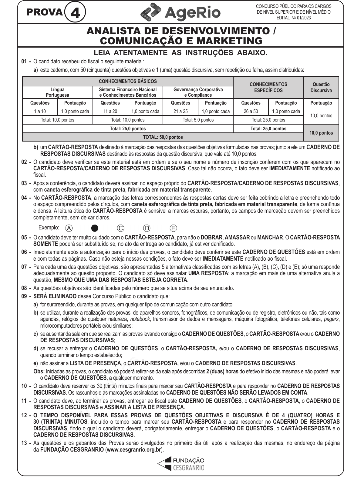 pcimarkpci MDAwMDowMDAwOjAwMDA6MDAwMDowMDAwOmZmZmY6MmQ4YzpjMGE1:U2F0LCAyOCBKdW4gMjAyNSAwOToyMTowMiAtMDMwMA== www.pciconcursos.com.br CONCURSO PÚBLICO PARA OS CARGOS DE NÍVEL SUPERIOR E DE NÍVEL MÉDIO EDITAL NO 01/2023 LEIA ATENTAMENTE AS INSTRUÇÕES ABAIXO. 01 - O candidato recebeu do fiscal o seguinte material: a) este caderno, com 50 (cinquenta) questões objetivas e 1 (uma) questão discursiva, sem repetição ou falha, assim distribuídas: CONHECIMENTOS BÁSICOS CONHECIMENTOS ESPECÍFICOS Questão DiscursivaLíngua Portuguesa Sistema Financeiro Nacional e Conhecimentos Bancários Governança Corporativa e Compliance Questões Pontuação Questões Pontuação Questões Pontuação Questões Pontuação Pontuação 1 a 10 1,0 ponto cada 11 a 20 1,0 ponto cada 21 a 25 1,0 ponto cada 26 a 50 1,0 ponto cada 10,0 pontos Total: 10,0 pontos Total: 10,0 pontos Total: 5,0 pontos Total: 25,0 pontos Total: 25,0 pontos Total: 25,0 pontos 10,0 pontos TOTAL: 50,0 pontos b) um CARTÃO-RESPOSTA destinado à marcação das respostas das questões objetivas formuladas nas provas; junto a ele um CADERNO DE RESPOSTAS DISCURSIVAS destinado às respostas da questão discursiva, que vale até 10,0 pontos. 02 - O candidato deve verificar se este material está em ordem e se o seu nome e número de inscrição conferem com os que aparecem no CARTÃO-RESPOSTA/CADERNO DE RESPOSTAS DISCURSIVAS. Caso tal não ocorra, o fato deve ser IMEDIATAMENTE notificado ao fiscal. 03 - Após a conferência, o candidato deverá assinar, no espaço próprio do CARTÃO-RESPOSTA/CADERNO DE RESPOSTAS DISCURSIVAS, com caneta esferográfica de tinta preta, fabricada em material transparente. 04 - No CARTÃO-RESPOSTA, a marcação das letras correspondentes às respostas certas deve ser feita cobrindo a letra e preenchendo todo o espaço compreendido pelos círculos, com caneta esferográfica de tinta preta, fabricada em material transparente, de forma contínua e densa. A leitura ótica do CARTÃO-RESPOSTA é sensível a marcas escuras, portanto, os campos de marcação devem ser preenchidos completamente, sem deixar claros. Exemplo: 05 - O candidato deve ter muito cuidado com o CARTÃO-RESPOSTA, para não o DOBRAR, AMASSAR ou MANCHAR. O CARTÃO-RESPOSTA SOMENTE poderá ser substituído se, no ato da entrega ao candidato, já estiver danificado. 06 - Imediatamente após a autorização para o início das provas, o candidato deve conferir se este CADERNO DE QUESTÕES está em ordem e com todas as páginas. Caso não esteja nessas condições, o fato deve ser IMEDIATAMENTE notificado ao fiscal. 07 - Para cada uma das questões objetivas, são apresentadas 5 alternativas classificadas com as letras (A), (B), (C), (D) e (E); só uma responde adequadamente ao quesito proposto. O candidato só deve assinalar UMA RESPOSTA: a marcação em mais de uma alternativa anula a questão, MESMO QUE UMA DAS RESPOSTAS ESTEJA CORRETA. 08 - As questões objetivas são identificadas pelo número que se situa acima de seu enunciado. 09 - SERÁ ELIMINADO desse Concurso Público o candidato que: a) for surpreendido, durante as provas, em qualquer tipo de comunicação com outro candidato; b) se utilizar, durante a realização das provas, de aparelhos sonoros, fonográficos, de comunicação ou de registro, eletrônicos ou não, tais como agendas, relógios de qualquer natureza, notebook, transmissor de dados e mensagens, máquina fotográfica, telefones celulares, pagers, microcomputadores portáteis e/ou similares; c) se ausentar da sala em que se realizam as provas levando consigo o CADERNO DE QUESTÕES, o CARTÃO-RESPOSTA e/ou o CADERNO DE RESPOSTAS DISCURSIVAS; d) se recusar a entregar o CADERNO DE QUESTÕES, o CARTÃO-RESPOSTA, e/ou o CADERNO DE RESPOSTAS DISCURSIVAS, quando terminar o tempo estabelecido; e) não assinar a LISTA DE PRESENÇA, o CARTÃO-RESPOSTA, e/ou o CADERNO DE RESPOSTAS DISCURSIVAS. Obs: Iniciadas as provas, o candidato só poderá retirar-se da sala após decorridas 2 (duas) horas do efetivo início das mesmas e não poderá levar o CADERNO DE QUESTÕES, a qualquer momento. 10 - O candidato deve reservar os 30 (trinta) minutos finais para marcar seu CARTÃO-RESPOSTA e para responder no CADERNO DE RESPOSTAS DISCURSIVAS. Os rascunhos e as marcações assinaladas no CADERNO DE QUESTÕES NÃO SERÃO LEVADOS EM CONTA. 11 - O candidato deve, ao terminar as provas, entregar ao fiscal este CADERNO DE QUESTÕES, o CARTÃO-RESPOSTA, o CADERNO DE RESPOSTAS DISCURSIVAS e ASSINAR A LISTA DE PRESENÇA. 12 - O TEMPO DISPONÍVEL PARA ESSAS PROVAS DE QUESTÕES OBJETIVAS E DISCURSIVA É DE 4 (QUATRO) HORAS E 30 (TRINTA) MINUTOS, incluído o tempo para marcar seu CARTÃO-RESPOSTA e para responder no CADERNO DE RESPOSTAS DISCURSIVAS, findo o qual o candidato deverá, obrigatoriamente, entregar o CADERNO DE QUESTÕES, o CARTÃO-RESPOSTA e o CADERNO DE RESPOSTAS DISCURSIVAS. 13 - As questões e os gabaritos das Provas serão divulgados no primeiro dia útil após a realização das mesmas, no endereço da página da FUNDAÇÃO CESGRANRIO (www.cesgranrio.org.br). PROVA ANALISTA DE DESENVOLVIMENTO / COMUNICAÇÃO E MARKETING 4 pcimarkpci MDAwMDowMDAwOjAwMDA6MDAwMDowMDAwOmZmZmY6MmQ4YzpjMGE1:U2F0LCAyOCBKdW4gMjAyNSAwOToyMTowMiAtMDMwMA== www.pciconcursos.com.br PROVA 4 - ANALISTA DE DESENVOLVIMENTO/ COMUNICAÇÃO E MARKETING 2 AgeRio CONHECIMENTOS BÁSICOS LÍNGUA PORTUGUESA Eu sei, mas não devia Eu sei que a gente se acostuma. Mas não devia. A gente se acostuma a morar em apartamentos de fundos e a não ter outra vista que não as janelas ao redor. E, porque não tem vista, logo se acostu- ma a não olhar para fora. E, porque não olha para fora, logo se acostuma a não abrir de todo as corti- nas. E, porque não abre as cortinas, logo se acostu- ma a acender mais cedo a luz. E, à medida que se acostuma, esquece o sol, esquece o ar, esquece a amplidão. A gente se acostuma a acordar de manhã so- bressaltado porque está na hora. A tomar o café c