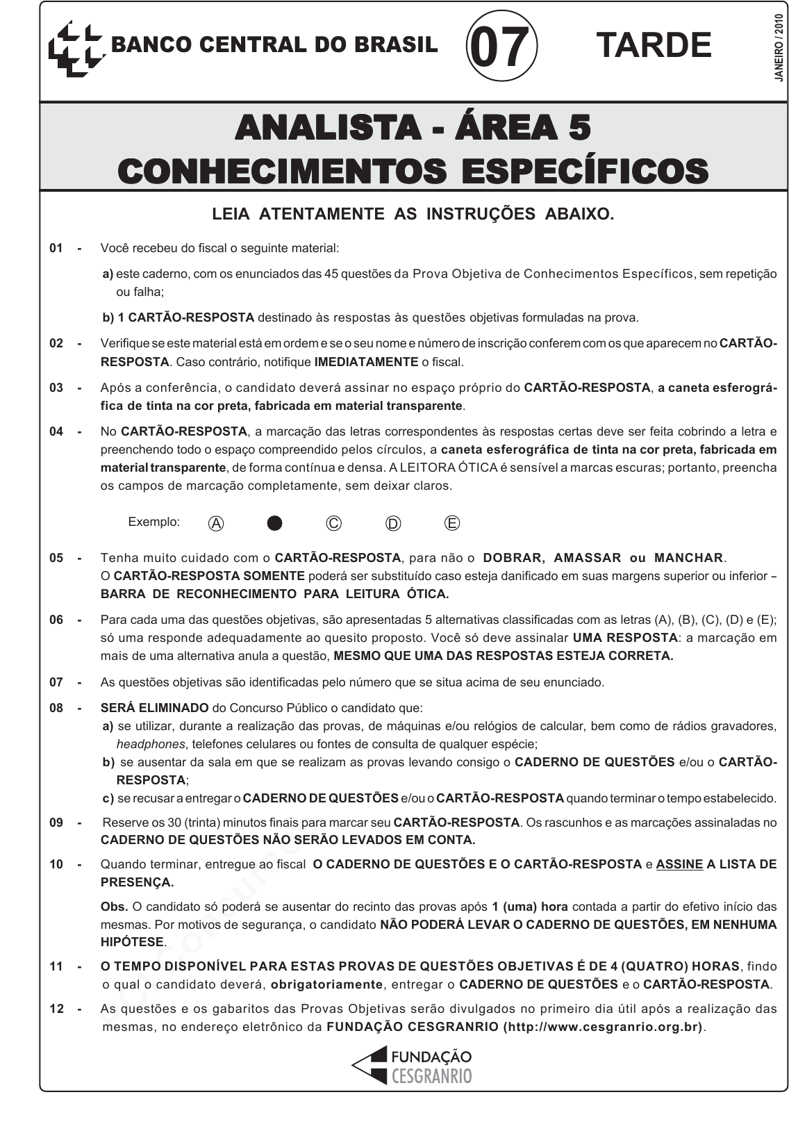 pcimarkpci MDAwMDowMDAwOjAwMDA6MDAwMDowMDAwOmZmZmY6OTU0ZTpiYjcw:RnJpLCAyNyBKdW4gMjAyNSAxMToyMDo1MiAtMDMwMA== www.pciconcursos.com.br ANANANANANALISTALISTALISTALISTALISTA - ÁREA 5A - ÁREA 5A - ÁREA 5A - ÁREA 5A - ÁREA 5 CONHECIMENTCONHECIMENTCONHECIMENTCONHECIMENTCONHECIMENTOS ESPECÍFICOSOS ESPECÍFICOSOS ESPECÍFICOSOS ESPECÍFICOSOS ESPECÍFICOS LEIA ATENTAMENTE AS INSTRUÇÕES ABAIXO. 01 - Você recebeu do fiscal o seguinte material: a) este caderno, com os enunciados das 45 questões da Prova Objetiva de Conhecimentos Específicos, sem repetição ou falha; b) 1 CARTÃO-RESPOSTA destinado às respostas às questões objetivas formuladas na prova. 02 - Verifique se este material está em ordem e se o seu nome e número de inscrição conferem com os que aparecem no CARTÃO- RESPOSTA. Caso contrário, notifique IMEDIATAMENTE o fiscal. 03 - Após a conferência, o candidato deverá assinar no espaço próprio do CARTÃO-RESPOSTA, a caneta esferográ- fica de tinta na cor preta, fabricada em material transparente. 04 - No CARTÃO-RESPOSTA, a marcação das letras correspondentes às respostas certas deve ser feita cobrindo a letra e preenchendo todo o espaço compreendido pelos círculos, a caneta esferográfica de tinta na cor preta, fabricada em material transparente, de forma contínua e densa. A LEITORA ÓTICA é sensível a marcas escuras; portanto, preencha os campos de marcação completamente, sem deixar claros. Exemplo: A C D E 05 - Tenha muito cuidado com o CARTÃO-RESPOSTA, para não o DOBRAR, AMASSAR ou MANCHAR. O CARTÃO-RESPOSTA SOMENTE poderá ser substituído caso esteja danificado em suas margens superior ou inferior - BARRA DE RECONHECIMENTO PARA LEITURA ÓTICA. 06 - Para cada uma das questões objetivas, são apresentadas 5 alternativas classificadas com as letras (A), (B), (C), (D) e (E); só uma responde adequadamente ao quesito proposto. Você só deve assinalar UMA RESPOSTA: a marcação em mais de uma alternativa anula a questão, MESMO QUE UMA DAS RESPOSTAS ESTEJA CORRETA. 07 - As questões objetivas são identificadas pelo número que se situa acima de seu enunciado. 08 - SERÁ ELIMINADO do Concurso Público o candidato que: a) se utilizar, durante a realização das provas, de máquinas e/ou relógios de calcular, bem como de rádios gravadores, headphones, telefones celulares ou fontes de consulta de qualquer espécie; b) se ausentar da sala em que se realizam as provas levando consigo o CADERNO DE QUESTÕES e/ou o CARTÃO- RESPOSTA; c) se recusar a entregar o CADERNO DE QUESTÕES e/ou o CARTÃO-RESPOSTA quando terminar o tempo estabelecido. 09 - Reserve os 30 (trinta) minutos finais para marcar seu CARTÃO-RESPOSTA. Os rascunhos e as marcações assinaladas no CADERNO DE QUESTÕES NÃO SERÃO LEVADOS EM CONTA. 10 - Quando terminar, entregue ao fiscal O CADERNO DE QUESTÕES E O CARTÃO-RESPOSTA e ASSINE A LISTA DE PRESENÇA. Obs. O candidato só poderá se ausentar do recinto das provas após 1 (uma) hora contada a partir do efetivo início das mesmas. Por motivos de segurança, o candidato NÃO PODERÁ LEVAR O CADERNO DE QUESTÕES, EM NENHUMA HIPÓTESE. 11 - O TEMPO DISPONÍVEL PARA ESTAS PROVAS DE QUESTÕES OBJETIVAS É DE 4 (QUATRO) HORAS, findo o qual o candidato deverá, obrigatoriamente, entregar o CADERNO DE QUESTÕES e o CARTÃO-RESPOSTA. 12 - As questões e os gabaritos das Provas Objetivas serão divulgados no primeiro dia útil após a realização das mesmas, no endereço eletrônico da FUNDAÇÃO CESGRANRIO (http://www.cesgranrio.org.br). 07 TARDE JA NE IR O / 2 01 0 BANCO CENTRAL DO BRASIL pcimarkpci MDAwMDowMDAwOjAwMDA6MDAwMDowMDAwOmZmZmY6OTU0ZTpiYjcw:RnJpLCAyNyBKdW4gMjAyNSAxMToyMDo1MiAtMDMwMA== www.pciconcursos.com.br ANALISTA - ÁREA 5 CONHECIMENTOS ESPECÍFICOS 2 pcimarkpci MDAwMDowMDAwOjAwMDA6MDAwMDowMDAwOmZmZmY6OTU0ZTpiYjcw:RnJpLCAyNyBKdW4gMjAyNSAxMToyMDo1MiAtMDMwMA== www.pciconcursos.com.br ANALISTA - ÁREA 5 CONHECIMENTOS ESPECÍFICOS 3 CONHECIMENTOS ESPECÍFICOS 1 Na era da informação, as organizações precisam ser hábeis na gestão do conhecimento. A gestão por compe- tências é uma proposta que visa a auxiliar no alcance desse objetivo. A gestão por competências envolve a (A) criação de um banco de talentos interno que inclua as habilidades e as lacunas de formação das pessoas da organização. (B) criação de um banco de informações e casos, em que os funcionários registram e compartilham suas infor- mações, experiências, ideias, problemas, soluções. (C) criação de um mapa de processos e competências, que pode ser feito pela equipe de trabalho e permite ampliar a visão sistêmica das tarefas realizadas. (D) formação de grupos de profissionais que se reúnem periodicamente para trocar ideias e experiências. (E) definição de um processo contínuo de disseminação e recuperação de informações para os diversos níveis e setores da organização. 2 Cauã é um coordenador de uma importante divisão em sua organização. Sofia, uma de suas subordinadas, descreve-o como um “chefe que foge das responsabilida- des e que evita tomar decisões”, no entanto “reconhece nosso trabalho e negocia constantemente com os seus funcionários, prometendo recompensas em troca de bom desempenho.” Segundo Carol, outra de suas subordina- das, “Cauã só aparece quando algo dá errado, preocupan- do-se mais em punir do que em prevenir determinados desvios”. De acordo com as teorias de liderança, Cauã é um líder (A) transformacional. (B) negociador. (C) autocrático. (D) democrático. (E) transacional. 3 Tina é coordenadora da unidade responsável pela elaboração e implementação de normas técnicas de uma organização financeira. Apesar de gerenciar apenas uma unidade, ela tem uma visão holística da organização. Ela enxerga a sua unidade como um dos muitos elementos da organização, e esta, como integrante de sistemas maiores, como o sistema financeiro brasileiro. Tina reconhece a interdependênc