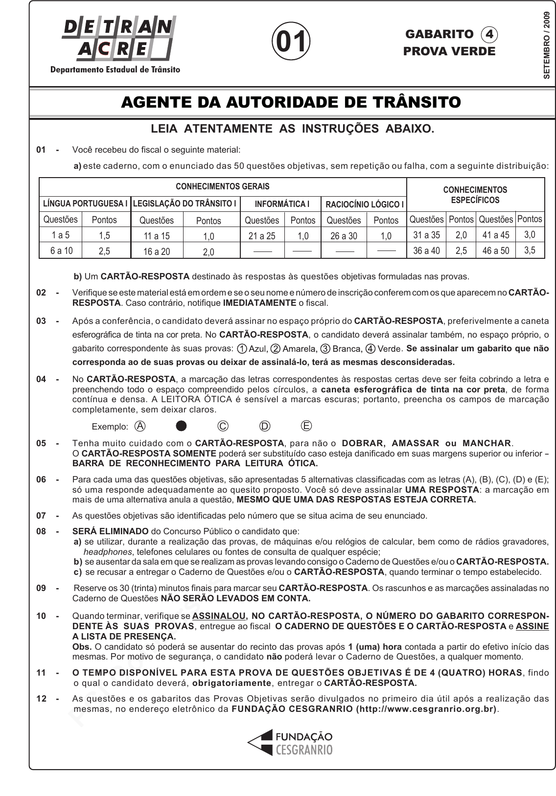 pcimarkpci MDAwMDowMDAwOjAwMDA6MDAwMDowMDAwOmZmZmY6OTU0ZTpiYjcw:RnJpLCAyNyBKdW4gMjAyNSAxMToxMjo0NyAtMDMwMA== www.pciconcursos.com.br AGENTE DA AUTORIDADE DE TRÂNSITO SE TE M B R O / 20 09 LEIA ATENTAMENTE AS INSTRUÇÕES ABAIXO. 01 - Você recebeu do fiscal o seguinte material: a) este caderno, com o enunciado das 50 questões objetivas, sem repetição ou falha, com a seguinte distribuição: b) Um CARTÃO-RESPOSTA destinado às respostas às questões objetivas formuladas nas provas. 02 - Verifique se este material está em ordem e se o seu nome e número de inscrição conferem com os que aparecem no CARTÃO- RESPOSTA. Caso contrário, notifique IMEDIATAMENTE o fiscal. 03 - Após a conferência, o candidato deverá assinar no espaço próprio do CARTÃO-RESPOSTA, preferivelmente a caneta esferográfica de tinta na cor preta. No CARTÃO-RESPOSTA, o candidato deverá assinalar também, no espaço próprio, o gabarito correspondente às suas provas: . Se assinalar um gabarito que não corresponda ao de suas provas ou deixar de assinalá-lo, terá as mesmas desconsideradas. 04 - No CARTÃO-RESPOSTA, a marcação das letras correspondentes às respostas certas deve ser feita cobrindo a letra e preenchendo todo o espaço compreendido pelos círculos, a caneta esferográfica de tinta na cor preta, de forma contínua e densa. A LEITORA ÓTICA é sensível a marcas escuras; portanto, preencha os campos de marcação completamente, sem deixar claros. Exemplo: 05 - Tenha muito cuidado com o CARTÃO-RESPOSTA, para não o DOBRAR, AMASSAR ou MANCHAR. O CARTÃO-RESPOSTA SOMENTE poderá ser substituído caso esteja danificado em suas margens superior ou inferior - BARRA DE RECONHECIMENTO PARA LEITURA ÓTICA. 06 - Para cada uma das questões objetivas, são apresentadas 5 alternativas classificadas com as letras (A), (B), (C), (D) e (E); só uma responde adequadamente ao quesito proposto. Você só deve assinalar UMA RESPOSTA: a marcação em mais de uma alternativa anula a questão, MESMO QUE UMA DAS RESPOSTAS ESTEJA CORRETA. 07 - As questões objetivas são identificadas pelo número que se situa acima de seu enunciado. 08 - SERÁ ELIMINADO do Concurso Público o candidato que: a) se utilizar, durante a realização das provas, de máquinas e/ou relógios de calcular, bem como de rádios gravadores, headphones, telefones celulares ou fontes de consulta de qualquer espécie; b) se ausentar da sala em que se realizam as provas levando consigo o Caderno de Questões e/ou o CARTÃO-RESPOSTA. c) se recusar a entregar o Caderno de Questões e/ou o CARTÃO-RESPOSTA, quando terminar o tempo estabelecido. 09 - Reserve os 30 (trinta) minutos finais para marcar seu CARTÃO-RESPOSTA. Os rascunhos e as marcações assinaladas no Caderno de Questões NÃO SERÃO LEVADOS EM CONTA. 10 - Quando terminar, verifique se ASSINALOU, NO CARTÃO-RESPOSTA, O NÚMERO DO GABARITO CORRESPON- DENTE ÀS SUAS PROVAS, entregue ao fiscal O CADERNO DE QUESTÕES E O CARTÃO-RESPOSTA e ASSINE A LISTA DE PRESENÇA. Obs. O candidato só poderá se ausentar do recinto das provas após 1 (uma) hora contada a partir do efetivo início das mesmas. Por motivo de segurança, o candidato não poderá levar o Caderno de Questões, a qualquer momento. 11 - O TEMPO DISPONÍVEL PARA ESTA PROVA DE QUESTÕES OBJETIVAS É DE 4 (QUATRO) HORAS, findo o qual o candidato deverá, obrigatoriamente, entregar o CARTÃO-RESPOSTA. 12 - As questões e os gabaritos das Provas Objetivas serão divulgados no primeiro dia útil após a realização das mesmas, no endereço eletrônico da FUNDAÇÃO CESGRANRIO (http://www.cesgranrio.org.br). GABARITO 4 PROVA VERDE01 A C D E Departamento Estadual de Trânsito LÍNGUA PORTUGUESA I Questões 1 a 5 6 a 10 Pontos 1,5 2,5 Questões 11 a 15 16 a 20 Pontos 1,0 2,0 LEGISLAÇÃO DO TRÂNSITO I Questões 26 a 30 Pontos 1,0 CONHECIMENTOS ESPECÍFICOS Questões 31 a 35 36 a 40 Pontos 2,0 2,5 Questões 41 a 45 46 a 50 Pontos 3,0 3,5 RACIOCÍNIO LÓGICO I CONHECIMENTOS GERAIS INFORMÁTICA I Questões 21 a 25 Pontos 1,0 pcimarkpci MDAwMDowMDAwOjAwMDA6MDAwMDowMDAwOmZmZmY6OTU0ZTpiYjcw:RnJpLCAyNyBKdW4gMjAyNSAxMToxMjo0NyAtMDMwMA== www.pciconcursos.com.br AGENTE DA AUTORIDADE DE TRÂNSITO 2 Departamento Estadual de Trânsito GABARITO 4 - PROVA VERDE LÍNGUA PORTUGUESA I TRÂNSITO NAS GRANDES CIDADES: O PREÇO DO TEMPO PERDIDO Quem não passou pelo pesadelo de sair de casa para um compromisso com hora marcada e ver o cronograma estourar por causa do trânsito? Assim se perderam viagens, reuniões de negócios, provas na escola e outras oportunidades. Resultado: prejuízo na certa. Seja ele financeiro ou mesmo moral — afinal, como fica a cara de quem chega atrasado ao trabalho? Mas será que existe um mecanismo que leve ao cálcu- lo das perdas provocadas por estes preciosos minutos gastos dentro de um automóvel — ou transporte coleti- vo — numa avenida de uma grande cidade brasileira? Quanto custa um engarrafamento? As respostas para estas perguntas, infelizmente, ninguém sabe ao certo. Estudo do Denatran, em parceria com o Ipea, so- bre “Impactos Sociais e Econômicos dos Acidentes de Trânsito nas Rodovias Brasileiras” revela que — além da perda de tempo — a retenção no trânsito provoca ainda o aumento do custo de operação de cada veículo — combustível e desgaste de peças. Os congestio- namentos trazem danos também para os governos. Cidades e estados gastam fortunas com esquemas de tráfego, engenheiros, equipamentos e guardas de trân- sito. Quando motivado por acidente, o engarrafamento fica ainda mais caro, pois envolve bombeiros, ambu- lâncias, médicos, hospitais, internações, medicamen- tos, lucros cessantes e, eventualmente, custos fúne- bres, além das perdas familiares. Nos Estados Unidos, as autoridades incluíram, no custo financeiro do engar- rafamento, o estresse emocional provocado em suas 75 maiores cidades. Conta final: U$ 70 bilhões/ano. Isso sem falar nos custos ambientais — é con