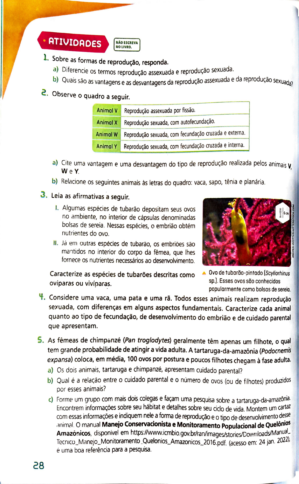 ATIVIDADES NÃO ESCREVA NO LIVRO. 1. Sobre as formas de reprodução, responda. a) Diferencie os termos reprodução assexuada e reprodução sexuada. b) Quais são as vantagens e as desvantagens da reprodução assexuada e da reprodução sexuada? 2. Observe quadro a seguir. Animal V Reprodução assexuada por fissão. Animal Reprodução sexuada, com autofecundação. Animal W Reprodução sexuada, com fecundação cruzada e externa. Animal Y Reprodução sexuada, com fecundação cruzada e interna. a) Cite uma vantagem e uma desvantagem do tipo de reprodução realizada pelos animais V, b) Relacione seguintes animais às letras do quadro: vaca, sapo, tênia e planária. 3. Leia as afirmativas a seguir. I. Algumas espécies de tubarão depositam seus ovos no ambiente, no interior de cápsulas denominadas bolsas de sereia. Nessas espécies, o embrião obtém nutrientes do ovo. II. Já em outras espécies de tubarão, os embriões são ANDREA mantidos no interior do corpo da fêmea, que lhes fornece nutrientes necessários ao desenvolvimento. Caracterize as espécies de tubarões descritas como Ovo de tubarão-pintado (Scyliorhinus ovíparas ou vivíparas. sp.). Esses ovos são conhecidos popularmente como bolsas de sereia. 4. Considere uma vaca, uma pata e uma rã. Todos esses animais realizam reprodução sexuada, com diferenças em alguns aspectos fundamentais. Caracterize cada animal quanto ao tipo de fecundação, de desenvolvimento do embrião e de cuidado parental que apresentam. 5. As fêmeas de chimpanzé (Pan troglodytes) geralmente têm apenas um filhote, qual tem grande probabilidade de atingir a vida adulta. A tartaruga-da-amazônia (Podocnemis expansa) coloca, em média, 100 ovos por postura e poucos filhotes chegam à fase adulta. a) Os dois animais, tartaruga e chimpanzé, apresentam cuidado parental? b) Qual é a relação entre cuidado parental e o número de ovos (ou de filhotes) produzidos por esses animais? c) Forme um grupo com mais dois colegas e façam uma pesquisa sobre a tartaruga-da-amazônia. Encontrem informações sobre seu hábitat e detalhes sobre seu ciclo de vida. Montem um cartaz com essas informações e indiquem nele a forma de reprodução e tipo de desenvolvimento desse animal. O manual Manejo Conservacionista e Monitoramento Populacional de Quelônios disponível em em: 24 jan. 2022), é uma boa referência para a pesquisa. 286. Associe os termos apresentados no quadro aos processos reprodutivos de "As fêmeas escavam tocas e fazem diferentes animais, descritos seguir. a postura de um a três ovos [...]. Quando Alguns termos podem ser utilizados mais os filhotes nascem, com cerca de 18 de uma vez. milímetros, se alimentam lambendo leite que escorre das glândulas nos Reprodução assexuada pelos e se deposita na barriga da mãe, Reprodução sexuada Fecundação interna já que ela não possui mamas", explica Fecundação externa Autofecundação o biólogo Dhiordan Lovestain. JANUZZI, Nicolle. Ornitorrinco bola OVO dos poucos venenosos 9 a) As tênias são vermes hermafroditas que fev. 2021. Disponível em geralmente vivem sozinhas e, por isso, em algumas regiões, são conhecidas por venenosos.ghtml. Acesso em. 24 solitárias. Na reprodução, há a união de gametas masculinos e femininos produ- zidos pelo mesmo indivíduo. a) A partir das informações do texto, é b) Algumas espécies de peixes liberam possível afirmar que os ornitorrincos gametas na água, onde ocorre a fecun- pertencem a qual grupo de animais? dação, produzindo centenas de Justifique sua resposta. c) As hidras são cnidários que podem se b) Os ornitorrincos são ovíparos ou vivípa- reproduzir por brotamento. Nesse caso, ros? Justifique com um trecho extraído forma-se um broto na superfície do do texto. corpo de um indivíduo, qual, após c) Os ornitorrincos apresentam cuidado crescer, desprende-se e fixa-se no subs- parental? Justifique sua resposta. trato, formando um novo indivíduo. d) Na reprodução de leões, os gametas 8. período de defeso corresponde a uma masculinos são depositados no inte- época do ano em que atividades de caça rior do corpo da fêmea, onde ocorre a e de pesca de certas espécies se tornam fecundação. proibidas ou restritas. Ele é determi- 7. Leia trecho a seguir. nado conforme ciclo reprodutivo das espécies, na tentativa de assegurar a produção e desenvolvimento dos filho- "É um animal [...] com a natureza tes, preservando as populações naturais. tríplice de peixe, pássaro e quadrú- defeso é, portanto, uma de pede, e não é aparentado com nada que proteção dos seres vivos e o desrespeito a nós já tenhamos visto." esse período configura crime ambiental. Foi assim que naturalista inglês Considere que dois amigos tenham Thomas Bewick descreveu pela marcado de pescar tambaqui (Colossoma primeira vez, em 1800, os ornitorrin- macropomum), uma espécie de peixe de em seu livro História Geral dos água doce, na cidade de Manaus (AM), Quadrúpedes [...]. entre os dias 5 e 12 de janeiro. Sabendo [...] que período de defeso do tambaqui, Mais de 200 anos depois, os orni- no estado do Amazonas, é de 1 de torrincos, que são naturais da Austrália outubro a 31 de março, explique a esses e da Tasmânia, continuam intrigando amigos por que a pesca deveria ser can- por suas características peculiares. [...] celada. Relacione seus argumentos com trechos do enunciado. 29