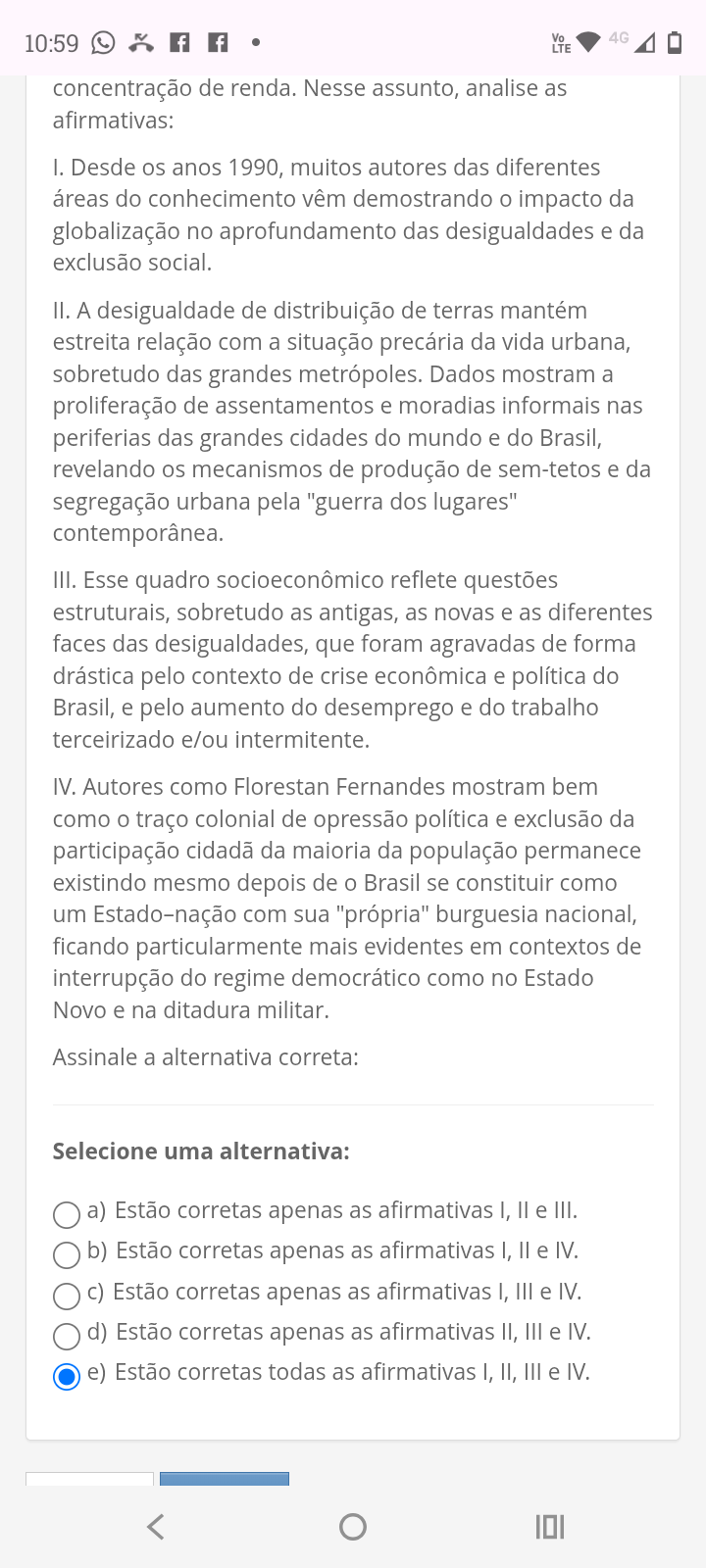10:59 f f Vo 4G LTE concentração de renda. Nesse assunto, analise as afirmativas: I. Desde os anos 1990, muitos autores das diferentes áreas do conhecimento vêm demostrando impacto da globalização no aprofundamento das desigualdades e da exclusão social. II. A desigualdade de distribuição de terras mantém estreita relação com a situação precária da vida urbana, sobretudo das grandes metrópoles. Dados mostram a proliferação de assentamentos e moradias informais nas periferias das grandes cidades do mundo e do Brasil, revelando os mecanismos de produção de sem-tetos e da segregação urbana pela "guerra dos lugares" contemporânea. III. Esse quadro socioeconômico reflete questões estruturais, sobretudo as antigas, as novas e as diferentes faces das desigualdades, que foram agravadas de forma drástica pelo contexto de crise econômica e política do Brasil, e pelo aumento do desemprego e do trabalho terceirizado e/ou intermitente. IV. Autores como Florestan Fernandes mostram bem como traço colonial de opressão política e exclusão da participação cidadã da maioria da população permanece existindo mesmo depois de 0 Brasil se constituir como um Estado-nação com sua "própria" burguesia nacional, ficando particularmente mais evidentes em contextos de interrupção do regime democrático como no Estado Novo e na ditadura militar. Assinale a alternativa correta: Selecione uma alternativa: a) Estão corretas apenas as afirmativas I, e III. b) Estão corretas apenas as afirmativas I, e IV. c) Estão corretas apenas as afirmativas I, III e IV. d) Estão corretas apenas as afirmativas II, III e IV. e) Estão corretas todas as afirmativas I, II, III e IV.
