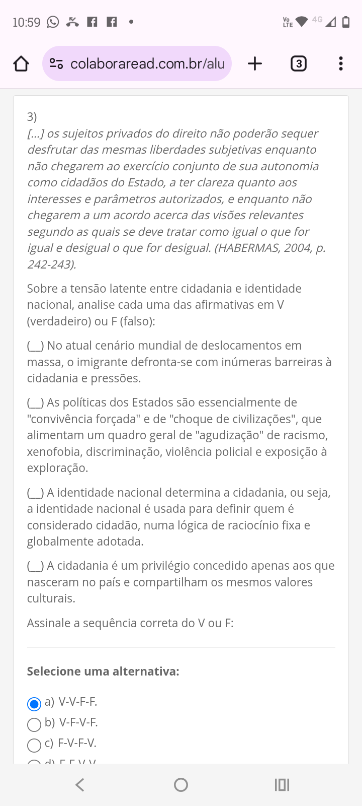 10:59 f f Vo 4G LTE colaboraread.com.br/alu + 3 3) [...] os sujeitos privados do direito não poderão sequer desfrutar das mesmas liberdades subjetivas enquanto não chegarem ao exercício conjunto de sua autonomia como cidadãos do Estado, a ter clareza quanto aos interesses e parâmetros autorizados, e enquanto não chegarem a um acordo acerca das visões relevantes segundo as quais se deve tratar como igual que for igual e desigual que for desigual. (HABERMAS, 2004, p. 242-243). Sobre a tensão latente entre cidadania e identidade nacional, analise cada uma das afirmativas em V (verdadeiro) ou F (falso): No atual cenário mundial de deslocamentos em massa, imigrante defronta-se com inúmeras barreiras à cidadania e pressões. (__) As políticas dos Estados são essencialmente de "convivência forçada" e de "choque de civilizações", que alimentam um quadro geral de "agudização" de racismo, xenofobia, discriminação, violência policial e exposição à exploração. (__) A identidade nacional determina a cidadania, ou seja, a identidade nacional é usada para definir quem é considerado cidadão, numa lógica de raciocínio fixa e globalmente adotada. (__) A cidadania é um privilégio concedido apenas aos que nasceram no país e compartilham os mesmos valores culturais. Assinale a sequência correta do V ou F: Selecione uma alternativa: a) V-V-F-F. b) V-F-V-F. c) F-V-F-V.