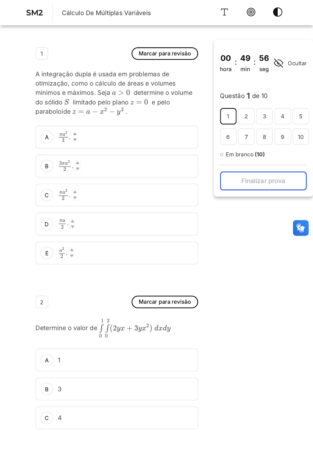 A B C D E A B C 1 Marcar para revisão A integração dupla é usada em problemas de otimização, como o cálculo de áreas e volumes mínimos e máximos. Seja determine o volume do sólido limitado pelo plano e pelo paraboloide . a > 0 S z = 0 z = a − x2 − y2 .πa2 3 .3πa2 2 .πa2 2 .πa 2 .a2 2 2 Marcar para revisão Determine o valor de 1 ∫ 0 2 ∫ 0 (2yx + 3yx2) dxdy 1 3 4 00 hora : 49 min : 56 seg Ocultar Questão 1 de 10 Em branco (10) Finalizar prova 1 2 3 4 5 6 7 8 9 10 SM2 Cálculo De Múltiplas Variáveis D E A B C D E 6 8 3 Marcar para revisão A integração dupla é usada em problemas de otimização, como o cálculo de áreas e volumes mínimos e máximos. Calcule as coordenadas e do centro de massa de um conjunto , sendo B o conjunto de todos tais que e a densidade é constante e igual a . x y B (x, y) x3 ≤ y ≤ x 1 ( , ) .7 15 8 21 ( , ) .8 21 8 15 ( , ) .8 15 8 21 ( , ) .8 15 8 15 ( , ) .8 21 8 21 4 Marcar para revisão A integração dupla é usada em problemas de otimização, como o cálculo de áreas e volumes mínimos e máximos. Seja determine o volume do sólido limitado pelo plano e pelo paraboloide . a > 0 S z = 0 z = a − x2 − y2 A B C D E A B C D E .πa2 3 .3πa2 2 .πa2 2 .πa 2 .a2 2 5 Marcar para revisão Determine o volume do sólido definido pelo cilindro parabólico e pelos planos x = 4, z = 6 e z = 0.x = y2 16 32 64 128 256 6 Marcar para revisão A integração tripla é uma das ferramentas fundamentais para o cálculo de volumes. Determine o volume de , sabendo que compreende a região contida dentro do cilindro , ∭ E x2dV E x2 + y2 = 1 A B C D E A B C D E acima do plano e abaixo do cone . z = 0 z2 = 4x2 + 4y2 .2π 5 .2 5 .π 5 .5π 2 π. 7 Marcar para revisão Uma integral tripla é uma extensão de uma integral dupla, que é usada para calcular a área de superfícies bidimensionais. Dessa forma, calcule a integral .∫ π 0 ∫ π 0 ∫ π 0 cos (u + v + w) dudvdw .π 2 π. 2π. .3π 2 0. A B C D E A B C 8 Marcar para revisão Uma ferramenta matemática muito importante é a integral de linha, pois permite trabalhar com um campo escalar, quando se depende de várias variáveis. Considerando o caminho definido por . O comprimento L(g) do caminho g é: g : [0, 1] → R 2 g(t) = (etcos(2πt), etsen(2πt)) √1 + 4π2(e + 1) √1 + 4π2(e − 1) √1 + 4π2(e − 2) √1 + 4π2(e + 2) √1 + 4π2(e − )1 2 9 Marcar para revisão Determine a integral de linha sendo o campo vetorial e a curva C definida pela equação , para 0≤t≤1. ∫ C → F . d → γ → F (x, y, z) = x2zx̂ + 2xzŷ + x2ẑ γ(t) = (t, t2, 2t2) 1 2 3 D E A B C D E 4 5 10 Marcar para revisão Sejam os campos vetoriais , e . Determine o módulo da imagem do campo vetorial , para o ponto (x,y,z) = (0,1, - 1). Sabe-se que . → G (u, v,w) = ⟨u + w, v + u,w + 1⟩ → F (x, y, z) = ⟨x − 2y, 2y − z,x + y⟩ → H (u, v) = ⟨2 − u2, v2, 3v⟩ → Q (x, y, z) → Q (x, y, z) = 2 → G (x, y, z) × ( → F (x, y, z) + → H (x, y)) 6√3 √3 6√2 8√3 4√2
