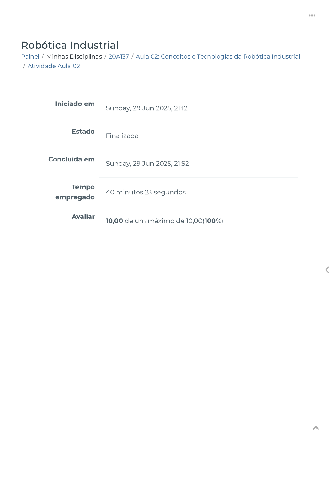 Painel / Minhas Disciplinas / 20A137 / Aula 02: Conceitos e Tecnologias da Robótica Industrial / Atividade Aula 02 Robótica Industrial Iniciado em Sunday, 29 Jun 2025, 21:12 Estado Finalizada Concluída em Sunday, 29 Jun 2025, 21:52 Tempo empregado 40 minutos 23 segundos Avaliar 10,00 de um máximo de 10,00(100%) https://ava.politecnicabr.com.br/my/ https://ava.politecnicabr.com.br/my/ https://ava.politecnicabr.com.br/course/view.php?id=974 https://ava.politecnicabr.com.br/course/view.php?id=974#section-3 https://ava.politecnicabr.com.br/mod/quiz/view.php?id=35085 https://ava.politecnicabr.com.br/ Questão 1 Correto Atingiu 1,00 de 1,00 Os robôs são normalmente classificados conforme o tipo de juntas, ou, mais exatamente, pela configuração das juntas que formam seu sistema de articulação. Esta divisão em classes possibilita categorizar certas características comuns, tais como: Escolha uma opção: a. Tipos de aplicação para cada configuração b. Grau de rigidez mecânica do manipulador c. Influência do sistema de controle sobre a movimentação d. Espaço de trabalho (alcançável/manipulável) e. Todas as alternativas corretas https://ava.politecnicabr.com.br/ Questão 2 Correto Atingiu 1,00 de 1,00 Existe uma nomenclatura específica para cada um dos três eixos de rotação em um punho de robô. Essas juntas são conhecidas por seus termos em inglês, yaw, pitch e roll. Associe corretamente. Isso produz um movimento lateral da mão, similar àquele usado para expressar a ideia de “mais ou menos”. Isso produz um movimento de subida e descida da mão, como quando alguém bate em um instrumento musical de percussão. é uma rotação ao redor de um eixo horizontal que vai de trás para frente ao longo do punho. Isso produz um movimento lateral para a direita e para a esquerda, similar àquele que as pessoas executam quando acenam para alguém. é a rotação ao redor de um eixo vertical que vai da parte superior à parte inferior por meio do punho. é uma rotação ao redor de um eixo horizontal que vai da esquerda para a direita por meio do punho. Roll Pitch Roll Yaw Yaw Pitch https://ava.politecnicabr.com.br/ Questão 3 Correto Atingiu 1,00 de 1,00 O acionamento hidráulico foi o método de acionamento empregado no robô Unimate, portanto, pode ser considerada a primeira forma de acionamento empregada em robôs industriais. Marque a alternativa incorreta quanto as desvantagens. Escolha uma opção: a. Está sujeito a vazamento de óleo e, portanto, é potencialmente poluente b. Requer uma fonte de energia mais cara c. Utiliza válvulas de precisão que ainda apresentam custo elevado d. Pode manter uma elevada força (ou torque) por um longo período de tempo, mesmo quando parado. e. Depende de constante manutenção https://ava.politecnicabr.com.br/ Questão 4 Correto Atingiu 1,00 de 1,00 Esse tipo de acionamento é utilizado em sistemas robóticos simples, que não possuem grandes exigências dinâmicas. Devido à alta compressibilidade do ar, torna-se muito difícil realizar um controle de posição mais preciso. Frequentemente é utilizado em movimentos para o efetuador, como abrir ou fechar garras. Marque a alternativa correta quanto as vantagens. Escolha uma opção: a. Pode manter sua força por longos períodos de tempo sem danos, quando parado. b. Está sujeito a vibrações quando o motor ou cilindro pneumático para. c. Mantém esta força/torque constante para uma grande faixa de variação de velocidade d. Pode manter uma elevada força (ou torque) por um longo período de tempo, mesmo quando parado. e. Todas as alternativas correspondem https://ava.politecnicabr.com.br/ Questão 5 Correto Atingiu 1,00 de 1,00 Marque Verdadeiro ou Falso: ( ) Acionamento elétrico Este tipo de acionamento utiliza motores elétricos, os quais podem ser: motor de corrente contínua, motor de passo ou motor de corrente alternada (brushless). Muitos dos robôs da atualidade são acionados por motores elétricos devido à grande disponibilidade de faixas de torque e velocidade disponíveis no mercado. Além disso, motores elétricos apresentam o melhor nível de controlabilidade perante as demais fontes de acionamento. As vantagens do acionamento elétrico são: Eficiência calculada e controle preciso; Estrutura simples e de fácil manutenção; Fonte de energia de baixo custo. Escolha uma opção: Verdadeiro Falso https://ava.politecnicabr.com.br/ Questão 6 Correto Atingiu 1,00 de 1,00 Marque Verdadeiro ou Falso, quanto aos Robôs. ( ) A estrutura cilíndrica difere da estrutura cartesiana pelo fato de que a primeira junta mecânica provê movimento de rotação, em vez de translação, e por isso esta configuração é denominada RTT. Esta estrutura ainda apresenta características de rigidez mecânica satisfatória, apesar de ter menor resolução de posicionamento na direção horizontal. ( ) Neste tipo de estrutura, os três elos mecânicos de posicionamento deslocam-se de forma rotativa, sendo por isso denominada configuração RRR. Tal estrutura, apesar de ter menor rigidez mecânica do que as anteriores, assim como resolução de posicionamento variável no espaço de trabalho, é a que apresenta maior grau de habilidade para posicionamento e orientação espacial. ( ) O nome SCARA é um acrônimo do termo em inglês Selective Compliance Assembly Robot Arm, pelo fato de que esta estrutura apresenta alta rigidez dinâmica para movimentos horizontais. Ao mesmo tempo, para movimentos verticais, a flexibilidade é reduzida. Escolha uma opção: a. V, V, F. b. F, V, F. c. V, F, V. d. V, V, V. e. F, F, F. https://ava.politecnicabr.com.br/ Questão 7 Correto Atingiu 1,00 de 1,00 As juntas de um robô são elementos de particular interesse na análise de um manipulador robótico. Com relação as juntas, marque a alternativa referente a juntas rotacionais. Escolha uma opção: a. Também chamadas de juntas lineares ou deslizantes, elas se movem em linha reta sem girar. São co