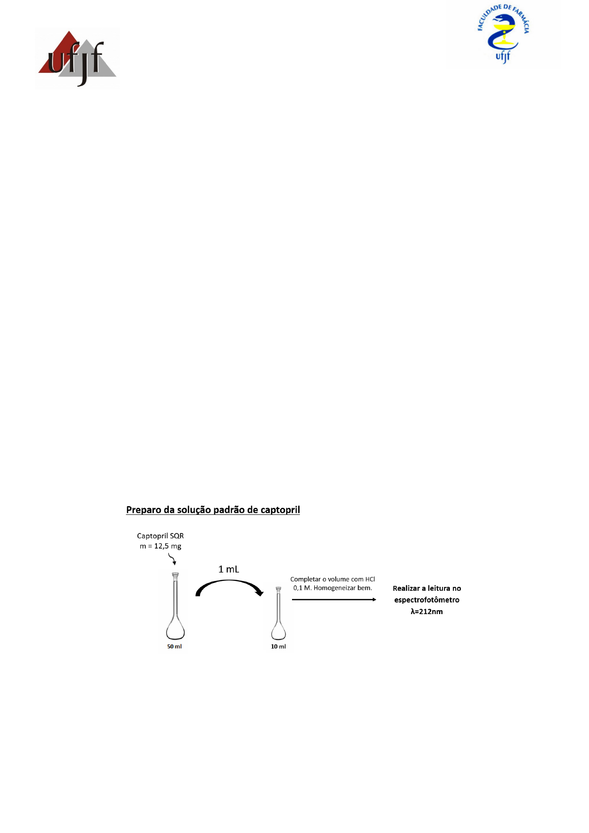 UNIVERSIDADE FEDERAL DE JUIZ DE FORA FACULDADE DE FARMÁCIA LABORATÓRIO DE CONTROLE DE QUALIDADE PRÁTICA: TESTE DE DISSOLUÇÃO DO CAPTOPRIL Elaborado por: Profª Fernanda Maria Pinto Vilela 1. INTRODUÇÃO O teste de dissolução possibilita determinar a quantidade de substância ativa dissolvida no meio de dissolução quando o produto é submetido à ação de aparelhagem específica, sob condições experimentais descritas. 2. OBJETIVOS Realizar ensaios de dissolução com captopril comprimidos preconizado pela Farmacopeia Brasileira 6a edição 3. Procedimentos 3.1 Preparo de soluções Para a realização do teste de dissolução, é necessário que se tenham soluções preparadas, que podem variar de acordo com a finalidade do teste, ou com a especificação da monografia da matéria-prima. Para a realização do processo do teste de dissolução com amostras de comprimidos de captopril serão necessários o preparo de: 900 mL de solução de Ácido Clorídrico (HCl) 0,1M, por cuba; Solução de Captopril SQR na concentração de 0,0025% (p/v), preparada em ácido clorídrico 0,1 M. 3.2 Características do processo MEIO DE DISSOLUÇÃO Utiliza-se o meio de dissolução especificado na monografia do produto, previamente desgaseificado por procedimento conveniente, quando necessário, para evitar a formação de bolhas que possam interferir na velocidade de dissolução a ser medida. Quando o meio de dissolução for solução tampão, o pH deve ser ajustado a ± 0,05 unidades do valor do pH especificado na monografia do produto. TEMPO DE DISSOLUÇÃO Quando um único tempo for especificado na monografia do produto, ele representa o tempo máximo dentro do qual deve ser dissolvida a quantidade mínima, em porcentagem, de substância ativa nela estabelecida. Quando mais de um tempo for especificado na monografia, devem ser tomadas alíquotas, adequadamente medidas, ao final de cada tempo indicado. 3.3 Realização do procedimento Colocar os comprimidos dentro dos cestos secos, observar a não formação de bolhas na superfície das amostras quando em contato com o meio de dissolução (HCl 0,1 M). Iniciar imediatamente a agitação por 20 minutos. Retirar alíquotas dos meios de dissolução respeitando o local de coleta e realizar a leitura em espectrofotômetro em 212 nm. 4. Cálculos Calcular as porcentagens de dissolução do captopril em cada cuba em relação ao valor rotulado. Cálculo da concentração real do padrão de Captopril: C1 = massa real do padrão / volume do balão (50 mL) C1× 1mL de amostra transferida = C2(real) × 10 mL (volume do balão de transferência da amostra) Amostras: Cálculo da quantidade de captopril dissolvido na cuba de 900 ml: Cálculo da porcentagem dissolvida em relação ao valor rotulado: Cuba 1 2 3 4 5 6 % dissolvida 4. Referências ANVISA. Farmacopéia Brasileira, 6ª ed. Brasília, p. 66 e 730.