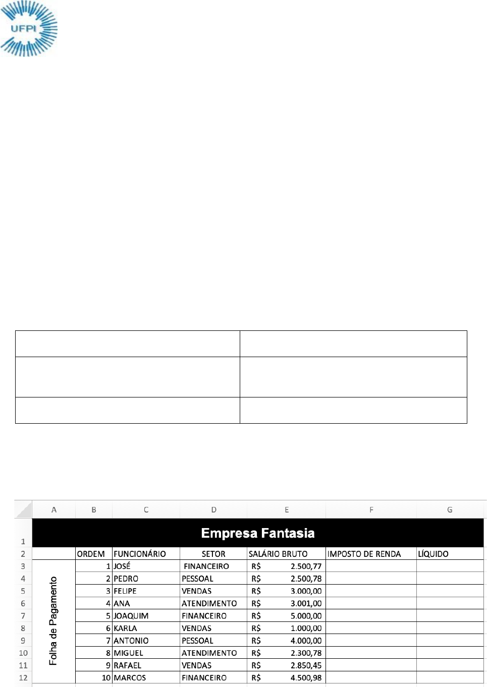 UNIVERSIDADE FEDERAL DO PIAUÍ CAMPUS UNIVERSITÁRIO CINOBELINA ELVAS DISCIPLINA: INFORMÁTICA AVALIAÇÃO (EXCEL) 01) Crie uma planilha conforme modelo do verso dessa página e realize as formatações, fórmulas e funções conforme indicado a seguir: a) Defina a altura da linha 1 para “35” b) Utilize Mesclar para as células A1:G1 c) Para o texto “Empresa Fantasia”, formate a célula para “Centralizar” e “Alinhar ao Meio”. Cor de preenchimento “Preto” e Fonte na cor “Branca” e tamanho “16”. d) Utilize Mesclar para as células A3:A12 e) Alterar a direção do Texto “Folha de Pagamento” para Vertical f) Definir todas as Bordas para a Planilha g) Criar uma Fórmula para a célula “F3” usando a Função Lógica “=SE” para determinar o valor de imposto de renda baseado nas seguintes condições. Isento de pagar imposto Se o salário for de até R$ 2.500,77 15,8% de imposto Salário compreendido entre R$2.500,78 e R$ 3.000,00 25,7% de imposto Valores acima da faixa anterior Obs: Utilize a aba de preenchimento para copiar a fórmula para as células abaixo. (Verifique onde é necessário referencia absoluta e relativa) h) Criar uma fórmula para a célula G3 para calcular o salário líquido do funcionário. 02) Crie na mesma pasta outra planilha conforme abaixo: E em seguida a) Na célula “D3” defina uma fórmula para calcular o IMC. (Observação: O Cálculo do Índice de Massa Corpóreo é dado por: Peso dividido pela altura ao quadrado). Em seguida copie a fórmula para as linhas abaixo. b) Na célula “E3” crie uma fórmula utilizando a função PROCV, de forma que o resultado, seja obtido procurando o valor correspondente, em outra planilha da mesma pasta, conforme abaixo. Defina o nome desta planilha para “Valores”.
