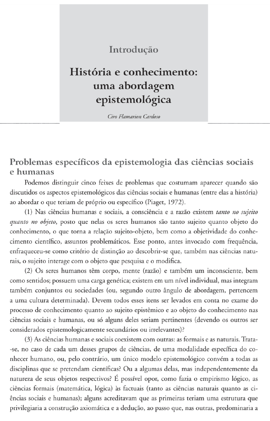 Introdução História e conhecimento: uma abordagem epistemológica CiroFlamarion Cardoso Problemas específicosda epistemologia das ciências sociais ehumanas Podemos distinguir cinco feixes de problemas que costumam aparecerquando são discutidos os aspectos epistemológicos das ciências sociais e humanas (entre elas a história) ao abordaro que teriam de próprioou específico (Piaget, 1972). (1) Nas ciências humanas e sociais, a consciência e a razão existem tanto no sujeito quanto no objeto, posto que nelas os seres humanos são tanto sujeito quanto objeto do conhecimento, o que torna a relação sujeito-objeto, bem como a objetividade do conhe cimento científico, assuntosproblemáticos. Esse ponto, antes invocado com frequência, enfraqueceu-se como critério de distinção ao descobrir-se que, também nas ciências natu rais, o sujeito interage com oobjetoque pesquisa e o modifica. (2) Os seres humanos têm corpo, mente (razão) e também um inconsciente, bem como sentidos; possuem uma carga genética; existem em um nível individual, mas integram também conjuntos ou sociedades (ou,segundo outro ângulo de abordagem, pertencem a uma cultura determinada).Devem todos esses itens ser levados em conta no exame do processo de conhecimento quanto ao sujeito epistêmico e ao objeto do conhecimento nas ciências sociais e humanas, ou só alguns deles seriam pertinentes (devendo os outros ser considerados epistemologicamentesecundáriosou irrelevantes)? (3) Asciências humanas e sociais coexistem com outras: asformaiseas naturais. Trata -se, no caso de cada um desses grupos de ciências, de uma modalidade específica do co nhecer humano, ou, pelo contrário, um único modelo epistemológicoconvém a todas as disciplinas que se pretendam científicas? Ou a algumas delas, mas independentemente da natureza de seus objetos respectivos? E possível opor, como fazia o empirismo lógico, as ciências formais (matemática,lógica) às factuais (tanto as ciências naturais quanto as ci ências sociais e humanas); algunsacreditavamque as primeiras teriam uma estrutura que privilegiaria a construçãoaxiomáticaea dedução, ao passoque, nas outras, predominariaa 2 Novos Domínios da História ELSEVIER indução;todavia, essa opiniãocomeçou a serfortementecriticada já no séculoXIX. Quis-se também separar as ciências em queotipo de objetopermitea experimentação (como fisica, química, biologia e psicologia) daquelasem que isso não ocorre (por exemplo, geologia, sociologia). Nos exemplos dados até agora, em cada conjunto formado segundo a aplicação do critério adotado apareceriam tanto ciências naturais quanto humanas e sociais, mas é igualmente possível defender a noção de que as ciências naturais e as que se ocupam dos homens sáo radicalmentediferentes entre si pelo fato de que, quando o objeto são os seres humanos, é impossível não se considerar questões atinentes ao valor eàsignificação. Essa foi a posição, por exemplo, dos neokantianos alem�cs do séculoXIX e do início do século XX. (4)As ciências sociais ehumanas são homogêneas em suascaracterísticas epistemoló gicas ou existem divergências e hierarquias em seu interior? Foi possível, outrora, transpor a oposição entre o nomotético (o estabelecimentode leis ou regularidades) eo idiográfico (a abordagem só do que éúnico e irrepetível) para dentro do conjunto das ciências que se ocupam com os homens em sociedade,considerando que algumas delas estabelecem leis ou regularidades - economia, demografia, sociologia, enquanto a História está confinada ao único e irrepetível, a singularidades não passíveis de generalizações legaliformes. Ou poder-se-ia afirmar, com Claude Lévi-Strauss, que algumas das ciências que seocupam com o homem colocam-se forade qualquer sociedade particular para se interessarem por todas associedadesesuas diferenças no tempo e no espaço (história, antropologia), ao passoque outras, pelo contrário, situam-seno interior de um único tipo de sociedade,cujas caracte rísticas básicas tomam como ponto de partida e consideram uma referência inescapável para suasanálises (economia).As primeiras estão desprovidasdos meios institucionais de interfe rência no curso das decisões e dos eventos, ao passo que as do segundo tipo possuem canais de atuação social e institucional: planos econômicos; decisões sobre a ação de empresas; psicólogos a serviço do governo, ou de entidadesprivadas, consultadossobrecontratações e eliminando disfunções e atritos (Lévi-Strauss, 1966). (5)Em uma interpretação específica e extrema dos descobrimentos da linguística e da semiótica, bem como das relações entre conhecimento e linguagem, desenvolveu-seum ramo especial de estudosepistemológicosvoltado-em especial no tocanteaos estudos hu manos esociais -paraopapel do discurso, da retórica edos aspectostextuais na construção do conhecimento, o qual pode até apresentaro conhecimento sobre o social ou o que se pretende afirmarsobreo passadohumano como mero "efeito do discurso": textos se opõem a textos ou remetem a outros textos; mas a sociedadeem si, ou a história que os homens fizeram no pasado, seriam objetos inatingíveis de conhecimento em si mesmas. Este tema serátratadono capítulo “Históriae textualidade,neste mesmo volume. As discussões sobre a epistemologiada história inserem-seno campo de indagações mais amplo invocado atéagora,além de apresentarem especificidades que trataremosde examinar. ELSEVIER Introdução |História e conhecimento: uma abordagem epistemológica 3 As modalidades básicas da epistemologia da história Não é possível afirmar que existam apenas três posturas epistemológicas diante da história, mas as modalidades básicas ou principais –de que dependerão as escolhas teóri co-metodológicas centrais –são somente três, que podemos denominar reconstrucionista, construcionista e desconstrucionista (Munslow, 1997, p. 1
