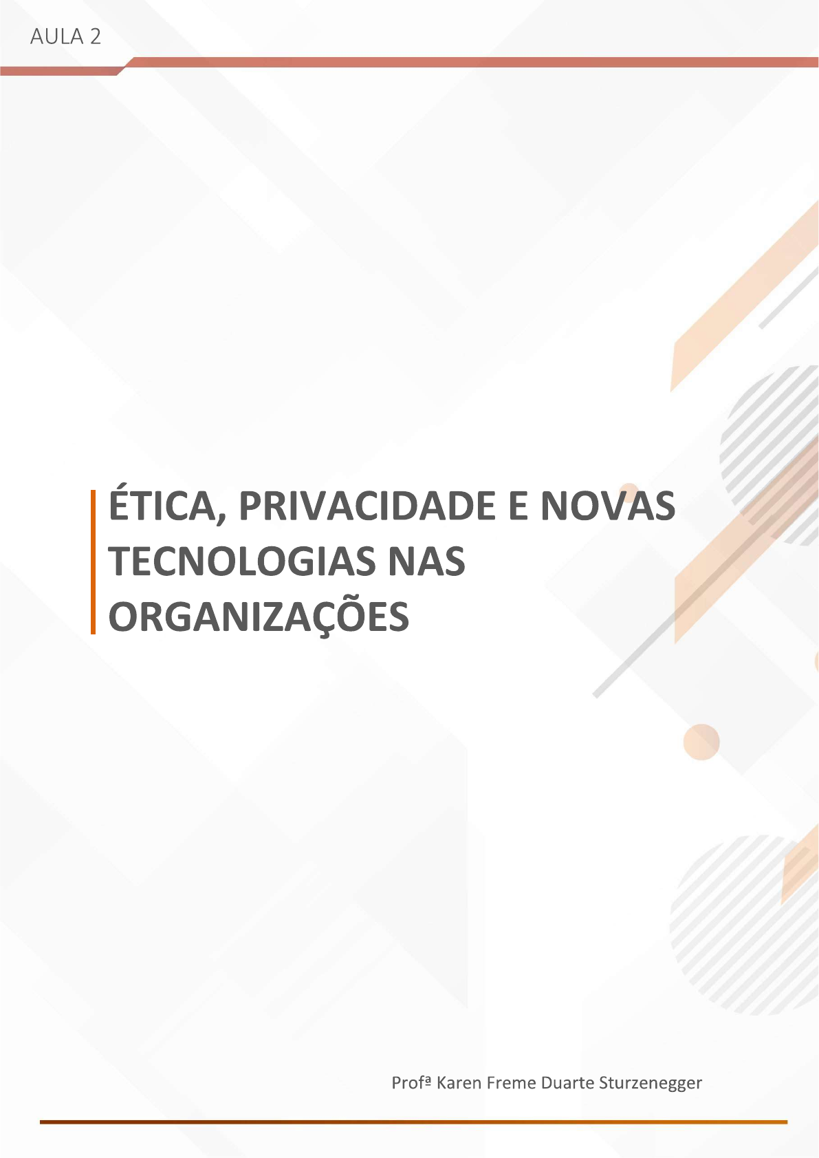 AULA 2 ÉTICA, PRIVACIDADE E NOVAS TECNOLOGIAS NAS ORGANIZAÇÕES Profa Karen Freme Duarte SturzeneggerTEMA 1 PRIVACIDADE DIGITAL O direito digital é uma área do direito que se concentra nos aspectos legais relacionados às tecnologias da informação e comunicação, abordando questões como privacidade, segurança cibernética, proteção de dados, crimes cibernéticos e liberdade de expressão na era digital. Com avanço da tecnologia e a crescente digitalização de nossas vidas, direito digital desempenha um papel crucial na proteção de nossos direitos e liberdades no ambiente digital. Inicialmente, direito à proteção dos dados pessoais teve origem com conceito de privacidade, evoluindo ao longo do tempo. Em 1890, o artigo "The Right to Privacy" estabeleceu a privacidade como um direito de ser deixado só, incluindo a intimidade, a honra e as informações pessoais. Antes disso, a privacidade era vista como um direito de propriedade inviolável, protegido contra intromissões arbitrárias do Estado (Magalhães; Oliveira, 2021). Com o passar do tempo, a privacidade passou a ser reconhecida como um direito fundamental, garantido na Declaração Universal dos Direitos Humanos de 1948 (Magalhães; Oliveira, 2021). Cartas normativas internacionais ampliaram o conceito, incluindo informações pessoais e direito de controle sobre os próprios dados. Os avanços tecnológicos influenciaram essa evolução, incorporando informações pessoais às discussões, devido à necessidade de uso automatizado de dados nas tecnologias e nas relações sociais atuais. Uma das principais áreas de preocupação no direito digital é a privacidade e a proteção de dados pessoais. Com a coleta massiva de informações e a proliferação de dispositivos conectados, nossos dados pessoais estão cada vez mais expostos a riscos de uso indevido, violações de segurança e violações de privacidade. Nesse contexto, leis e regulamentos de proteção de dados, como Regulamento Geral de Proteção de Dados (RGPD) na União Europeia, são fundamentais para garantir que nossas informações sejam tratadas com cuidado e que tenhamos controle sobre como são coletadas, usadas e compartilhadas (Pinheiro, 2008). Outro aspecto importante do direito digital é a segurança cibernética. Com a rápida evolução das ameaças cibernéticas, é essencial ter leis e medidas em vigor para proteger indivíduos, organizações e infraestruturas digitais contra ataques e intrusões. Isso envolve a criação de leis para punir crimes cibernéticos, o estabelecimento de padrões de segurança para empresas e a promoção da conscientização sobre boas práticas de segurança cibernética. Além disso, 2direito digital abrange a liberdade de expressão e acesso à informação na era digital. A internet e as plataformas digitais oferecem uma ampla gama de possibilidades para a livre expressão de ideias, mas também apresentam desafios, como controle de conteúdo, a disseminação de desinformação e a censura on-line. Nesse sentido, direito digital busca encontrar um equilíbrio entre a liberdade de expressão e a proteção contra abusos, incentivando a responsabilidade das plataformas digitais e garantindo que os direitos fundamentais sejam preservados no ambiente on-line (Nissenbaum, 2020). Para Castro (2021), à medida que a tecnologia continua a evoluir, o direito digital enfrenta constantes desafios e demanda uma abordagem ágil e adaptável. A legislação e as regulamentações devem ser atualizadas para lidar com questões emergentes, como inteligência artificial, Internet das Coisas e blockchain, garantindo que os direitos individuais e coletivos sejam protegidos no ambiente digital. No contexto do direito digital e da privacidade digital, essa lógica se manifesta por meio da coleta massiva de dados pessoais e da vigilância digital. Com avanço das tecnologias de monitoramento e a proliferação de dispositivos conectados, nossas atividades on-line e offline são monitoradas e registradas por uma variedade de atores, como governos, empresas e até hackers. Essa constante vigilância digital cria uma sensação de exposição e controle, semelhante à experiência de ser observado no panóptico. As informações coletadas sobre nós, como histórico de navegação, preferências pessoais, localização geográfica e até dados biométricos, são utilizadas para análises, marketing direcionado, tomadas de decisão automatizadas e outros fins. Foucault (2005) explica que a lógica central do panóptico é a vigilância constante e a sensação de estar sendo observado, mesmo quando não há uma autoridade presente de fato. Essa vigilância cria um efeito disciplinar, levando os indivíduos a internalizarem a ideia de que estão sendo constantemente monitorados, que, por sua vez, influencia seu comportamento e os leva a se autorregular. Essa lógica do panóptico no contexto digital levanta questões importantes sobre direito à privacidade e a proteção de dados pessoais. Existem várias dimensões da privacidade digital que devem ser consideradas. A primeira é a privacidade dos dados pessoais. Isso se refere às informações identificáveis individualmente, como nome, endereço, número de 3telefone, informações financeiras e de saúde, entre outras. Os usuários devem ter o direito de decidir quais dados pessoais desejam compartilhar, com quem desejam compartilhá-los e como essas informações serão usadas (Solove, 2004). Além disso, a privacidade digital também se refere à privacidade nas comunicações on-line. Isso envolve a segurança das comunicações eletrônicas, como e-mails, mensagens instantâneas e chamadas de vídeo. As pessoas devem poder se comunicar livremente na Internet sem se preocupar com a interceptação ou vigilância indesejada de suas conversas. Acquisti, John e Loewenstein (2013) informam outro aspecto importante da privacidade digital, que é a privacidade nas atividade