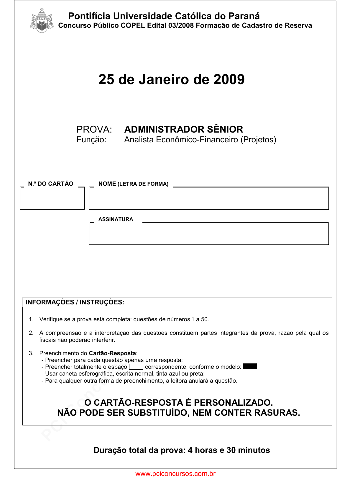 pcimarkpci MDAwMDowMDAwOjAwMDA6MDAwMDowMDAwOmZmZmY6OTU0ZTpiOTcx:U3VuLCAyOSBKdW4gMjAyNSAxNjowMzoxMiAtMDMwMA== www.pciconcursos.com.br Pontifícia Universidade Católica do Paraná Concurso Público COPEL Edital 03/2008 Formação de C adastro de Reserva 25 de Janeiro de 2009 PROVA: ADMINISTRADOR SÊNIOR Função: Analista Econômico-Financeiro (Projetos) INFORMAÇÕES / INSTRUÇÕES: 1. Verifique se a prova está completa: questões de números 1 a 50. 2. A compreensão e a interpretação das questões constituem partes integrantes da prova, razão pela qual os fiscais não poderão interferir. 3. Preenchimento do Cartão-Resposta : - Preencher para cada questão apenas uma resposta; - Preencher totalmente o espaço correspondente, conforme o modelo: - Usar caneta esferográfica, escrita normal, tinta azul ou preta; - Para qualquer outra forma de preenchimento, a leitora anulará a questão. O CARTÃO-RESPOSTA É PERSONALIZADO. NÃO PODE SER SUBSTITUÍDO, NEM CONTER RASURAS. Duração total da prova: 4 horas e 30 minutos N.º DO CARTÃO NOME (LETRA DE FORMA) ASSINATURA www.pciconcursos.com.br pcimarkpci MDAwMDowMDAwOjAwMDA6MDAwMDowMDAwOmZmZmY6OTU0ZTpiOTcx:U3VuLCAyOSBKdW4gMjAyNSAxNjowMzoxMiAtMDMwMA== www.pciconcursos.com.br Pontifícia Universidade Católica do Paraná – Concur so Público COPEL Edital 03/2008 Formação de Cadastr o de Reserva Pág. 1 AADDMMIINNIISSTTRRAADDOORR SSÊÊNNIIOORR FFuunnççããoo:: AAnnaall iissttaa EEccoonnôômmiiccoo--FFiinnaanncceeii rroo ((PPrroojjeettooss)) 01. Sobre a teoria utilitarista, é CORRETO afirmar que: A) Define que o objetivo da organização é maximizar os lucros. B) Acredita que as leis são um reflexo do que a sociedade determina como certo e errado. C) Acredita que todos devem agir de acordo com os ensinamentos religiosos. D) Diz que devemos nos concentrar no resultado de uma decisão, em que todos devem agir de forma a gerar mais benefícios para o maior número de pessoas. E) Foca o objetivo da decisão, ou seja, pesa cada decisão respondendo à seguinte pergunta: “Eu gostaria que qualquer outra pessoa no mundo tomasse essa mesma decisão?” 02. Empresas que buscam a responsabilidade social____________________________________. Assinale a alternativa que preenche CORRETAMENTE o espaço em branco. A) São muito mais rentáveis. B) Não apresentam diferenças significativas na performance com relação às empresas com responsabilidade social inferior. C) São moderadamente mais rentáveis. D) São moderadamente menos rentáveis. E) São muito menos rentáveis. 03. O termo utilizado para descrever o quanto uma empresa está envolvida nos diversos estágios da cadeia de fornecimento do setor é: A) Integração vertical. B) Diversificação não relacionada. C) Integração horizontal. D) Diversificação relacionada. E) Reestruturação. 04. É importante que a definição de negócios de uma organização_______________________________. Assinale a alternativa que preenche CORRETAMENTE o espaço em branco. A) Reprima a escolha estratégica. B) Direcione as escolhas estratégicas que a empresa examina. C) Limite o tempo e os recursos gastos em idéias de negócios para que não sejam desperdiçados. D) Não reprima a escolha estratégica. E) Resulte em uma direção clara para que a empresa não se desvie. 05. Tipicamente, o primeiro passo para criar um senso claro de missão Organizacional é: A) Analisar o ambiente externo. B) Entender totalmente a natureza dos negócios. C) Formular a direção estratégica. D) Formular a declaração de missão. E) Criar uma visão estratégica. 06. O poder dos vários stakeholders sofre impacto dos seguintes poderes, EXCETO: A) Poder econômico. B) Poder político. C) Poder legal. D) Poder da lucratividade. E) Poder contratual. 07. As dimensões da estrutura organizacional que devem ser consideradas para determinar a estrutura de uma organização são as seguintes, EXCETO: A) Grau de centralização. B) Formalização. C) Companheirismo entre os líderes de várias uni- dades. D) Profissionalismo. E) Especialização. 08. Os pontos fracos de uma estrutura matricial são os seguintes, EXCETO: A) Autoridade dupla causando frustração e confusão. B) Visão restrita das metas organizacionais. C) Necessidade de excelentes habilidades inter- pessoais. D) Treinamento adicional exigido pode ser caro. E) Necessidade de muito esforço para manter o equilíbrio de poder. 09. A filosofia baseada na minimização do número de defeitos encontrado em uma empresa de produção ou serviços é _________________. Assinale a alternativa que preenche CORRETAMENTE o espaço em branco. A) Gestão da Qualidade Total (GQT). B) Produção de alta Qualidade. C) Teoria de Deming. D) Princípio de Juran. E) Six Sigma. www.pciconcursos.com.br pcimarkpci MDAwMDowMDAwOjAwMDA6MDAwMDowMDAwOmZmZmY6OTU0ZTpiOTcx:U3VuLCAyOSBKdW4gMjAyNSAxNjowMzoxMiAtMDMwMA== www.pciconcursos.com.br Pontifícia Universidade Católica do Paraná – Concur so Público COPEL Edital 03/2008 Formação de Cadastr o de Reserva Pág. 2 10. Em 2008, a empresa MDR inaugurará uma nova unidade em Londrina. Por isso, a gerente de Administração de Pessoas criou três Equipes de Trabalho com atribuições específicas: equipe 1 - Recrutamento e Seleção; Equipe 2 - Treinamento e Desenvolvimento; Equipe 3 - Administração de Salários. Ao criar essas equipes, a gerente acreditava em que não haveria problemas no desempenho das tarefas, pois a Equipe 1 seria responsável pela contratação de funcionários, a Equipe 2 teria a responsabilidade de treinar os novos empregados e à Equipe 3 definir a política salarial. Entretanto, dois meses antes da inauguração, a situação era a seguinte: a remuneração fixada pela Equipe 3 tornava inviável a contratação de pessoas competentes pela Equipe 1. Assim, a demora na contratação de pessoas estava inviabilizando a atuação da Equipe 2 em função da escassez de tempo para treinar os novos empregados. Ao
