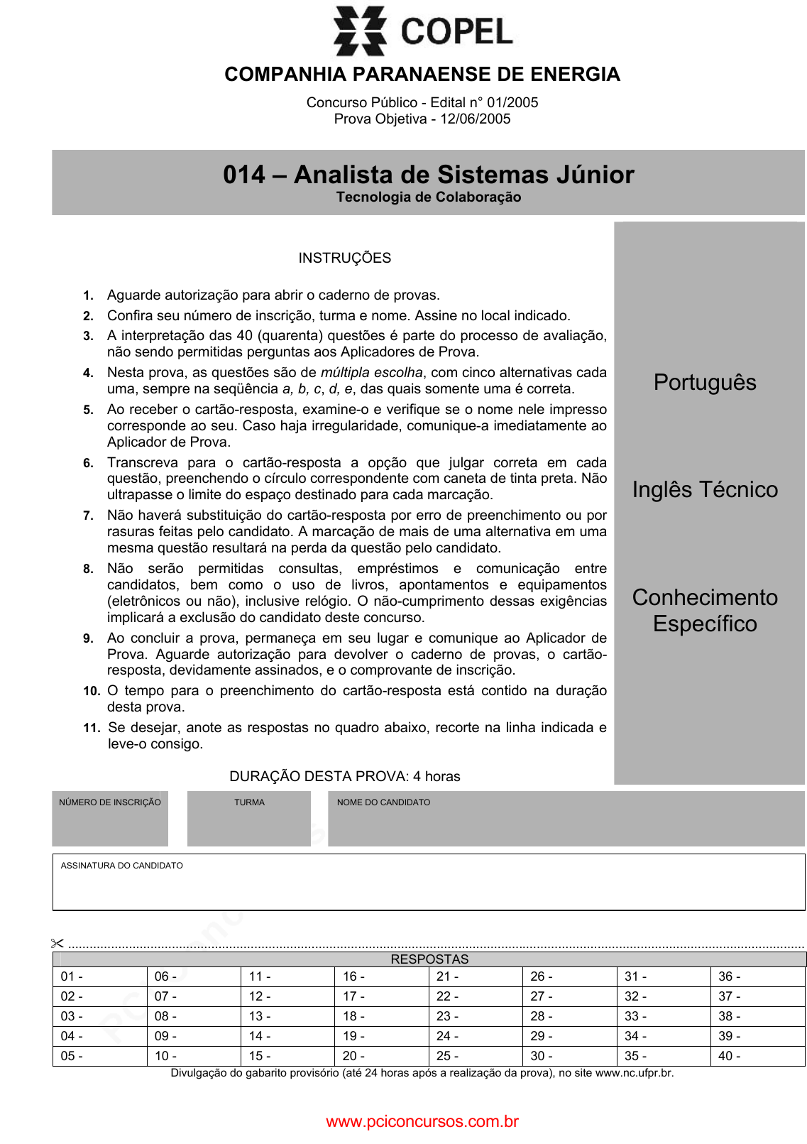 pcimarkpci MDAwMDowMDAwOjAwMDA6MDAwMDowMDAwOmZmZmY6OTU0ZTpiOTcx:U3VuLCAyOSBKdW4gMjAyNSAxNjowMzowNiAtMDMwMA== www.pciconcursos.com.br COMPANHIA PARANAENSE DE ENERGIA Concurso Público - Edital n° 01/2005 Prova Objetiva - 12/06/2005 014 – Analista de Sistemas Júnior Tecnologia de Colaboração INSTRUÇÕES 1. Aguarde autorização para abrir o caderno de provas. 2. Confira seu número de inscrição, turma e nome. Assine no local indicado. 3. A interpretação das 40 (quarenta) questões é parte do processo de avaliação, não sendo permitidas perguntas aos Aplicadores de Prova. 4. Nesta prova, as questões são de múltipla escolha, com cinco alternativas cada uma, sempre na seqüência a, b, c, d, e, das quais somente uma é correta. 5. Ao receber o cartão-resposta, examine-o e verifique se o nome nele impresso corresponde ao seu. Caso haja irregularidade, comunique-a imediatamente ao Aplicador de Prova. 6. Transcreva para o cartão-resposta a opção que julgar correta em cada questão, preenchendo o círculo correspondente com caneta de tinta preta. Não ultrapasse o limite do espaço destinado para cada marcação. 7. Não haverá substituição do cartão-resposta por erro de preenchimento ou por rasuras feitas pelo candidato. A marcação de mais de uma alternativa em uma mesma questão resultará na perda da questão pelo candidato. 8. Não serão permitidas consultas, empréstimos e comunicação entre candidatos, bem como o uso de livros, apontamentos e equipamentos (eletrônicos ou não), inclusive relógio. O não-cumprimento dessas exigências implicará a exclusão do candidato deste concurso. 9. Ao concluir a prova, permaneça em seu lugar e comunique ao Aplicador de Prova. Aguarde autorização para devolver o caderno de provas, o cartão- resposta, devidamente assinados, e o comprovante de inscrição. 10. O tempo para o preenchimento do cartão-resposta está contido na duração desta prova. 11. Se desejar, anote as respostas no quadro abaixo, recorte na linha indicada e leve-o consigo. DURAÇÃO DESTA PROVA: 4 horas Português Inglês Técnico Conhecimento Específico NÚMERO DE INSCRIÇÃO TURMA NOME DO CANDIDATO ASSINATURA DO CANDIDATO .............................................................................................................................................................................................................. RESPOSTAS 01 - 06 - 11 - 16 - 21 - 26 - 31 - 36 - 02 - 07 - 12 - 17 - 22 - 27 - 32 - 37 - 03 - 08 - 13 - 18 - 23 - 28 - 33 - 38 - 04 - 09 - 14 - 19 - 24 - 29 - 34 - 39 - 05 - 10 - 15 - 20 - 25 - 30 - 35 - 40 - Divulgação do gabarito provisório (até 24 horas após a realização da prova), no site www.nc.ufpr.br. www.pciconcursos.com.br pcimarkpci MDAwMDowMDAwOjAwMDA6MDAwMDowMDAwOmZmZmY6OTU0ZTpiOTcx:U3VuLCAyOSBKdW4gMjAyNSAxNjowMzowNiAtMDMwMA== www.pciconcursos.com.brwww.pciconcursos.com.br pcimarkpci MDAwMDowMDAwOjAwMDA6MDAwMDowMDAwOmZmZmY6OTU0ZTpiOTcx:U3VuLCAyOSBKdW4gMjAyNSAxNjowMzowNiAtMDMwMA== www.pciconcursos.com.br 3 PORTUGUÊS O texto a seguir é referência para as questões 01, 02 e 03. O preço da liberdade Da vasta correspondência que recebi por conta de minha coluna anterior, surgiu um apoio intrigante. Alguns leitores me escreveram para dizer que concordavam com a minha tese de que cabe ao indivíduo escolher seus próprios caminhos, exercendo a autonomia. Iam ainda mais longe e afirmavam que cada qual é livre para drogar-se, se for essa a sua opção, mas que os dependentes não deveriam ter direito de onerar o Estado com despesas médicas geradas pelo vício. Certos missivistas avançaram ainda mais e sugeriram que o poder público não deveria atender a alcoólatras, fumantes nem mesmo a pacientes de Aids. Reconheço que há lógica por trás dessa argumentação, mas não posso concordar com ela. Acredito que, se uma dada sociedade renuncia a todos os princípios de solidariedade, como parece fazer aquela que nega tratamento médico para quem precisa, ela perde sua razão de ser. Não vivemos em grupo apenas porque calhou de sermos vizinhos. O gregarismo é elemento constitutivo da própria humanidade. Foi por viver lado a lado com outros de sua espécie, ajudando-os e sendo por eles ajudado, que nossos ancestrais puderam dispor de uma dieta rica em proteínas animais que foi fundamental para que seu cérebro se desenvolvesse da forma que o fez, tornando-os mais espertos que outros grupos de primatas. Não estou, com isso, afirmando que o homem seja naturalmente bom, como o fez Rousseau, nem que a solidariedade seja a mais humana das virtudes. Muito pelo contrário, nossa espécie é violenta, agressiva e freqüentemente bastante estúpida. Mesmo assim, soube fazer alianças com base no altruísmo recíproco que a beneficiaram, levando-a a assenhorear-se do planeta. Agora que vivemos num ambiente bem menos hostil do que o de nossos antepassados, temos ainda menos razões para abandonar o princípio da aliança de ajuda mútua. Voltando ao caso concreto, acho que o poder público deve prestar auxílio médico e previdenciário a quem dele necessite, independentemente das escolhas individuais que possam ter levado a pessoa ao estado de precisão. É verdade que a esmagadora maioria dos dependentes químicos fez em algum momento uma opção consciente não pelo vício, é claro, mas por correr o risco de tornar-se dependente. Não era um cálculo absurdo. A maior parte dos que tomam um copo de uísque, fumam um baseado ou cheiram uma carreira de cocaína não se viciam. Já a minoria que o faz padece de uma doença. A partir de um certo momento, instala-se a dependência. Aí as escolhas feitas pelo indivíduo já são "menos livres". Os centros de recompensa do cérebro se voltam inteiramente para a droga. Sem ela, nenhuma atividade proporciona prazer. O mundo se torna sombrio e sem graça. Para que volte a ser um lugar tolerável, é preciso conseguir uma dose da substância, pela qual o dependente fará qu