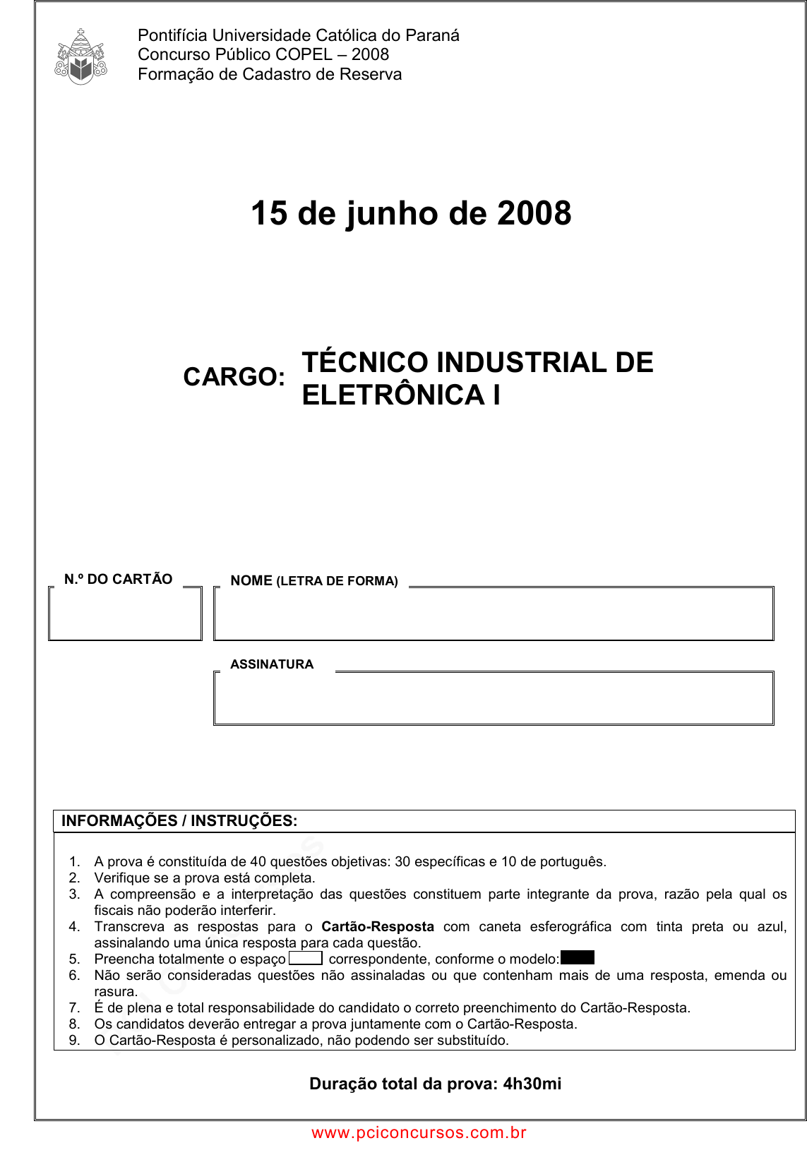 pcimarkpci MDAwMDowMDAwOjAwMDA6MDAwMDowMDAwOmZmZmY6OTU0ZTpiOTcx:U3VuLCAyOSBKdW4gMjAyNSAxNjowMTo0MCAtMDMwMA== www.pciconcursos.com.br Pontifícia Universidade Católica do Paraná Concurso Público COPEL – 2008 Formação de Cadastro de Reserva 15 de junho de 2008 CARGO: TÉCNICO INDUSTRIAL DE ELETRÔNICA I INFORMAÇÕES / INSTRUÇÕES: 1. A prova é constituída de 40 questões objetivas: 30 específicas e 10 de português. 2. Verifique se a prova está completa. 3. A compreensão e a interpretação das questões constituem parte integrante da prova, razão pela qual os fiscais não poderão interferir. 4. Transcreva as respostas para o Cartão-Resposta com caneta esferográfica com tinta preta ou azul, assinalando uma única resposta para cada questão. 5. Preencha totalmente o espaço correspondente, conforme o modelo: 6. Não serão consideradas questões não assinaladas ou que contenham mais de uma resposta, emenda ou rasura. 7. É de plena e total responsabilidade do candidato o correto preenchimento do Cartão-Resposta. 8. Os candidatos deverão entregar a prova juntamente com o Cartão-Resposta. 9. O Cartão-Resposta é personalizado, não podendo ser substituído. Duração total da prova: 4h30mi N.º DO CARTÃO NOME (LETRA DE FORMA) ASSINATURA www.pciconcursos.com.br pcimarkpci MDAwMDowMDAwOjAwMDA6MDAwMDowMDAwOmZmZmY6OTU0ZTpiOTcx:U3VuLCAyOSBKdW4gMjAyNSAxNjowMTo0MCAtMDMwMA== www.pciconcursos.com.br Pontifícia Universidade Católica do Paraná – Concurso Público COPEL – 2008 Formação de Cadastro de Reserva Pág. 1 EESSPPEECCÍÍFFIICCAA 01. Qual é a órbita de valência de um átomo? I- A primeira órbita é a órbita de valência. II- A última órbita é a órbita de valência. III- A órbita de valência é a que possui maior energia. Está CORRETA ou estão CORRETAS: A) Somente I. B) Somente II. C) Somente III. D) I e III. E) II e III. 02. Qual é a energia em Joules (J) necessária para mover uma carga de 6 C (Coulombs) por meio de uma diferença de potencial de 6 V? A) 18 J B) 36 J C) 1,8 J D) 3,6 J E) 1 J 03. Se 48 eV de energia são necessários para mover uma carga por meio de uma diferença de potencial (ddp) de 12 V, determine a carga envolvida? A) 576 C B) 36 C C) 4 C D) 60 C E) 6 C 04. Varistores, centelhadores, transzorb são componentes usados em proteção de circuitos eletrônicos. Ge- ralmente são instalados em cartões condicionadores de sinais. Identifique em que tipos de circuitos são utilizados. A) Condicionadores de tensão e corrente para usinas e subestações. B) Centrais telefônicas e cabos de dados. C) Câmeras de TV para vigilância. D) Equipamentos eletrônicos para subestações e usinas. E) Todas estão corretas. 05. Dado o circuito, identifique a condição de funcionamento das lâmpadas. L1, L2, L3, L4 e L5 são lâmpadas de 6 VCC. A) L1, L3-apagadas, L2-acende com sobrecarga, L4, L5 acendem. B) L1, L3-acendem, L2-apagada, L4, L5-acendem com sobrecarga C) L1, L3-acendem com sobrecarga, L2-apagada, L4, L5-acendem. D) L1, L3-acendem com sobrecarga, L2, L4, L5- apagadas. E) L1, L3-acendem, L2, L4, L5-apagadas. 06. Dado o transistor NPN em uma configuração emissor comum, calcular a corrente de base IB, dado IC = 25mA e β (beta) = 200. I- Valor de IB = 125 x 10-3 A II- Valor de IB = 1,25 x 10-4 A III- Valor de IB = 12,5 mA IV- Valor de IB = 1,25 mA Está CORRETA ou estão CORRETAS: A) Somente I. B) Somente II. C) II e IV. D) II e III. E) I e II. www.pciconcursos.com.br pcimarkpci MDAwMDowMDAwOjAwMDA6MDAwMDowMDAwOmZmZmY6OTU0ZTpiOTcx:U3VuLCAyOSBKdW4gMjAyNSAxNjowMTo0MCAtMDMwMA== www.pciconcursos.com.br Pontifícia Universidade Católica do Paraná – Concurso Público COPEL – 2008 Formação de Cadastro de Reserva Pág. 2 07. Complete as lacunas da questão: Transistores são utilizados em três configurações distintas que são Base Comum, Coletor Comum e Emissor Comum. A mais utilizada é a configuração _________________ que é aplicada em circuitos reguladores de tensão, chaveadores e amplificadores. As principais características desta configuração são: ganho de corrente _________, ganho de tensão _________, impedância de entrada _________ e impedância de saída _________. Os espaços foram assim preenchidos: A) Coletor Comum – alto – alto – média – baixa. B) Emissor Comum – alto – alto – média – alta. C) Base Comum – médio – alto – média – baixa. D) Emissor Comum – alto – alto – média – baixa. E) Coletor Comum – baixo – baixo – média – baixa. 08. Sobre transistores BJT, assinale as afirmações CORRETAS: I- O parâmetro β define o ganho de corrente de um transistor bipolar em configuração emissor comum. II- Para um transistor de Germânio NPN estar ligado, a tensão VBE deve ser aproximadamente 0,7 V. III- O valor de β aumenta com a temperatura. IV- A corrente de emissor de um transistor NPN é dada pela soma das correntes IB e IC, logo, IE = IC + IB. V- Ponto Quiescente de um transistor é a denominação para seu ponto de operação. Estão CORRETAS: A) Apenas as afirmativas I, II, III. B) Apenas as afirmativas I, II e V. C) Apenas as afirmativas I, III, IV e V. D) Apenas as afirmativas III e V. E) As afirmativas I, II, III, IV e V. 09. Sobre acoplamento, oscilação e filtragem, pode-se afirmar: I- Capacitores de acoplamento são utilizados para filtrar níveis DC na entrada de circuitos eletrônicos. II- Quando a impedância equivalente na entrada do receptor é predominantemente resistiva, a amplitude da tensão de ruído captada através de acoplamento capacitivo é proporcional à fre- qüência do ruído, à amplitude do ruído, à resistência equivalente na entrada do receptor e à capacitância equivalente de acoplamento. III- Quando a impedância equivalente na entrada do receptor é predominante capacitiva, a amplitude da tensão de ruído captada pelo acoplamento ca- pacitivo é independente da freqüência do ruído. Está CORRETA ou estão CORRETAS: A) A