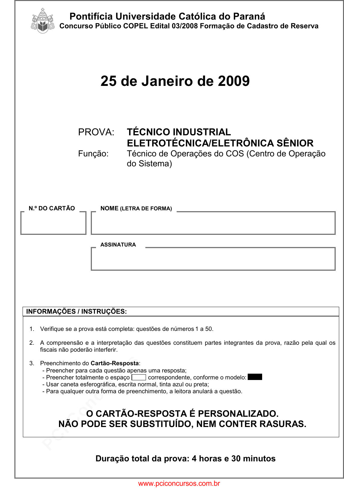 pcimarkpci MDAwMDowMDAwOjAwMDA6MDAwMDowMDAwOmZmZmY6OTU0ZTpiOTcx:U3VuLCAyOSBKdW4gMjAyNSAxNjowMDo0MiAtMDMwMA== www.pciconcursos.com.br Pontifícia Universidade Católica do Paraná Concurso Público COPEL Edital 03/2008 Formação de C adastro de Reserva 25 de Janeiro de 2009 PROVA: TÉCNICO INDUSTRIAL ELETROTÉCNICA/ELETRÔNICA SÊNIOR Função: Técnico de Operações do COS (Centro de Operação do Sistema) INFORMAÇÕES / INSTRUÇÕES: 1. Verifique se a prova está completa: questões de números 1 a 50. 2. A compreensão e a interpretação das questões constituem partes integrantes da prova, razão pela qual os fiscais não poderão interferir. 3. Preenchimento do Cartão-Resposta : - Preencher para cada questão apenas uma resposta; - Preencher totalmente o espaço correspondente, conforme o modelo: - Usar caneta esferográfica, escrita normal, tinta azul ou preta; - Para qualquer outra forma de preenchimento, a leitora anulará a questão. O CARTÃO-RESPOSTA É PERSONALIZADO. NÃO PODE SER SUBSTITUÍDO, NEM CONTER RASURAS. Duração total da prova: 4 horas e 30 minutos N.º DO CARTÃO NOME (LETRA DE FORMA) ASSINATURA www.pciconcursos.com.br pcimarkpci MDAwMDowMDAwOjAwMDA6MDAwMDowMDAwOmZmZmY6OTU0ZTpiOTcx:U3VuLCAyOSBKdW4gMjAyNSAxNjowMDo0MiAtMDMwMA== www.pciconcursos.com.br Pontifícia Universidade Católica do Paraná – Concurso Público COPEL – 2008 Formação de Cadastro de Reserva Pág. 1 TTÉÉCCNNIICCOO IINNDDUUSSTTRRIIAALL DDEE EELLEETTRROOTTÉÉCCNNIICCAA--EELLEETTRRÔÔNNIICCAA SSÊÊNNIIOORR FFuunnççããoo:: TTééccnniiccoo ddee OOppeerraaççããoo ddoo CCOOSS 01. Um transformador fabricado para operar em 60Hz foi levado a trabalhar em um sistema nas mesmas condições, porém a única diferença é a sua freqüência de trabalho, que passou de 60 Hz para 400 Hz. Quais são as conseqüências dada a alteração da freqüência? I. As perdas no ferro por Foucault permanecem inalteradas, pois B2f2 permanece inalterado. II. As perdas no ferro para freqüências mais elevadas são menores, e o rendimento do transformador aumenta. III. O transformador não opera nessa freqüência. IV. As perdas no ferro aumentam com o aumento da freqüência. Está (ão) CORRETA (S): A) A afirmativa I. B) A afirmativa II. C) As afirmativas I e IV. D) As afirmativas II e III. E) As afirmativas I e II. 02. A associação de dois transformadores em paralelo exige alguns cuidados quanto a sua qualidade e A suas características, que devem ser observadas: I. Mesma relação de transformação. II. Mesmo defasamento angular. III. Mesmo módulo da impedância e módulo do ângulo percentual. Está (ão) CORRETA (S): A) As afirmativas I e II. B) As afirmativas II e III. C) As afirmativas I e III. D) As afirmativas I, II e III. E) Nenhuma das alternativas. 03. Sobre motores de indução, pode-se afirmar: I. Motores de indução de pólos sombreados possuem usualmente pólos salientes com uma porção de cada pólo envolvida por uma espira de cobre em curto-circuito, chamada bobina de arraste. II. Motores de fase dividida apresentam dois enrolamentos no estator: o enrolamento principal e o enrolamento auxiliar. Como em um motor bifásico, os eixos deste enrolamento estão defasados entre si em 90º elétricos no espaço. III. Motores com partida a capacitor também são motores de fase dividida, mas o deslocamento da fase no tempo entre as duas correntes é obtido por meio de um capacitor em paralelo com o enrolamento auxiliar. IV. Motores de histerese possuem rotor cilíndrico, liso em aço magneticamente duro, sem enrolamentos nem dentes. Ele é colocado no interior de um estator ranhurado, tendo enrolamentos distri- buídos, projetados para produzir, tão aproxima- damente quanto possível, uma distribuição de flu- xo senoidal espacial. O motor de histerese é ine- rentemente silencioso e produz rotação suave em sua carga. Estão CORRETAS: A) Todas as afirmativas. B) As afirmativas II, III e IV. C) As afirmativas I, III e IV. D) As afirmativas I, II e IV. E) As afirmativas I, II e III. 04. Calcular o valor do capacitor de indução monofásico de 2,5 kW, 120 V e 60 Hz, cuja reatância capacitiva é de -15ohms. A) 200 µF. B) 120 µF. C) 177 µF. D) 277 µF. E) 127 µF. 05. Com referência a geradores síncronos, podemos con- siderar que: I. De modo geral o termo “enrolamento de armadura” diz respeito a um enrolamento ou grupo de enrolamentos que conduz corrente alternada. II. Em máquinas CA, síncronas ou as de indução, os enrolamentos de armadura alojam-se no estator. III. Tipicamente, as máquinas síncronas apresentam um segundo enrolamento, ou conjunto de enrolamentos, que conduz corrente contínua e que é usado para produzir o fluxo principal de operação da máquina. IV. O enrolamento de campo em uma máquina CC encontra-se no rotor, ao passo que em uma máquina síncrona encontra-se no estator. Estão CORRETAS: A) Todas as afirmativas. B) As afirmativas II, III e IV. C) As afirmativas I, III e IV. D) As afirmativas I, II e III. E) As afirmativas I e III. www.pciconcursos.com.br pcimarkpci MDAwMDowMDAwOjAwMDA6MDAwMDowMDAwOmZmZmY6OTU0ZTpiOTcx:U3VuLCAyOSBKdW4gMjAyNSAxNjowMDo0MiAtMDMwMA== www.pciconcursos.com.br Pontifícia Universidade Católica do Paraná – Concurso Público COPEL – 2008 Formação de Cadastro de Reserva Pág. 2 06. Os motores síncronos são uma nova opção para melhorar o fator de potência dentro das indústrias, onde a exigência sobre esse o fator de potência deve ser maior que 0,85. Assim, pode se afirmar que: I. Os motores síncronos, por possuírem fonte de excitação separada, podem ser sobreexcitados, fazendo com que a corrente avance em relação à tensão, melhorando o fator de potência de uma instalação. II. Um gerador síncrono de uma usina pode atuar como um motor síncrono a vazio e corrigir o fator de potência de linhas de distribuição. III. Em um motor síncrono, a carga pode ser aplicada mesmo sem ter atingido a velocidade de 