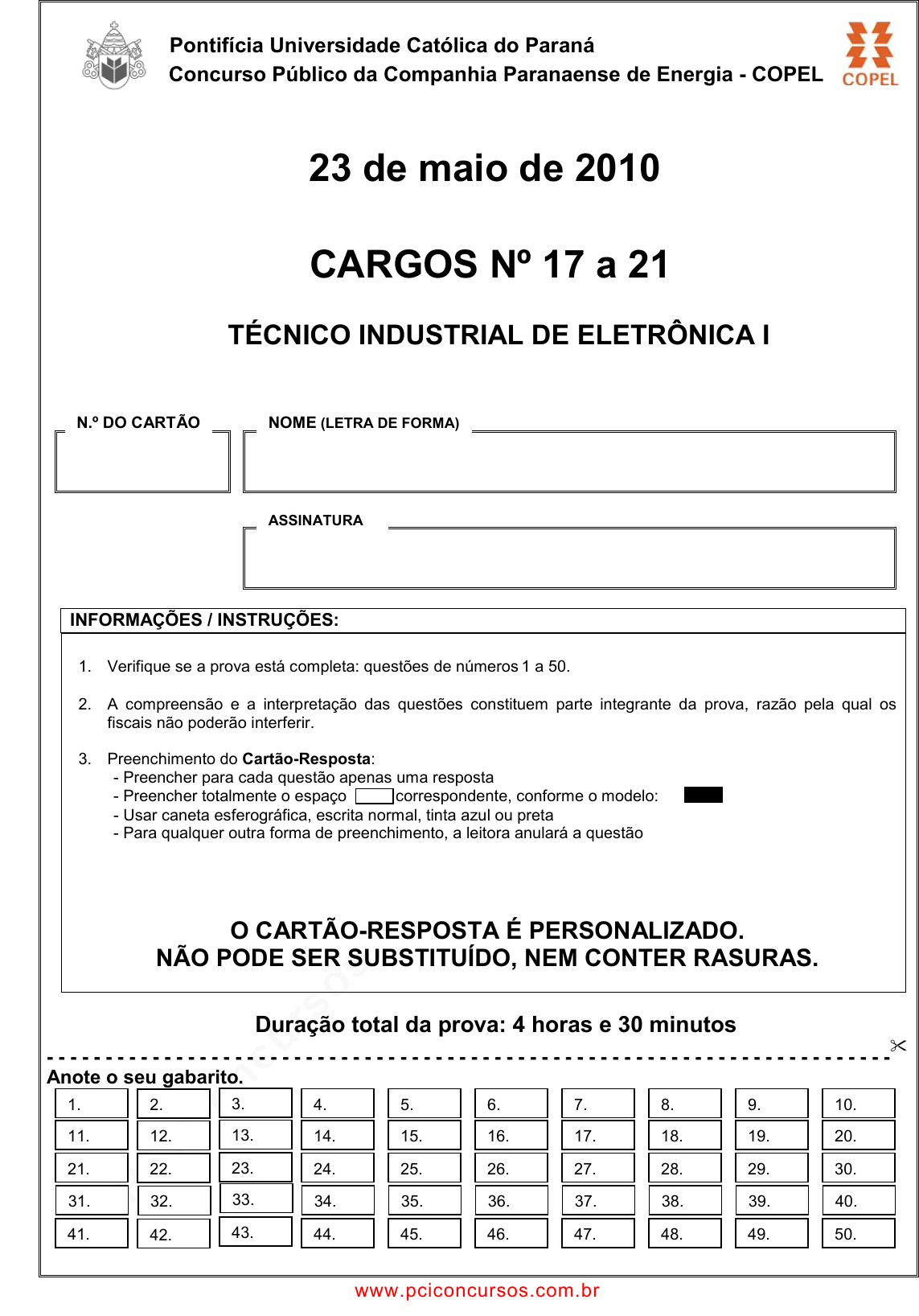 pcimarkpci MDAwMDowMDAwOjAwMDA6MDAwMDowMDAwOmZmZmY6MjYyZTo4ZWZk:U3VuLCAyOSBKdW4gMjAyNSAxNToyMTozOCAtMDMwMA== www.pciconcursos.com.br Pontifícia Universidade Católica do Paraná Concurso Público da Companhia Paranaense de Energia - COPEL 23 de maio de 2010 CARGOS Nº 17 a 21 TÉCNICO INDUSTRIAL DE ELETRÔNICA I INFORMAÇÕES / INSTRUÇÕES: 1. Verifique se a prova está completa: questões de números 1 a 50. 2. A compreensão e a interpretação das questões constituem parte integrante da prova, razão pela qual os fiscais não poderão interferir. 3. Preenchimento do Cartão-Resposta : - Preencher para cada questão apenas uma resposta - Preencher totalmente o espaço correspondente, conforme o modelo: - Usar caneta esferográfica, escrita normal, tinta azul ou preta - Para qualquer outra forma de preenchimento, a leitora anulará a questão O CARTÃO-RESPOSTA É PERSONALIZADO. NÃO PODE SER SUBSTITUÍDO, NEM CONTER RASURAS. Duração total da prova: 4 horas e 30 minutos � - - - - - - - - - - - - - - - - - - - - - - - - - - - - - - - - - - - - - - - - - - - - - - - - - - - - - - - - - - - - - - - - - - - - - - - - Anote o seu gabarito. N.º DO CARTÃO NOME (LETRA DE FORMA) ASSINATURA 1. 2. 3. 4. 5. 6. 7. 8. 9. 10. 31. 32. 33. 34. 35. 36. 37. 38. 39. 40. 11. 12. 13. 14. 15. 16. 17. 18. 19. 20. 21. 22. 23. 24. 25. 26. 27. 28. 29. 30. 41. 42. 43. 44. 45. 46. 47. 48. 49. 50. www.pciconcursos.com.br pcimarkpci MDAwMDowMDAwOjAwMDA6MDAwMDowMDAwOmZmZmY6MjYyZTo4ZWZk:U3VuLCAyOSBKdW4gMjAyNSAxNToyMTozOCAtMDMwMA== www.pciconcursos.com.br Pontifícia Universidade Católica do Paraná – Concurso Público COPEL/2010 Pág. 1 www.pciconcursos.com.br pcimarkpci MDAwMDowMDAwOjAwMDA6MDAwMDowMDAwOmZmZmY6MjYyZTo4ZWZk:U3VuLCAyOSBKdW4gMjAyNSAxNToyMTozOCAtMDMwMA== www.pciconcursos.com.br Pontifícia Universidade Católica do Paraná – Concurso Público COPEL/2010 Pág. 2 CCOONNHHEECCIIMMEENNTTOOSS EESSPPEECCÍÍFFIICCOOSS 1. Considerando uma tensão VF = 50V, frequência de 60Hz, e corrente I = 100mA, determine o valor do capacitor e do resistor no circuito apresentado para que o resistor tenha sobre ele ¼ da tensão de alimentação do circuito. A) C = 708µF e R = 1,25Ω. B) C = 7,08µF e R = 125Ω. C) C = 7,08nF e R = 125KΩ. D) C = 7,08mF e R = 1.25KΩ. E) C = 70,8µF e R = 12,5Ω. 2. Considerando o circuito apresentado, determine a resistência equivalente vista pela bateria e a corrente total do circuito. A) Req = 5KΩ e ITotal = 6mA. B) Req = 20KΩ e ITotal = 1,5mA. C) Req = 2,31KΩ e ITotal = 13mA. D) Req = 2,31KΩ e ITotal = 1,3mA. E) Req = 2,5KΩ e ITotal = 12mA. 3. Com base no circuito apresentado e considerando que o capacitor (ideal sem perdas) está descarregado e a chave S é fechada em t = 0s, como se comporta o led após um período de tempo de 5τ (tau, constante de carga de um circuito RC série)? A) O led inicia apagado e vai acendendo à medida que o capacitor descarrega. B) O led pisca e permanece aceso, indicando que o capacitor está carregado. C) O led pisca e permanece apagado, indicando que o capacitor está carregado. D) O led impede que o capacitor se carregue neste período de tempo igual a 5τ. E) O led acende e vai apagando à medida que o capacitor descarrega. 4. Considerando um resistor R = 10KΩ, determine que tipo de filtro este circuito implementa e qual deve ser o capacitor para que a frequência de corte seja de 1KHz. A) O circuito é um filtro passa baixa e o capacitor deve ser de aproximadamente 16nF. B) O circuito é um filtro passa alta e o capacitor deve ser de aproximadamente 16nF. C) O circuito é um filtro passa alta e o capacitor deve ser de aproximadamente 160nF. D) O circuito é um filtro passa baixa e o capacitor deve ser de aproximadamente 160nF. E) O circuito é um filtro passa alta e o capacitor deve ser de aproximadamente 1,6nF. www.pciconcursos.com.br pcimarkpci MDAwMDowMDAwOjAwMDA6MDAwMDowMDAwOmZmZmY6MjYyZTo4ZWZk:U3VuLCAyOSBKdW4gMjAyNSAxNToyMTozOCAtMDMwMA== www.pciconcursos.com.br Pontifícia Universidade Católica do Paraná – Concurso Público COPEL/2010 Pág. 3 5. Um material intrínseco é eletricamente estável. Ao adicionarmos impurezas do tipo pentavalentes ou trivalentes transformamos esse material em: A) Um material semicondutor do tipo P e em um material semicondutor do tipo N, respectivamente. B) Um material semicondutor do tipo N e em um material semicondutor do tipo P respectivamente. C) Um material isolante e em um material condutor, respectivamente. D) Um material condutor e em um material isolante, respectivamente. E) Um diodo e em um transistor, respectivamente. 6. Avaliando o sinal de saída para cada circuito apresentado, é CORRETO afirmar que: Circuito 1 Circuito 2 A) Os circuitos são ceifadores, mas não equivalentes. B) Os circuitos não são ceifadores nem equivalentes. C) Os circuitos não são ceifadores, mas são equivalentes. D) Os circuitos são ceifadores, porém a equivalência deles ocorre somente no semiciclo negativo. E) Os circuitos são ceifadores e equivalentes. 7. Para o circuito a seguir, considerando os diodos em 2° aproximação com Vj = 0,7V, calcule a corrente ID 3 e o valor da tensão VD3 indicada. A) ID3 = 0A; VD3=1,4V. B) ID3 = 6,9mA; VD3=-0,7. C) ID3 = 0A; VD3=0,7V. D) ID3 = 6,9mA; VD3=1,4V. E) ID3 = 0A; VD3=-1,4V. 8. Uma fonte de alimentação linear isolada galvanicamente da rede é composta normalmente por: A) Um circuito de retificação, uma etapa de filtragem, um transformador e um circuito de controle de pulsos e dispositivos de regulagem e proteção. B) Um capacitor de isolação, um circuito de retificação, uma etapa de filtragem e um dispositivo de regulagem e proteção. C) Um transformador, um circuito de retificação, uma etapa de filtragem e dispositivos de regulagem e proteção. D) Um circuito de retificação, um transformador e um dispositivo de regulagem e proteção. E) Um transformador, uma etapa de filtragem e dispositivos de regulagem e proteção. www.pciconcursos.com