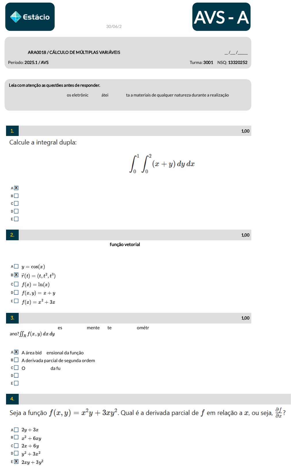 7063770131 AVS - A 30/06/2025 20:09 Nome: Matrícula: ____________________ Disciplina: ARA0018 / CÁLCULO DE MÚLTIPLAS VARIÁVEIS Data: ___ /___ /______ Período: 2025.1 / AVS Turma: 3001 NSQ: 13320252 Leia com atenção as questões antes de responder. É proibido o uso de equipamentos eletrônicos portáteis e consulta a materiais de qualquer natureza durante a realização da prova. Boa prova. 1. _______ de 1,00 3 2 5 1 4 2. _______ de 1,00 Qual das alternativas representa corretamente uma função vetorial? y = cos(x) →r(t) = (t, t2, t3) f(x) = ln(x) f(x, y) = x + y f(x) = x2 + 3x 3. _______ de 1,00 Qual das alternativas representa corretamente a interpretação geométrica de uma integral dupla onde R é uma região no plano? A área bidimensional da função A derivada parcial de segunda ordem O valor médio da função f(x, y) O comprimento de uma curva no espaço O volume da função ∬ R f(x, y) dx dy 4. _______ d 2y + 3x x2 + 6xy 2x + 6y y2 + 3x2 2xy + 3y2 5. 10/3 2 8/3 7/3 5/2 6. _______ de 1,00 As integrais triplas são aplicadas a funções de várias variáveis. Tendo em vista seus conhecimentos adquiridos, encontre a seguinte integral tripla. 10/11 3/4 5/3 1/8 9/8 7. _______ de 1,00 Sobre o conjunto domínio das funções de várias variáveis, assinale o item incorreto: Argumento do logaritmo tem de ser positivo Argumento da raiz quadrada tem de ser não negativo O numerador da fração não pode ser zero. Não existe divisão por zero O domínio de f é o subconjunto de Rn para os quais a função está definida 8. _______ de 1,00 As integrais de linhas de campos conservativos são representados através de equações: Série de Fourier Vetoriais Hiperbólicas Complexas Diferenciais 9. _ Determinar a área da região limitada pelas curvas y = x3 e y=4x no 1º Quadrante. Ou seja, resolva : A = 3/2 A = 6 A = 5/4 A = 4 A = 3/4 10. _______ de 1,00 Campus: FLORESTA Prova Impressa em 30/06/2025 por JOICE MARTINHA RODRIGUES Ref.: 7063770131 Prova Montada em 24/06/2025 Determine a abscissa do centro de massa de um sólido na forma de um cubo, definido por , com densidade volumétrica de massa 0 ≤ x ≤ 1, 0 ≤ y ≤ 1 e 0 ≤ z ≤ 1 δ(x, y, z) = 6(x2 + y2 + z2) 13 24 9 24 11 24 7 24 5 24