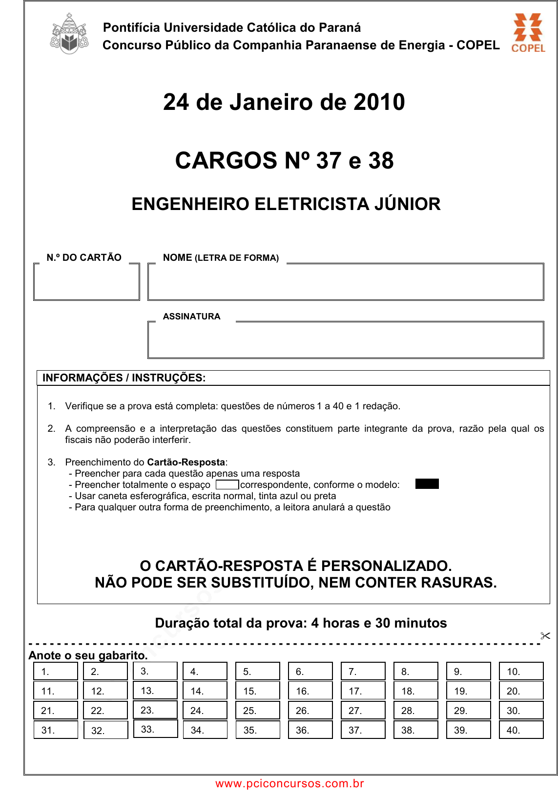 Pontifícia Universidade Católica do Paraná – Concurso Público COPEL/2010